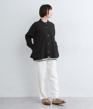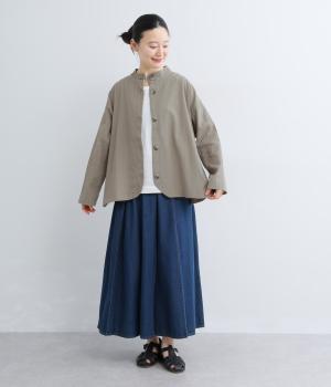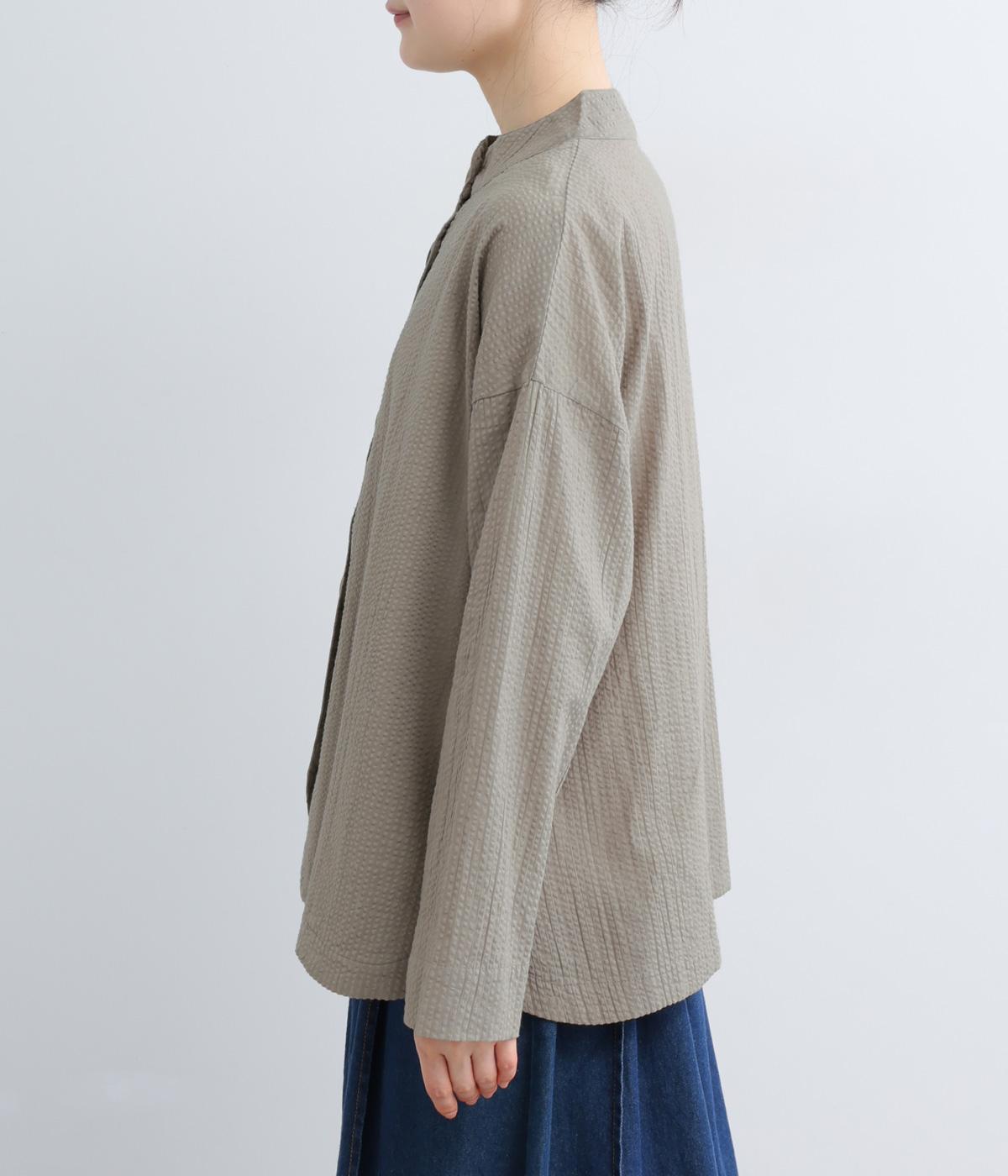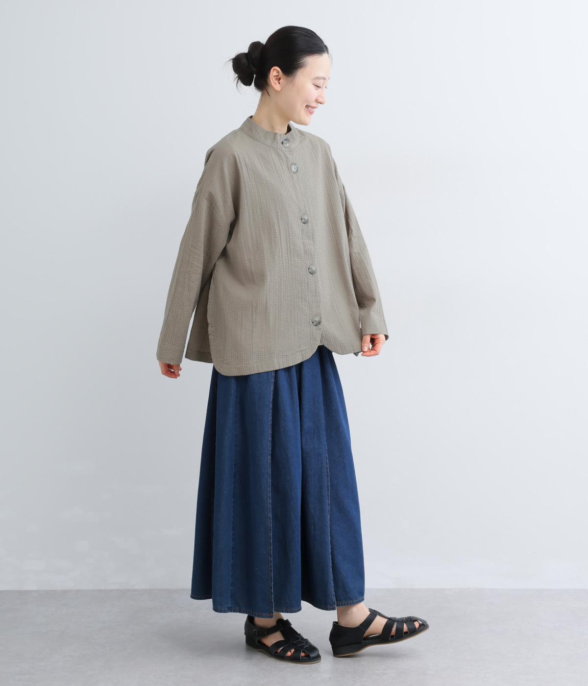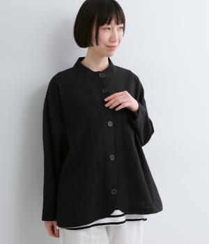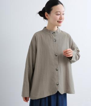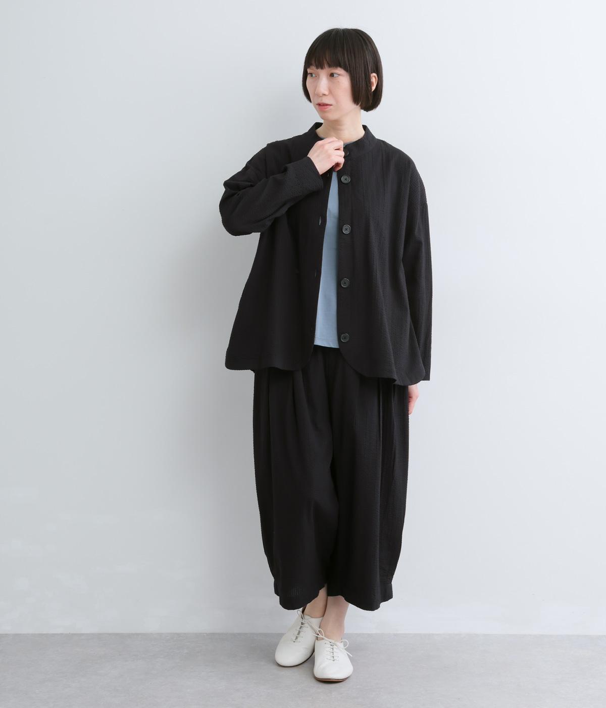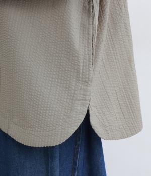無地ながらも表情豊かなサッカー生地を活かし、ゆったり涼しく羽織れるジャケットを仕立てました。ラウンドさせたヘムラインは、ボタンを留めても、ラフにあけてもさまになります。ちょこんと立ち上がったスタンドカラーで顔まわりにポイントを。
