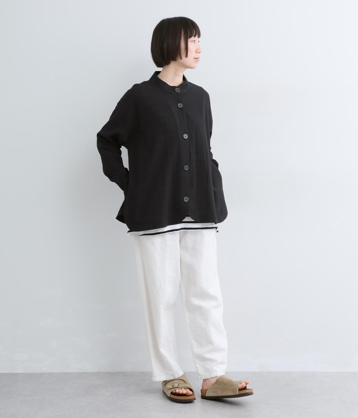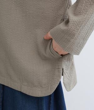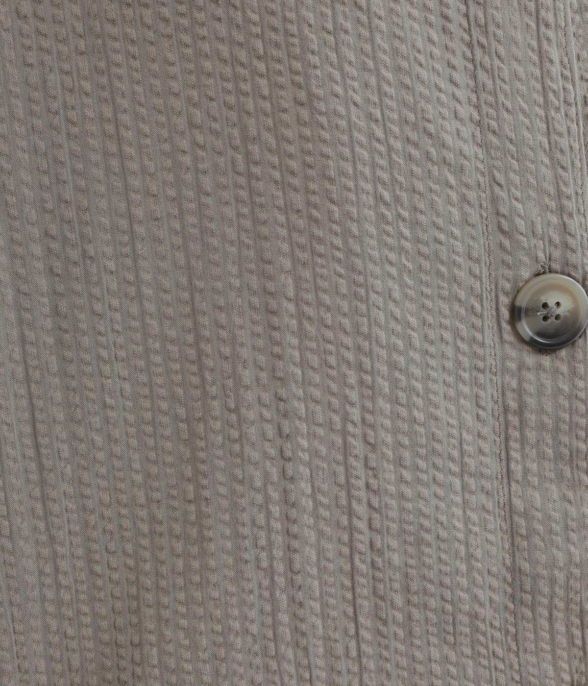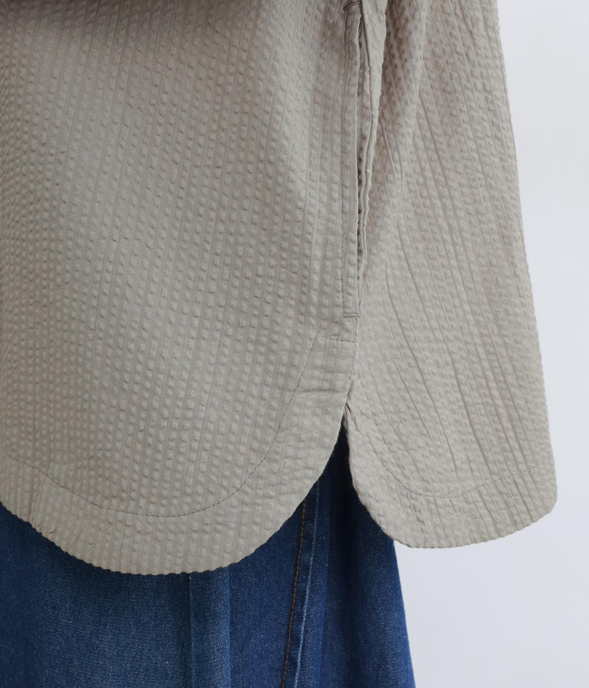 凹凸感が特徴的で、肌へのまとわりが少なく通気性に優れたコットンサッカー生地を使用。薄手で涼しく着用でき、シワも気になりにくいのでデイリー使いに最適。