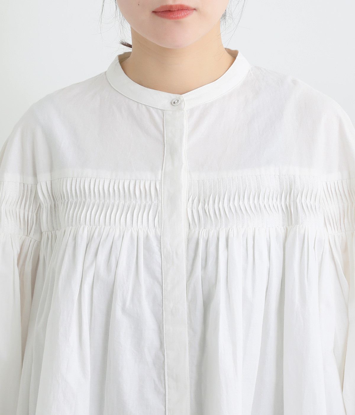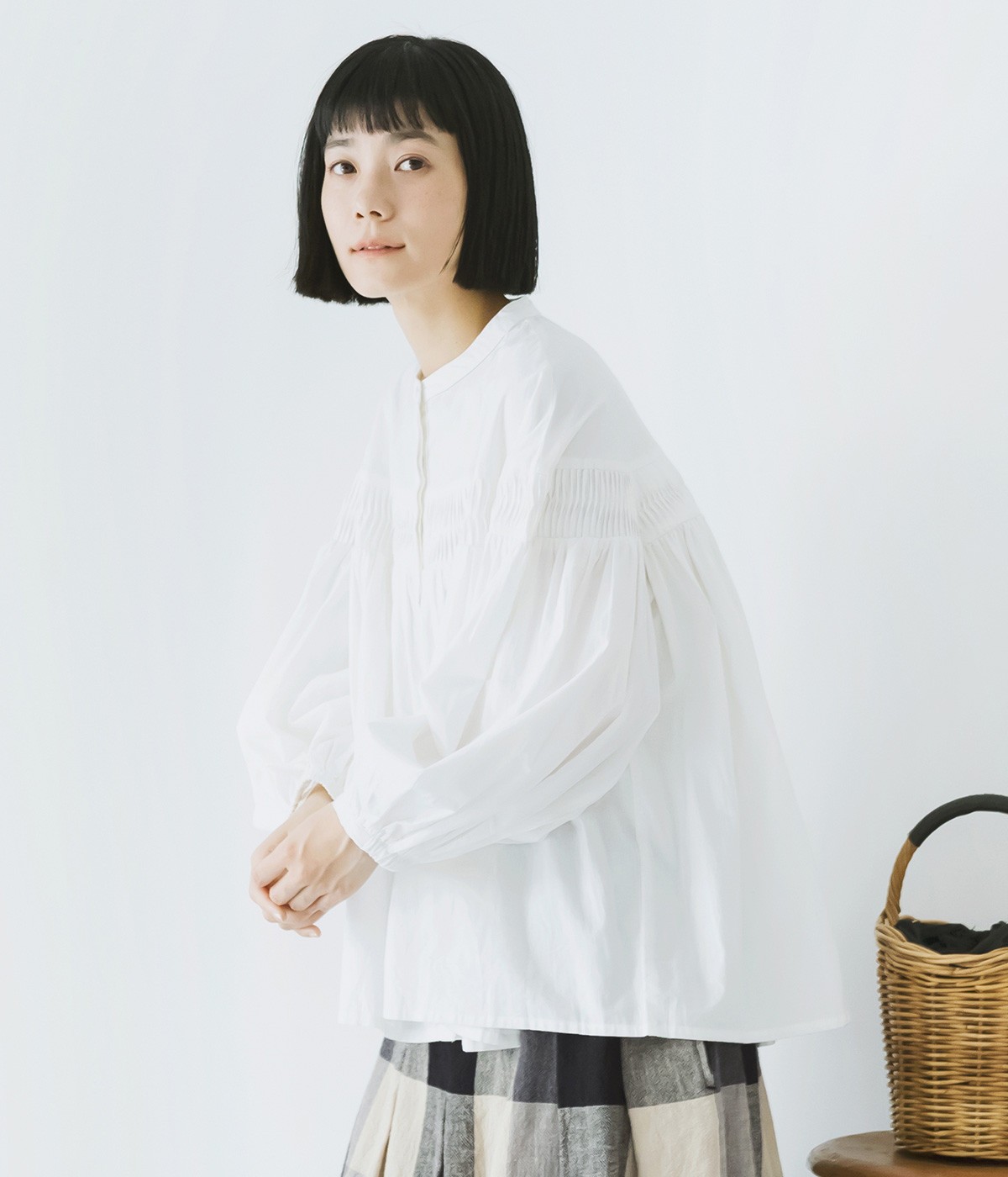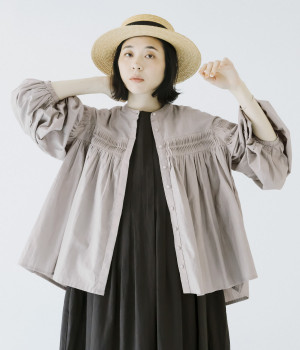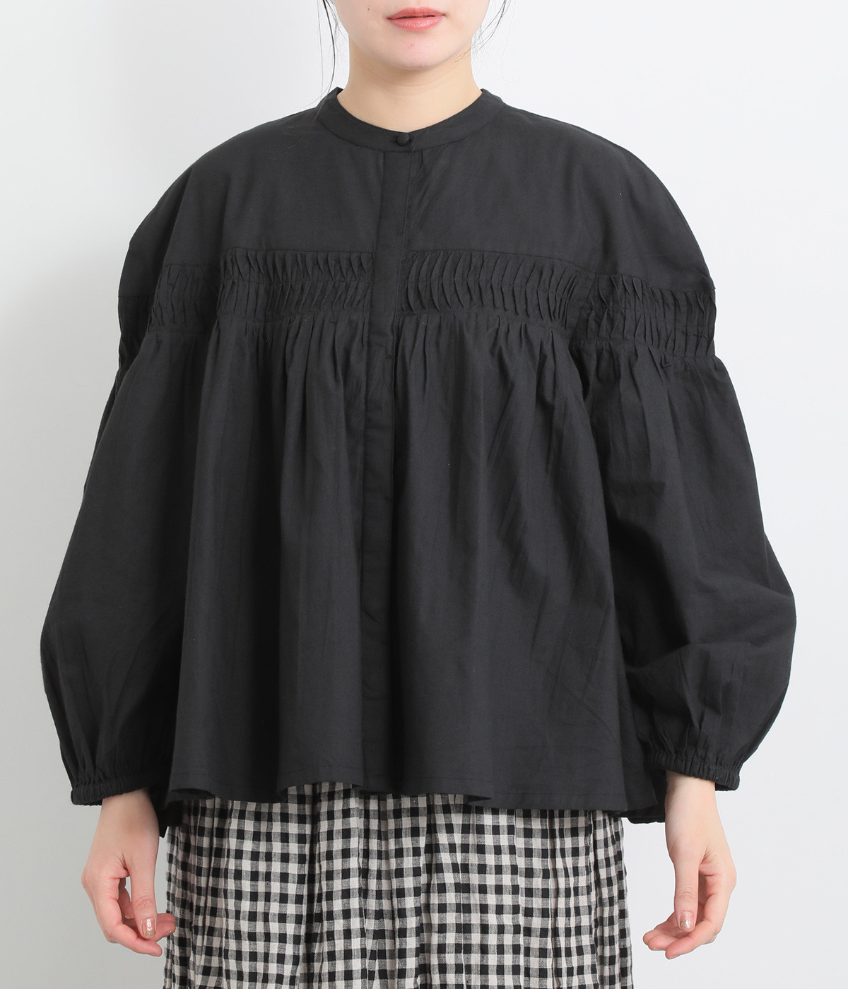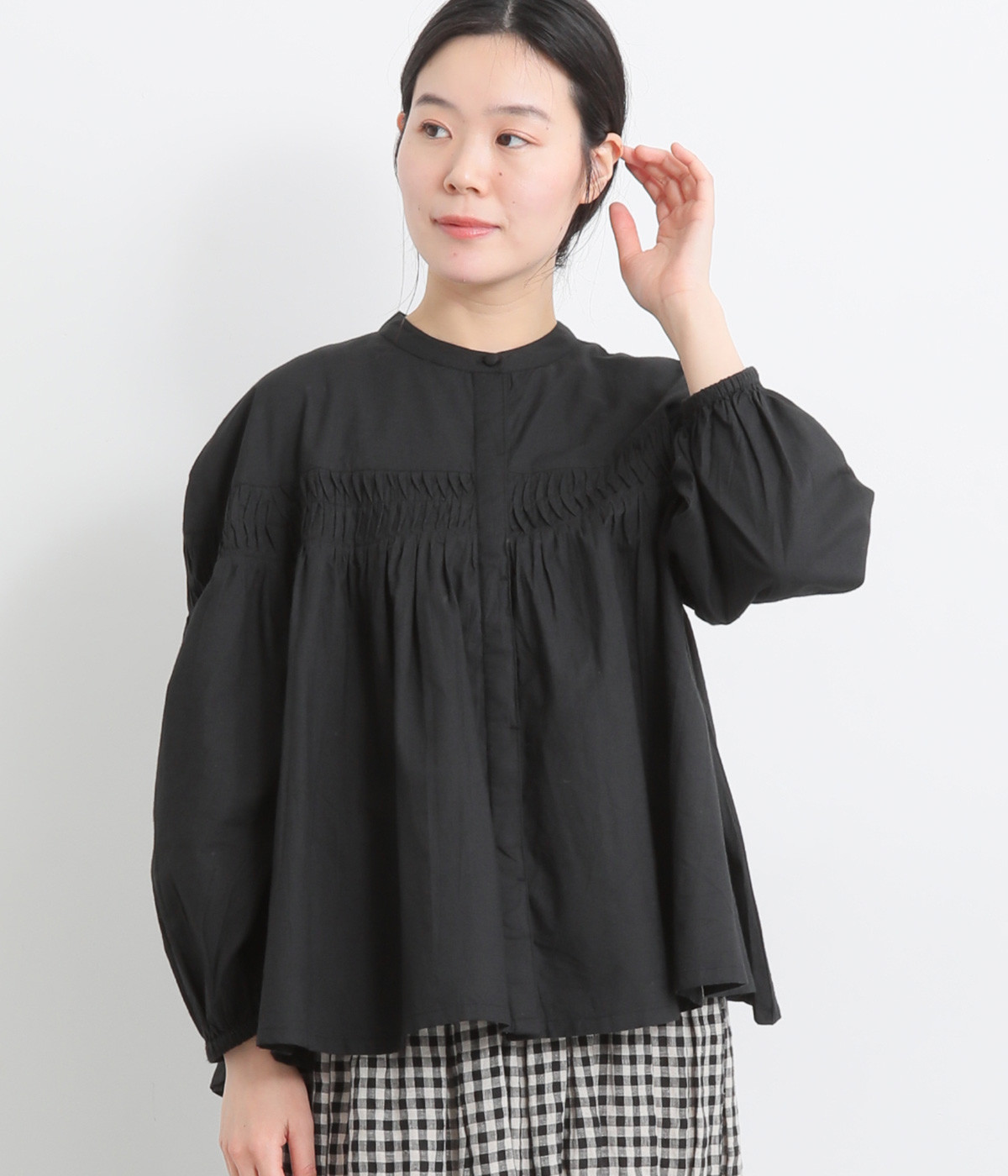 ツイストした立体感のある胸元のピンタックが個性的。ふっくらとした袖は袖口がギャザーゴムになっていて、袖丈の変化も楽しめます。可愛らしいフレアシルエットなのでリラクシーな着心地に。第二ボタン以下は比翼仕立てですっきりとさせました。