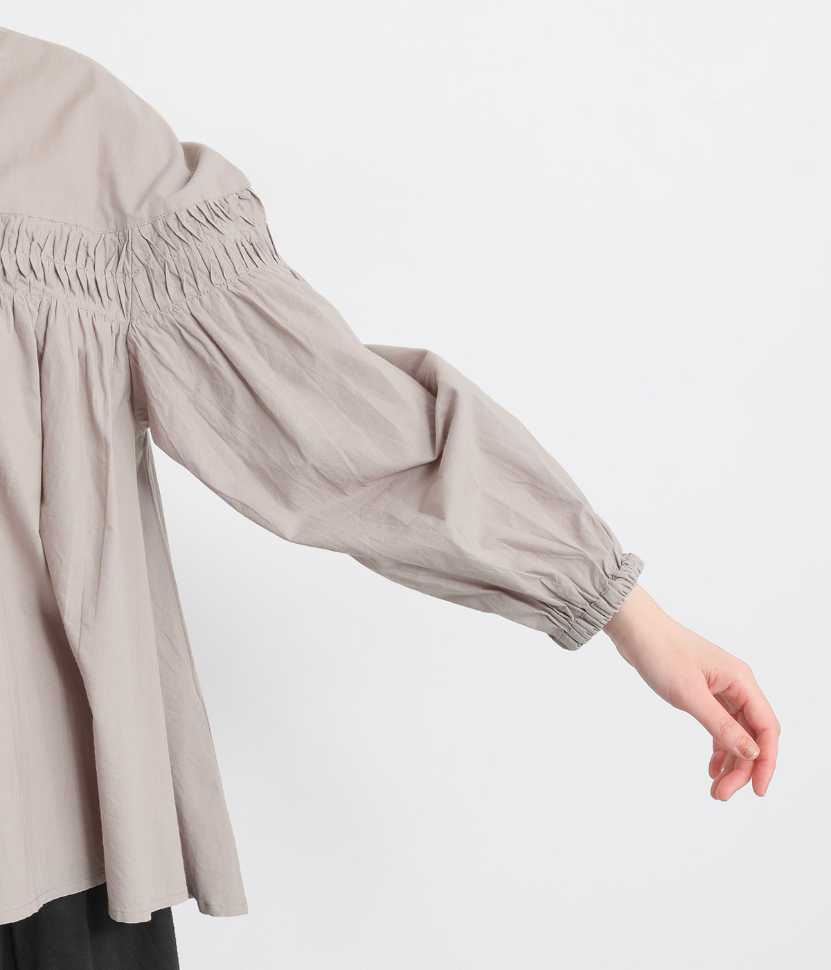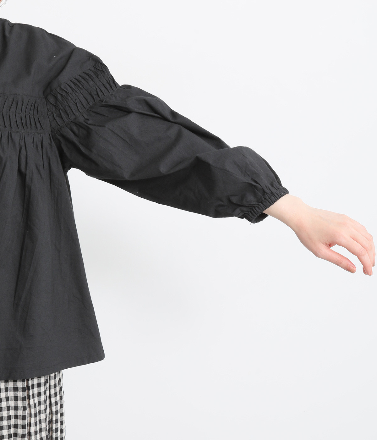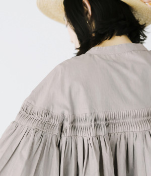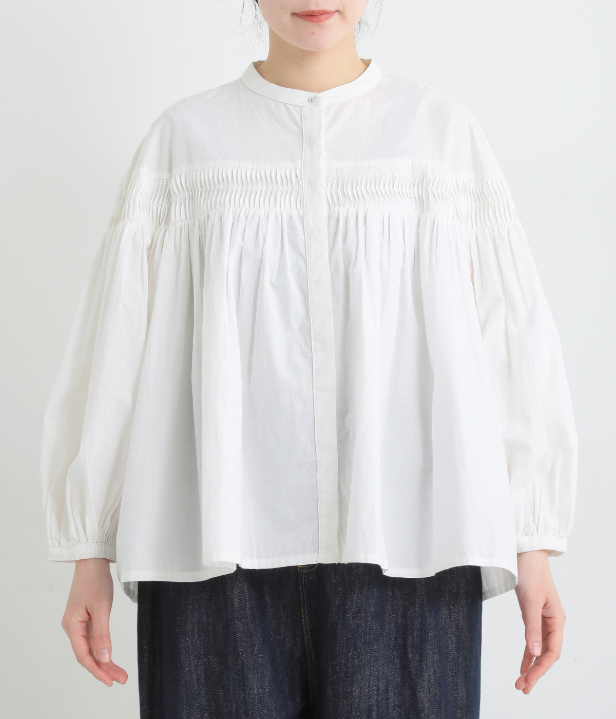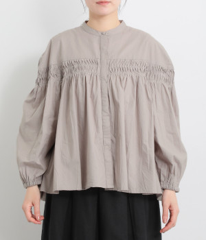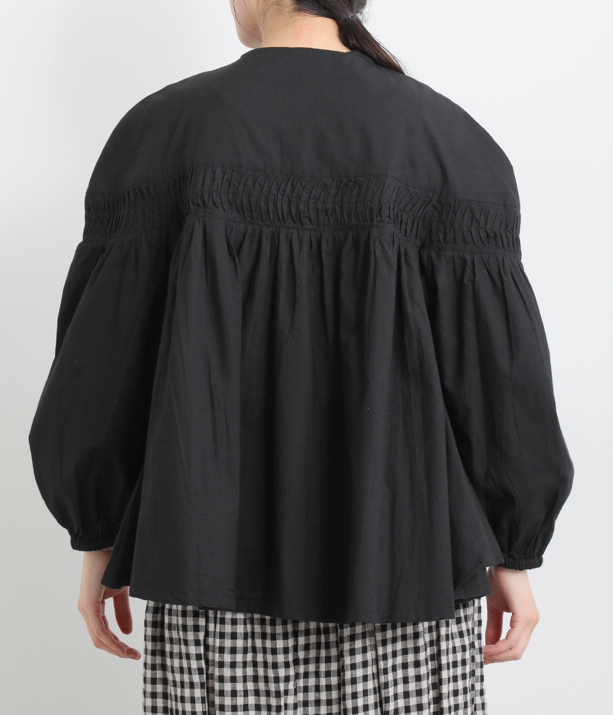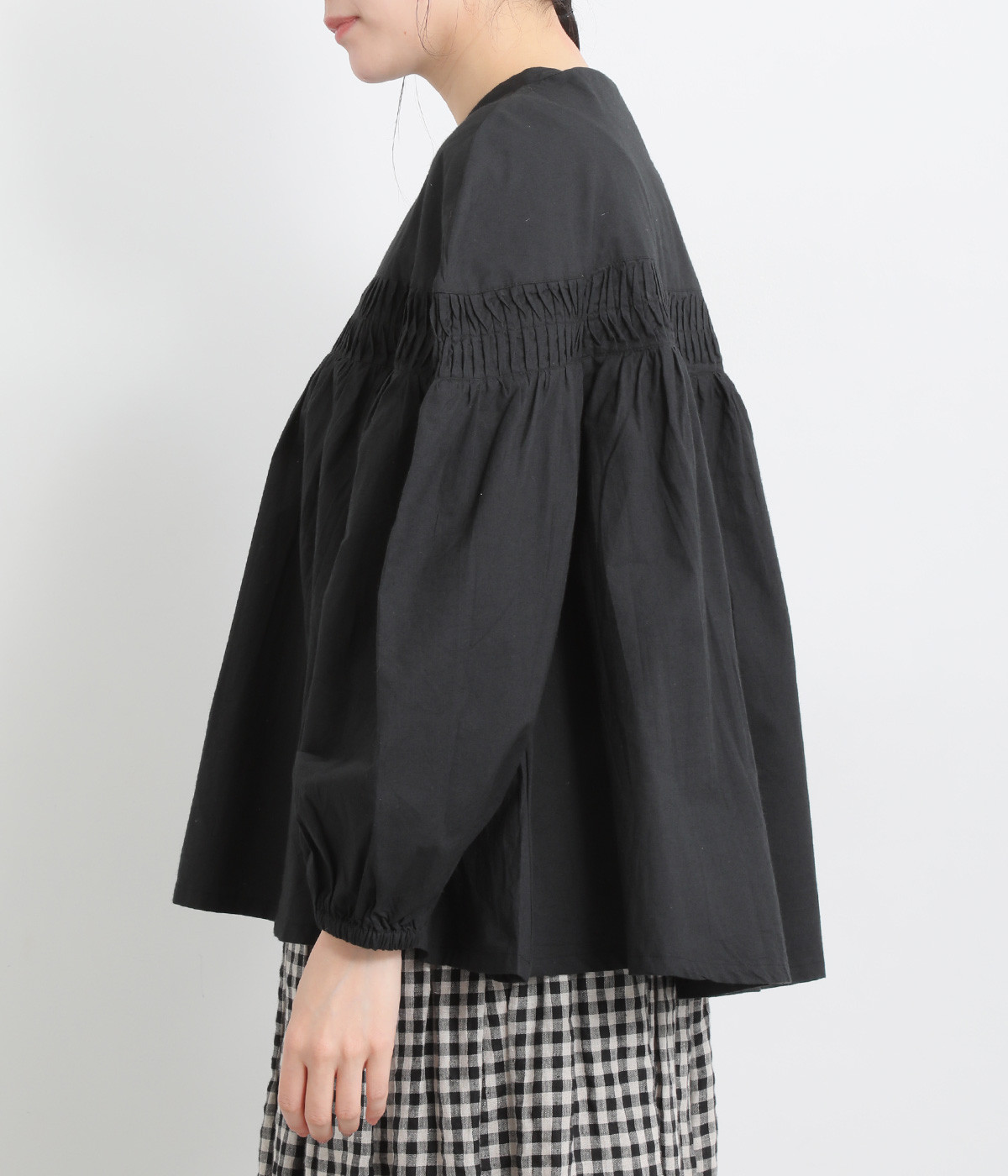 ツイストした立体感のある胸元のピンタックが個性的。ふっくらとした袖は袖口がギャザーゴムになっていて、袖丈の変化も楽しめます。可愛らしいフレアシルエットなのでリラクシーな着心地に。第二ボタン以下は比翼仕立てですっきりとさせました。