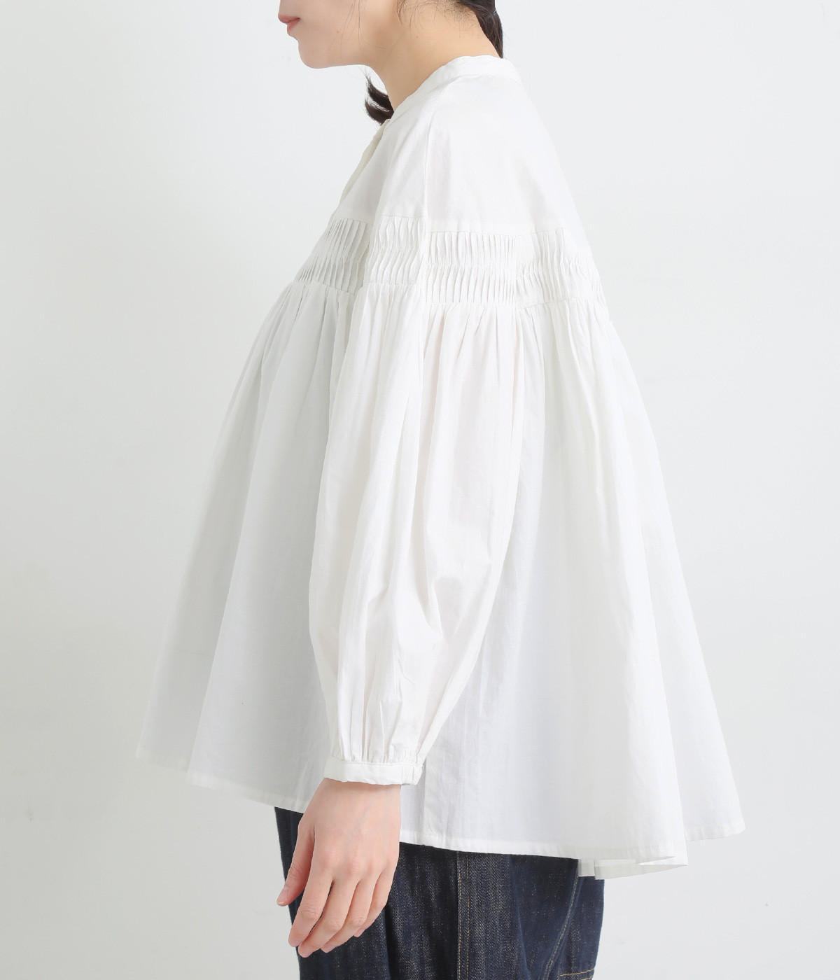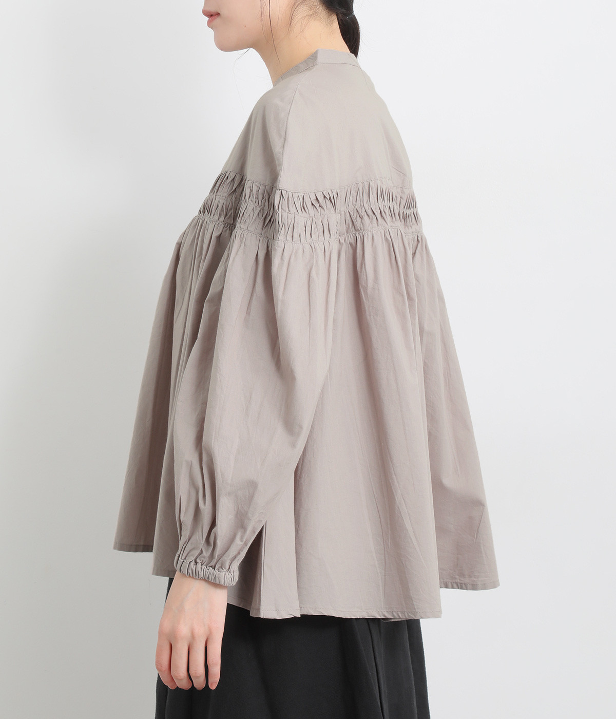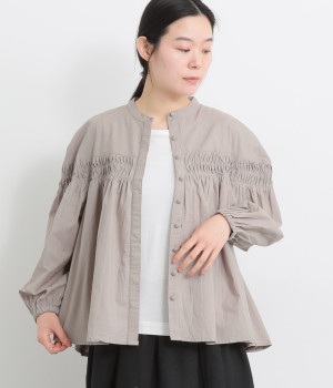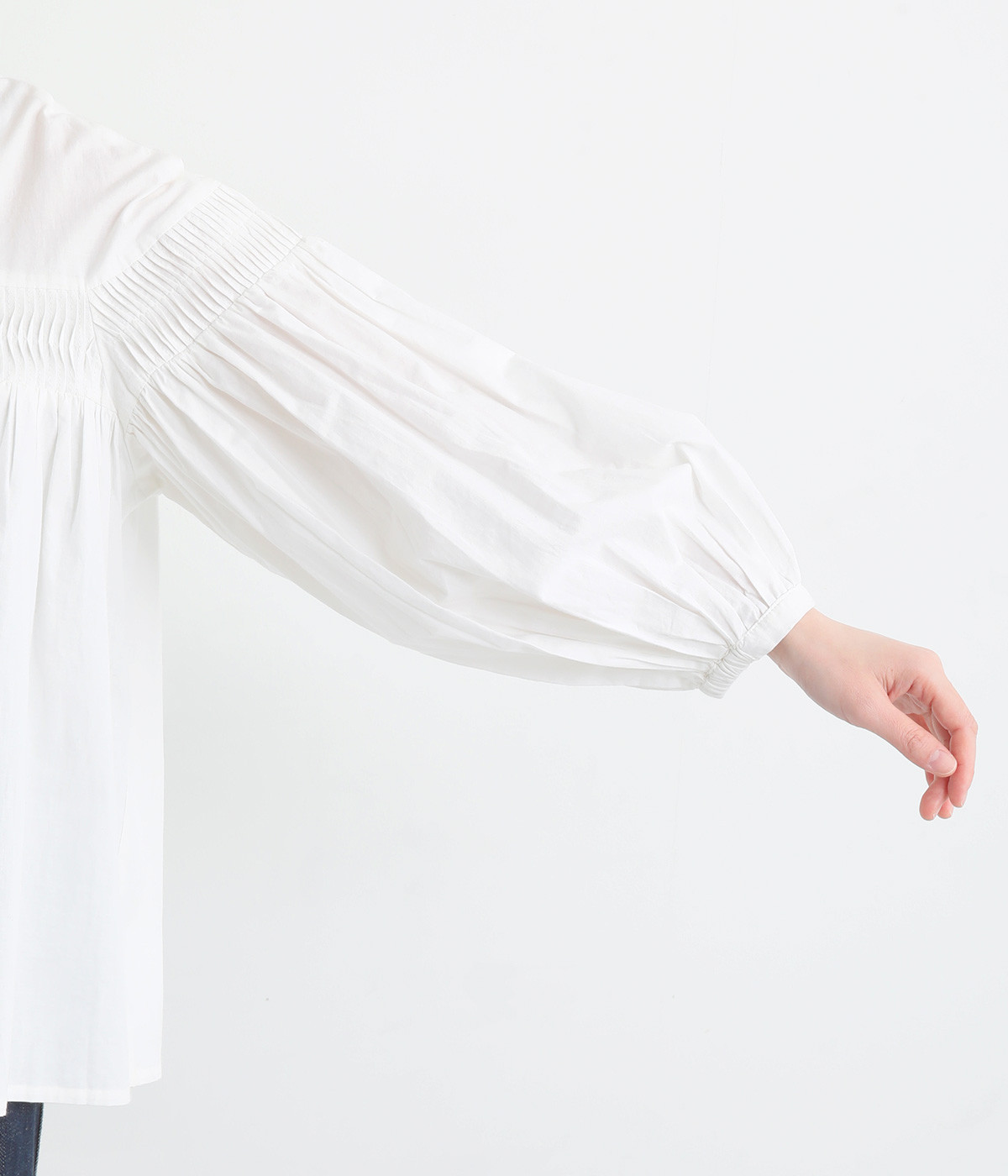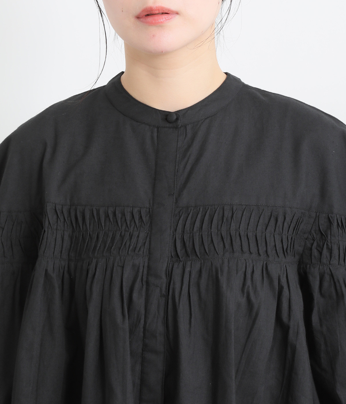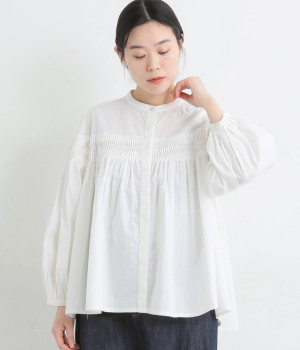 ツイストした立体感のある胸元のピンタックが個性的。ふっくらとした袖は袖口がギャザーゴムになっていて、袖丈の変化も楽しめます。可愛らしいフレアシルエットなのでリラクシーな着心地に。第二ボタン以下は比翼仕立てですっきりとさせました。
