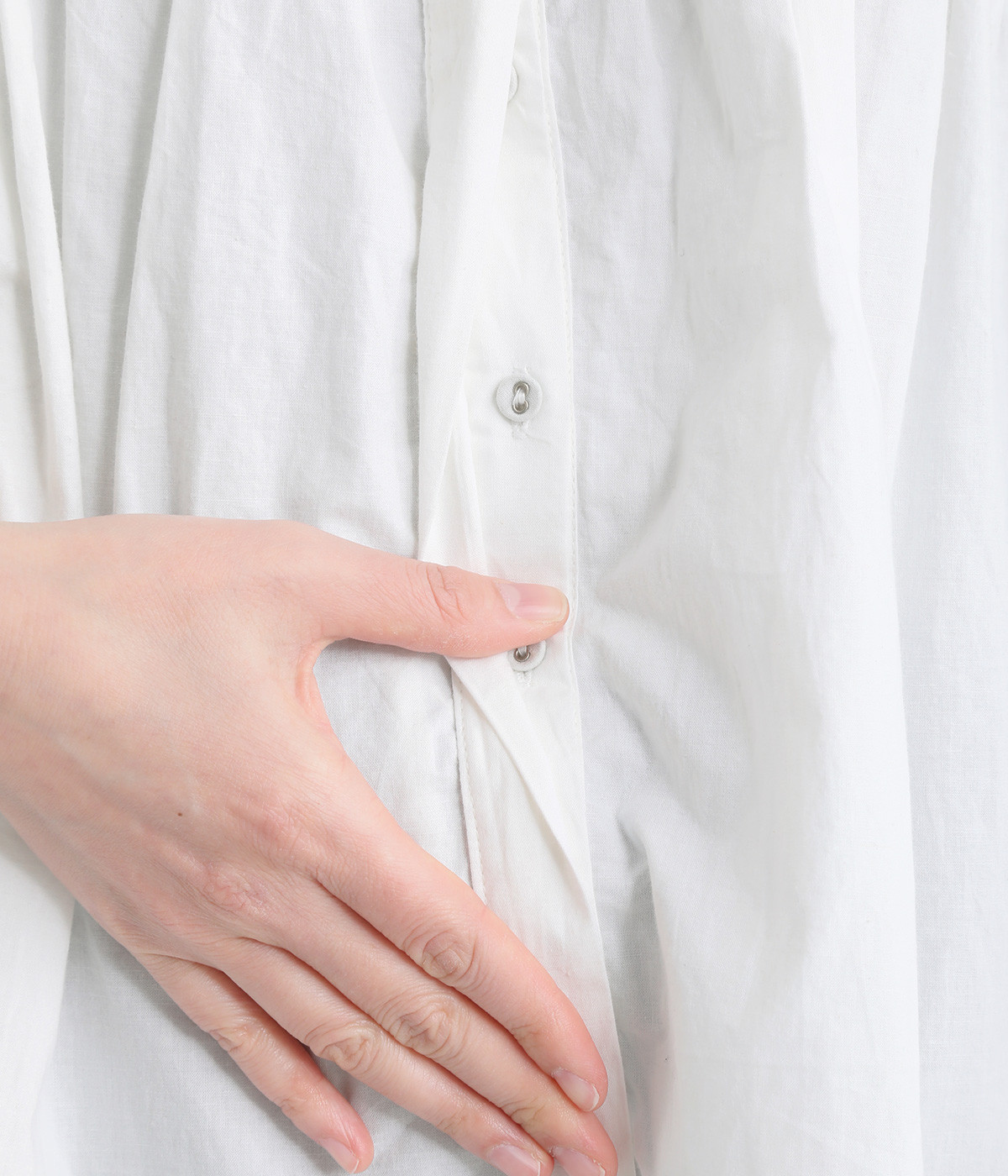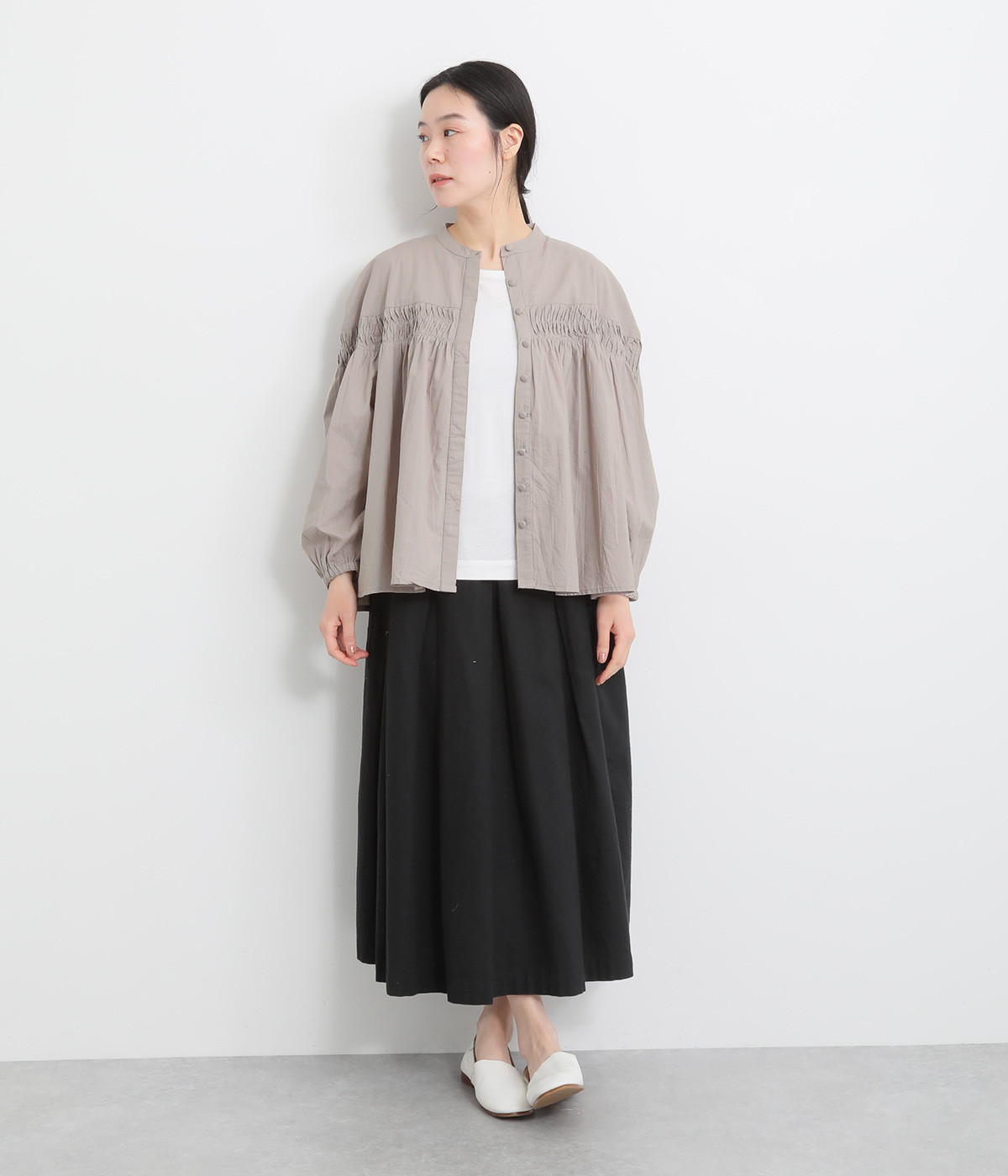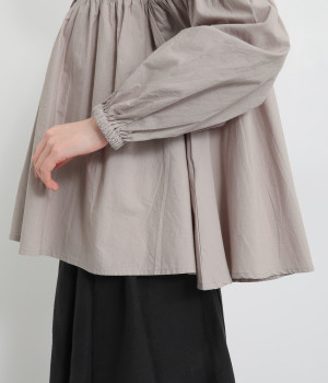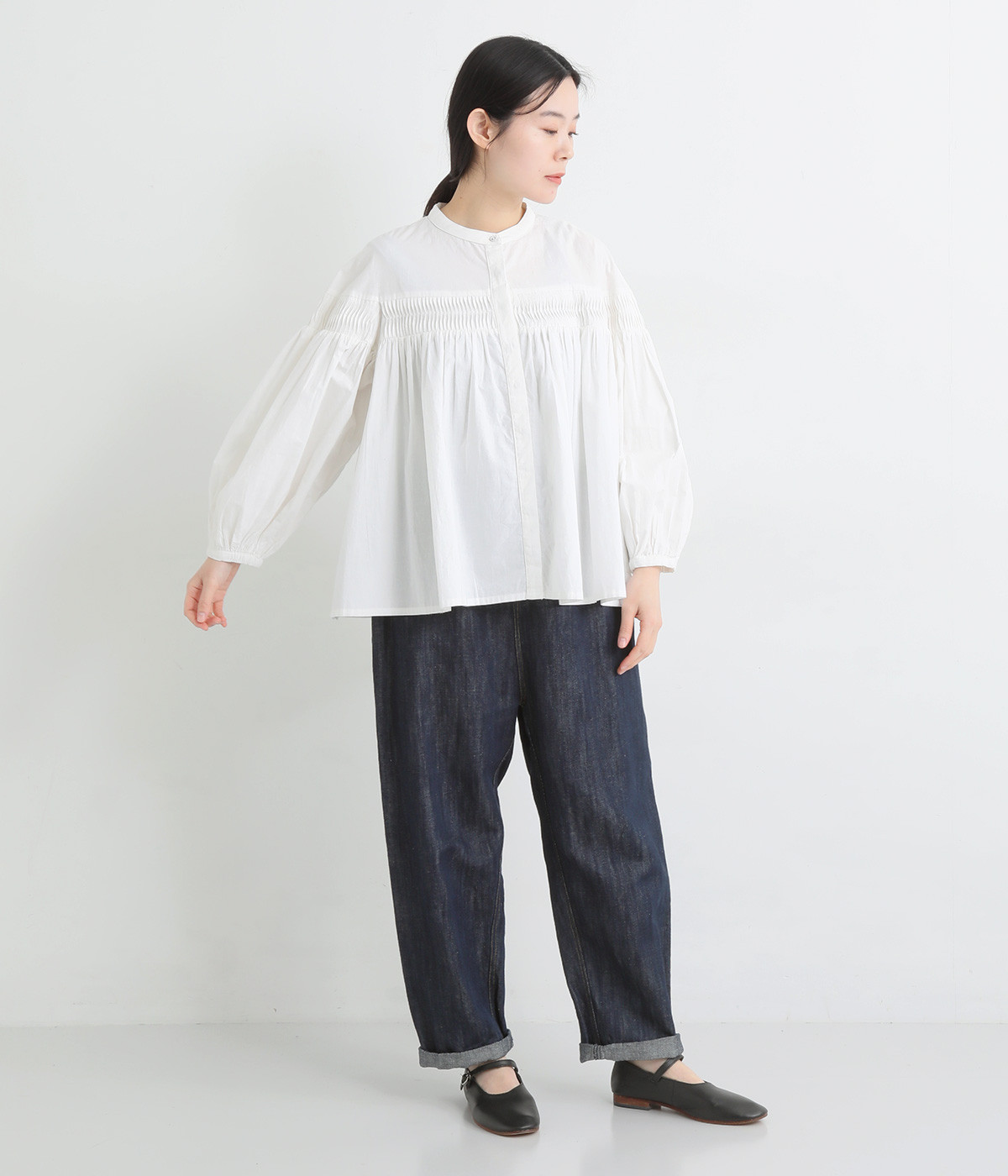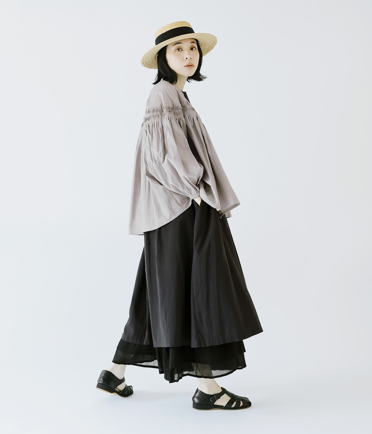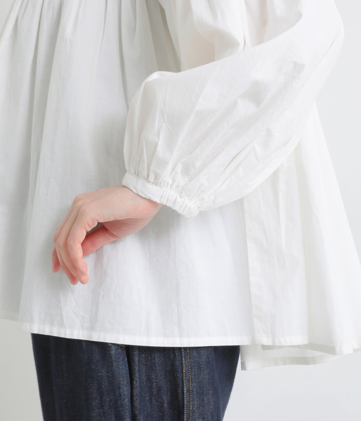ツイストした立体感のある胸元のピンタックが個性的。ふっくらとした袖は袖口がギャザーゴムになっていて、袖丈の変化も楽しめます。可愛らしいフレアシルエットなのでリラクシーな着心地に。第二ボタン以下は比翼仕立てですっきりとさせました。