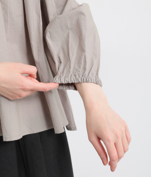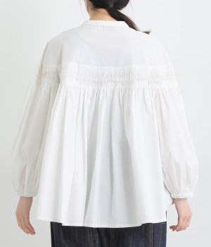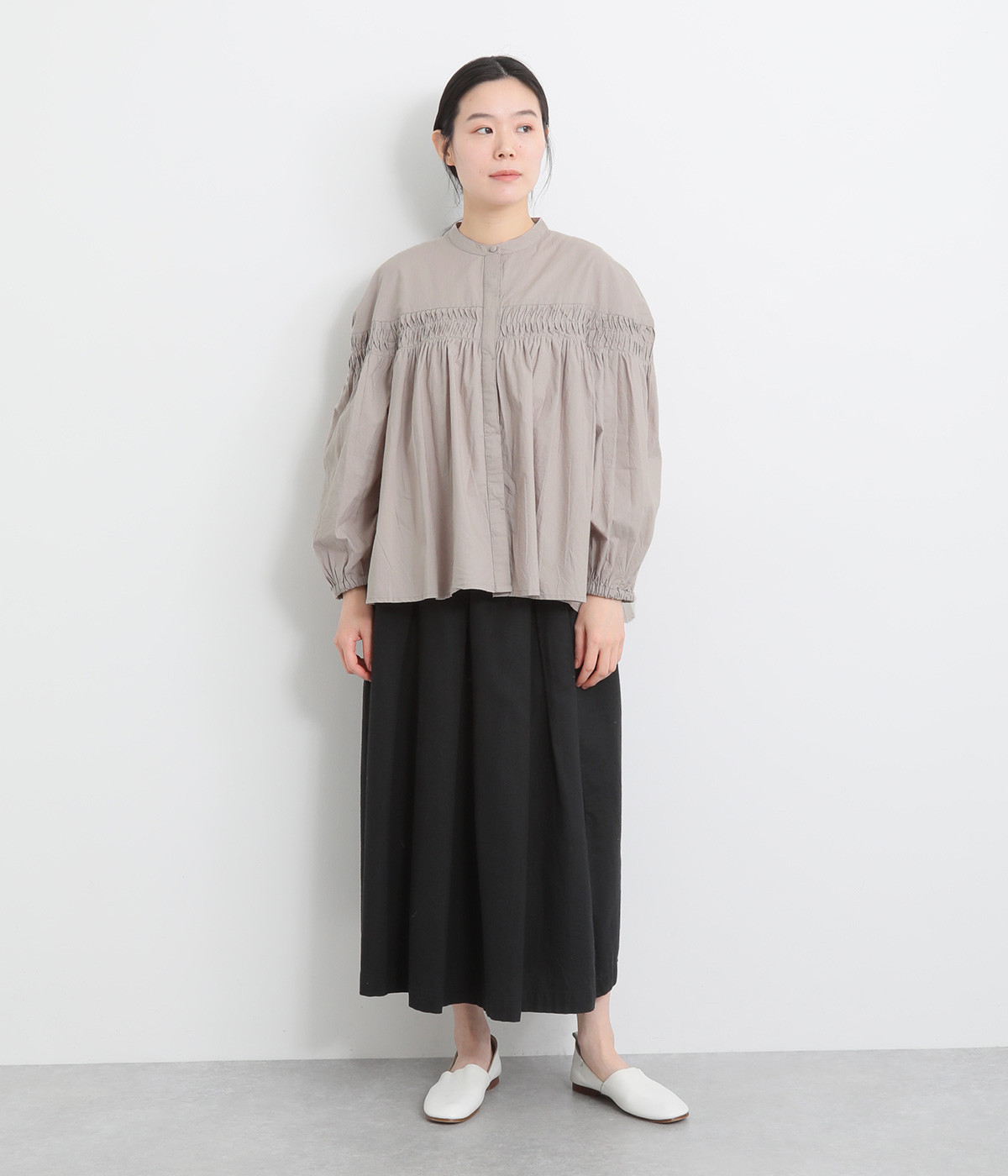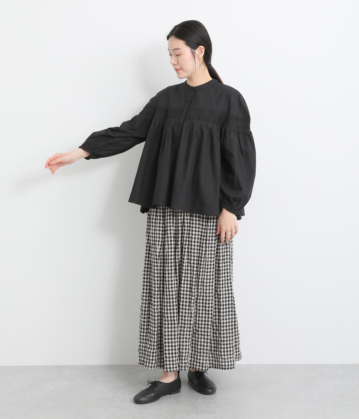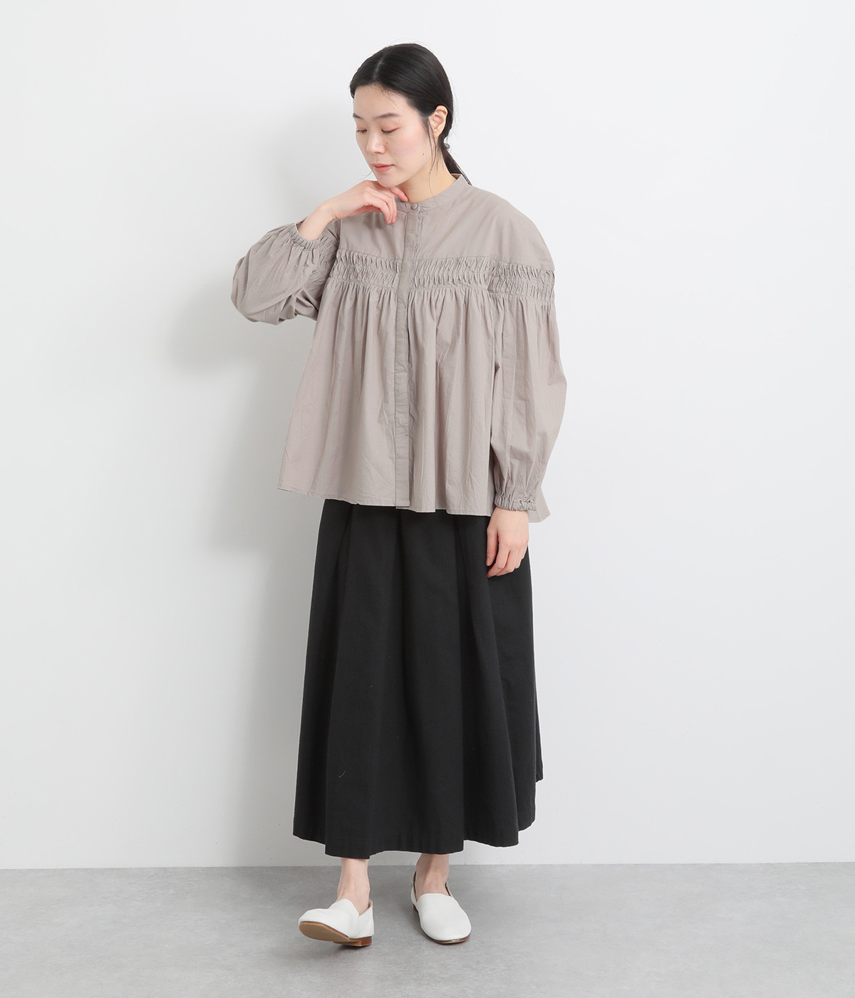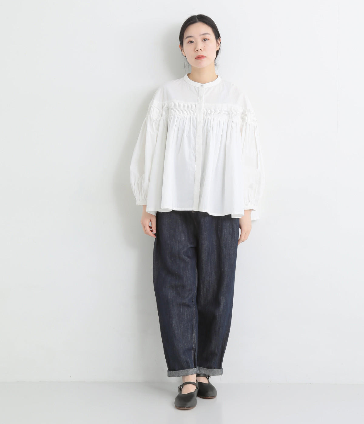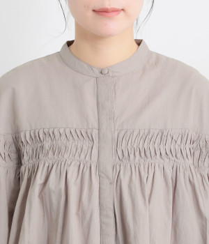 ツイストした立体感のある胸元のピンタックが個性的。ふっくらとした袖は袖口がギャザーゴムになっていて、袖丈の変化も楽しめます。可愛らしいフレアシルエットなのでリラクシーな着心地に。第二ボタン以下は比翼仕立てですっきりとさせました。