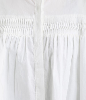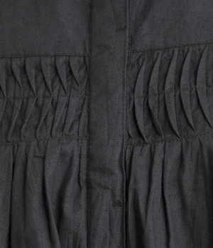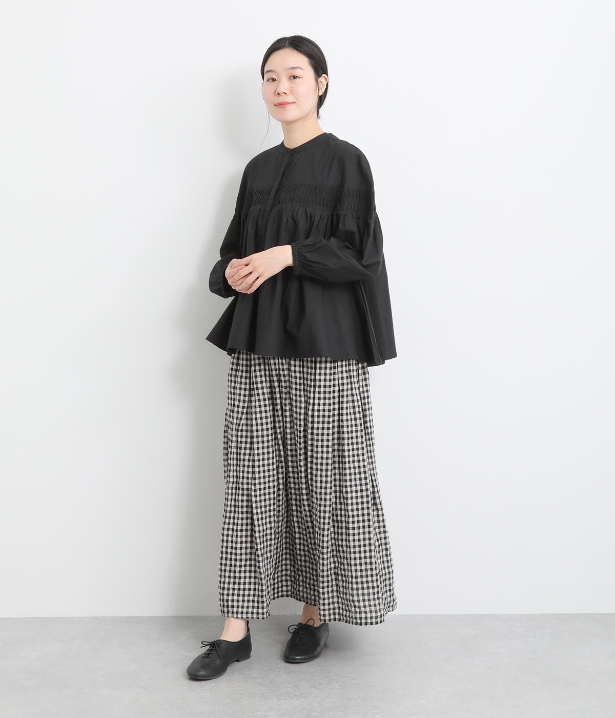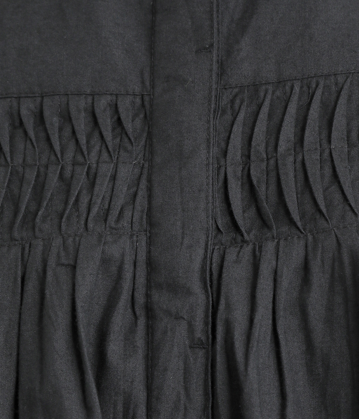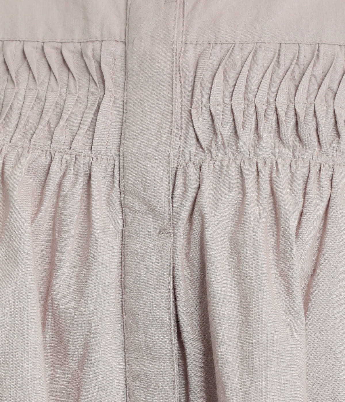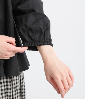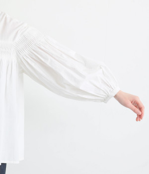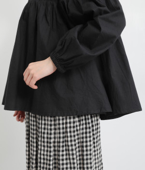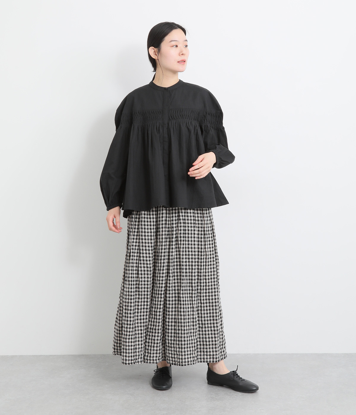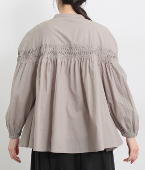 ツイストした立体感のある胸元のピンタックが個性的。ふっくらとした袖は袖口がギャザーゴムになっていて、袖丈の変化も楽しめます。可愛らしいフレアシルエットなのでリラクシーな着心地に。第二ボタン以下は比翼仕立てですっきりとさせました。