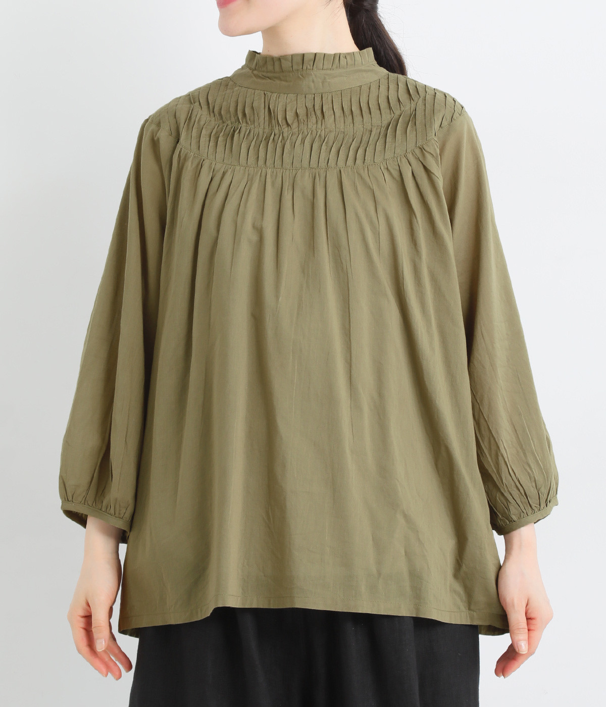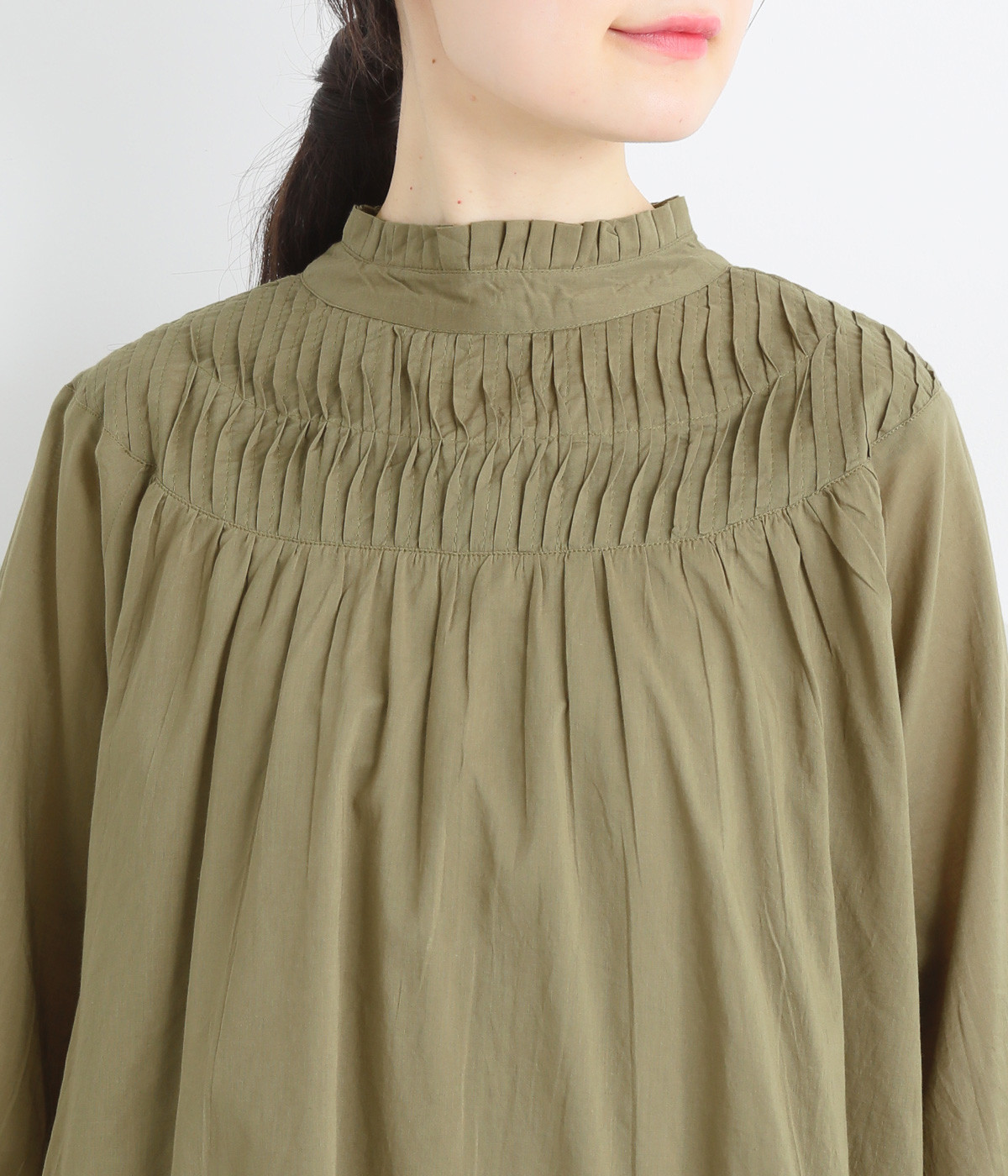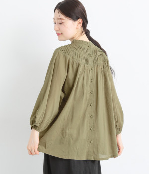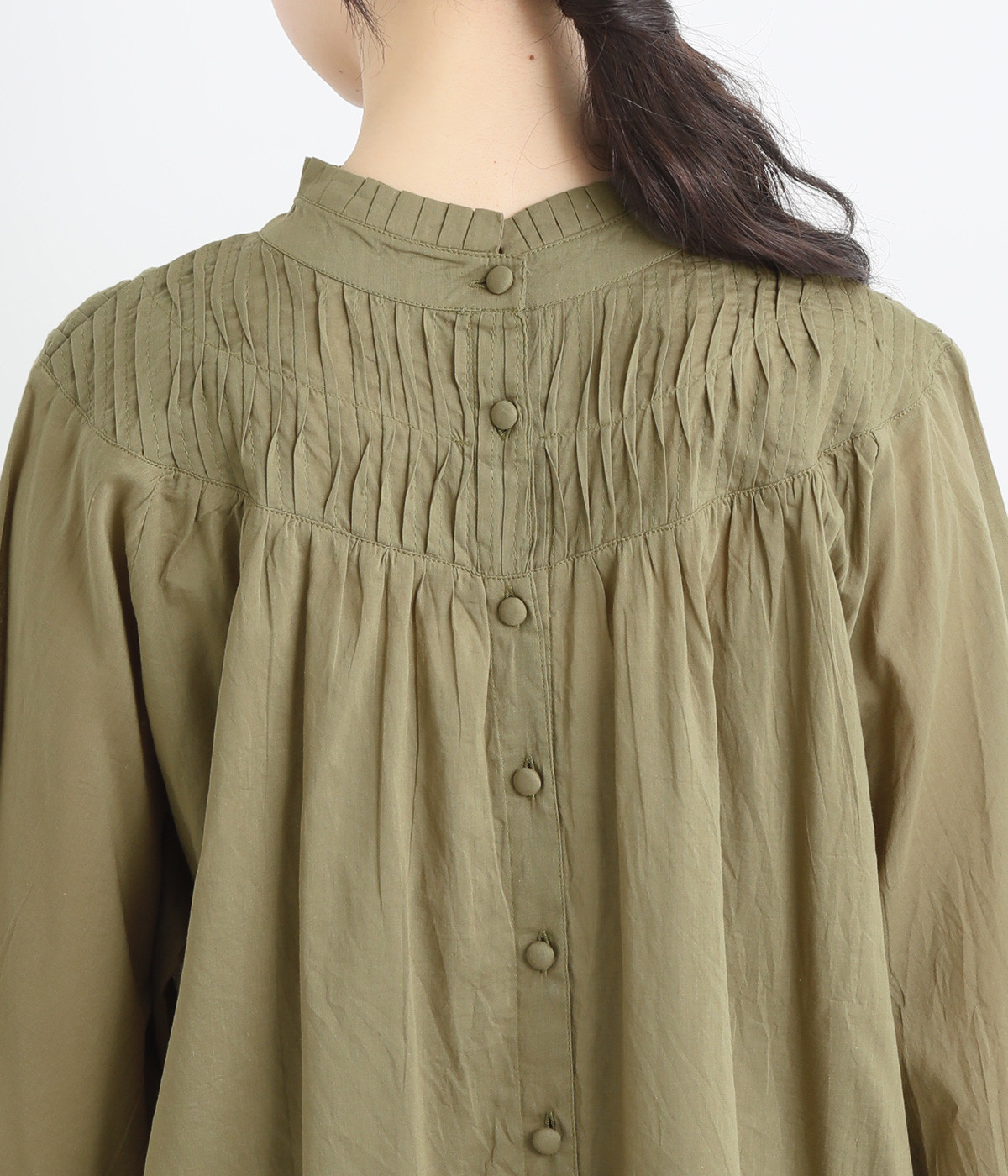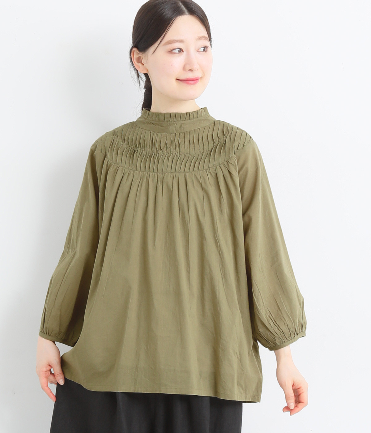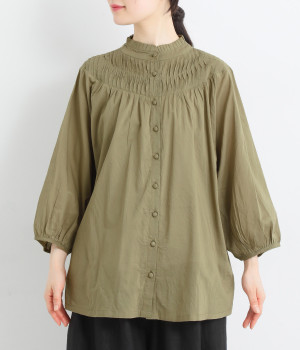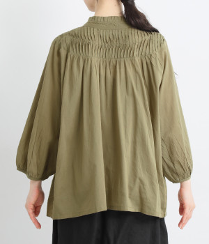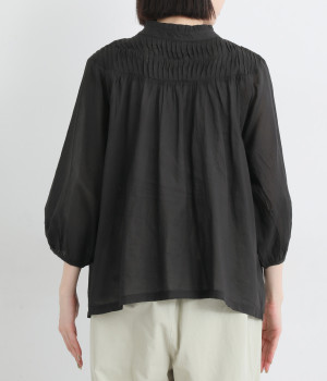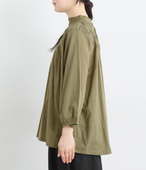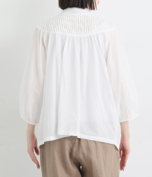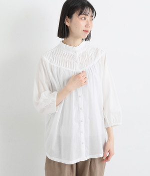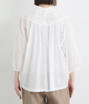 スタイリングの雰囲気に変化をつけられる、着まわし力の高い前後2way仕様。ピンタックとツイストしたピンタックのコンビネーションが際立ちます。スタンドカラーにはフリルをあしらい、クラシックムードをプラス。袖口はギャザーゴムですっきりとさせました。