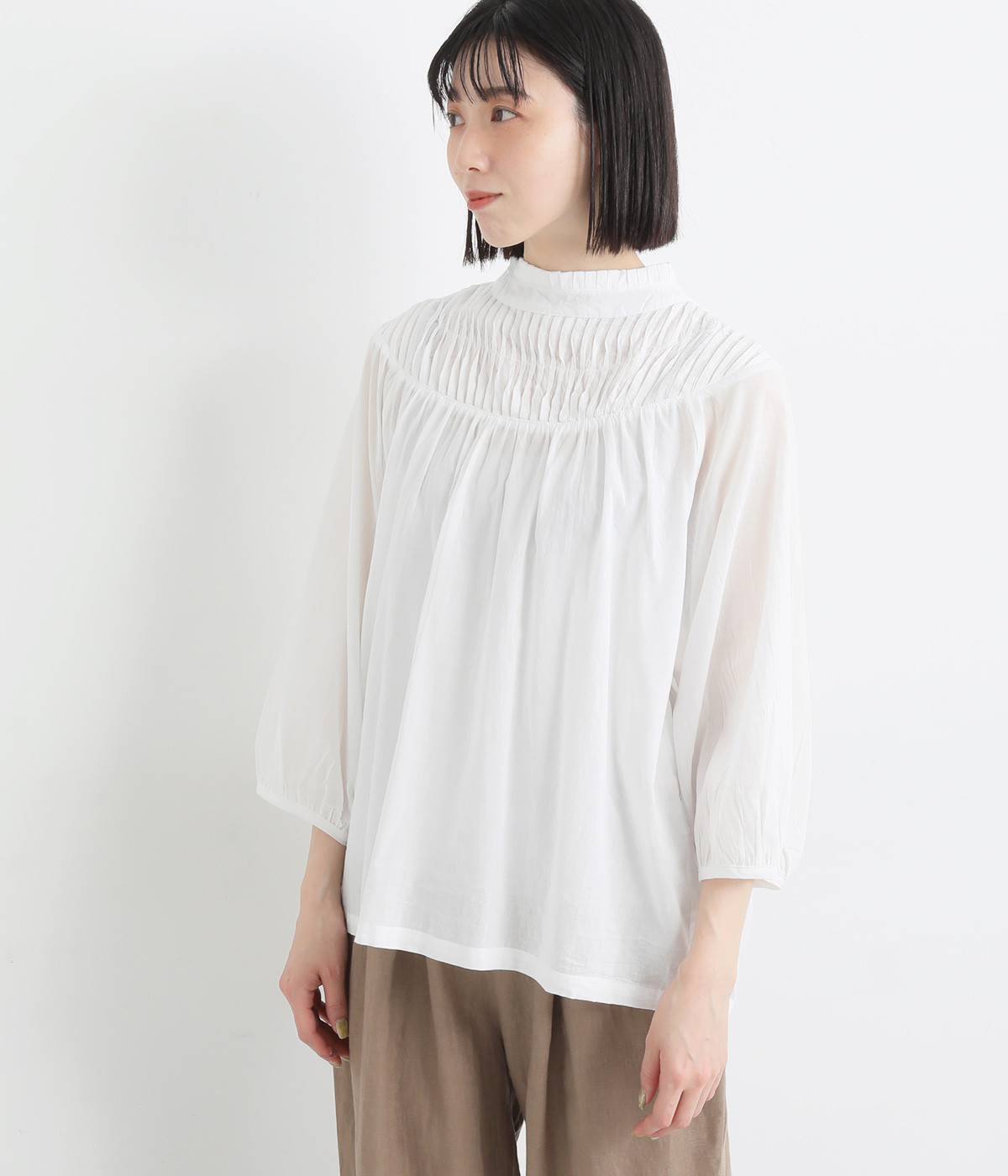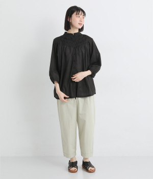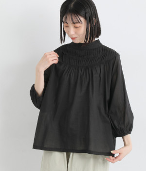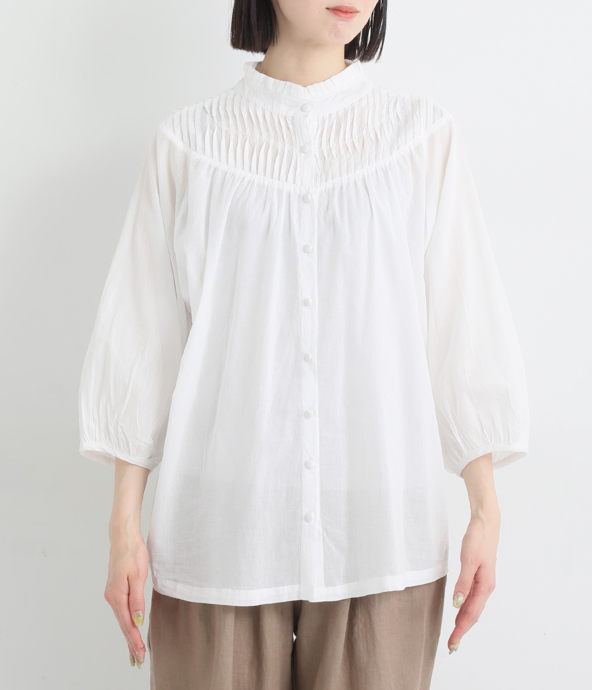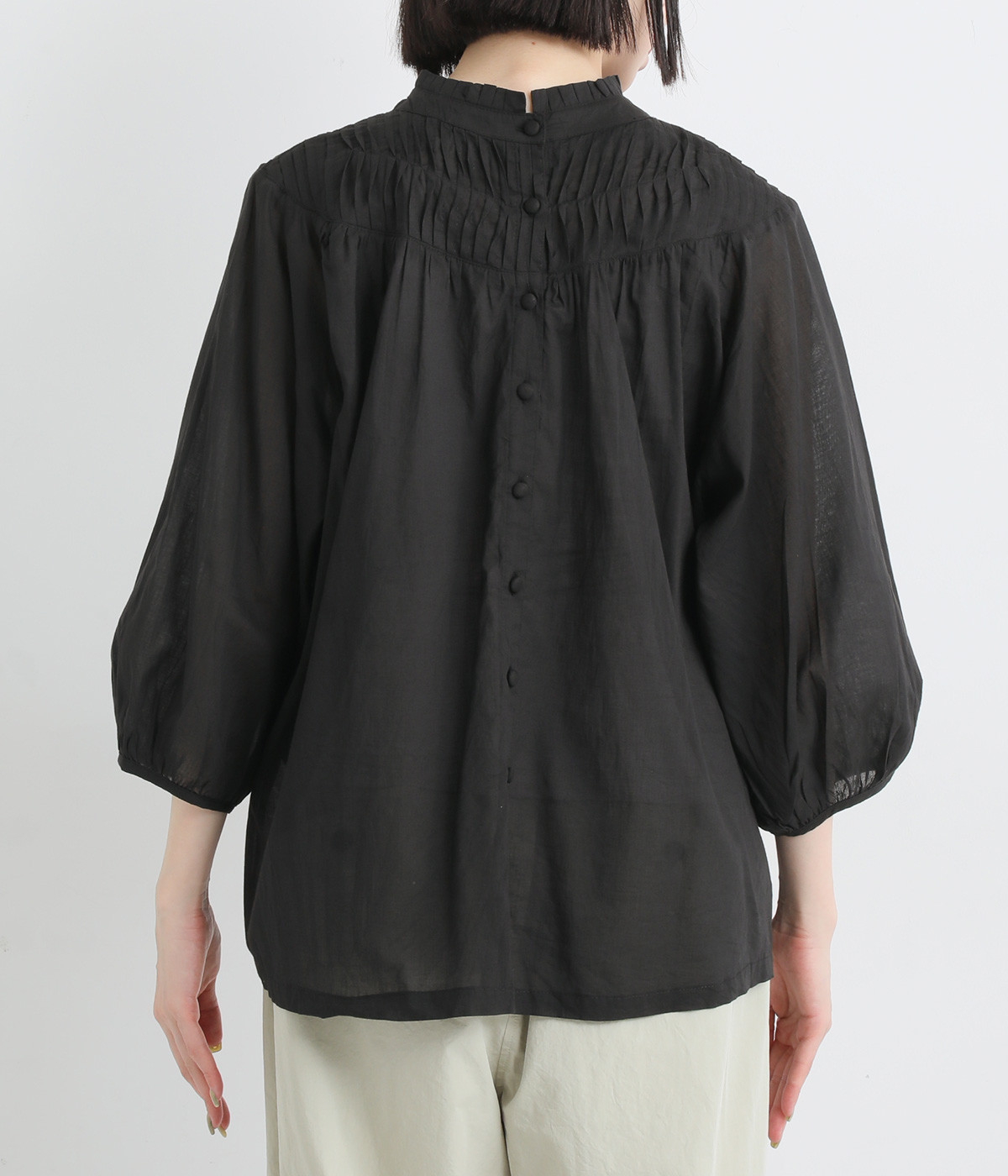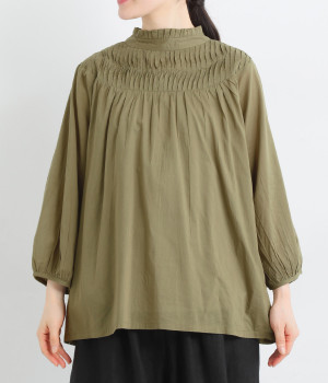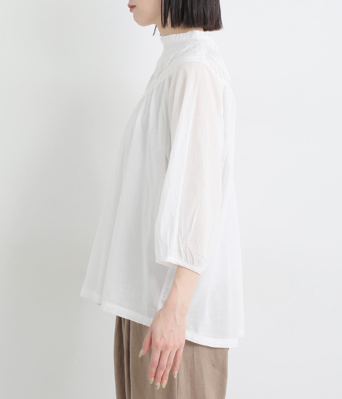 スタイリングの雰囲気に変化をつけられる、着まわし力の高い前後2way仕様。ピンタックとツイストしたピンタックのコンビネーションが際立ちます。スタンドカラーにはフリルをあしらい、クラシックムードをプラス。袖口はギャザーゴムですっきりとさせました。