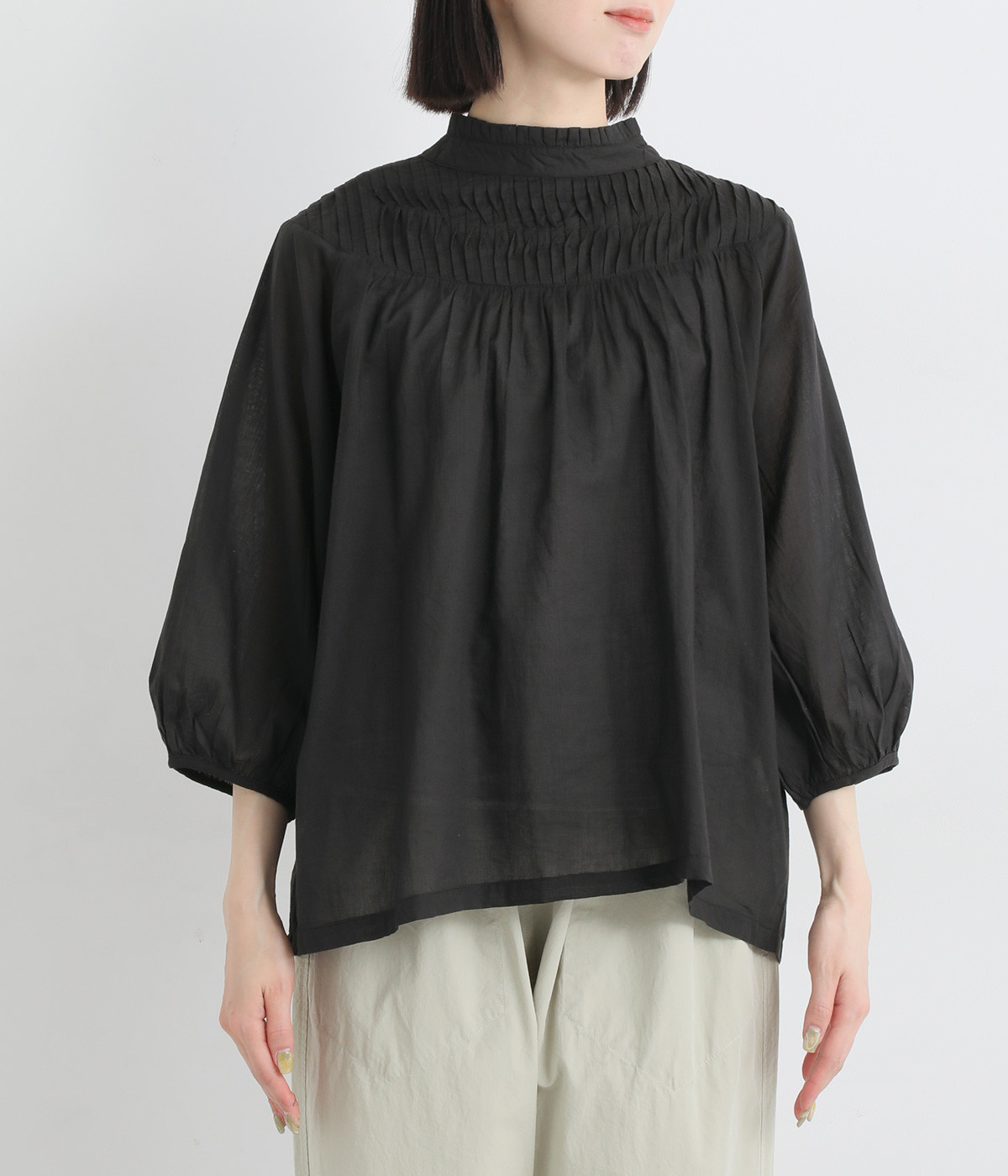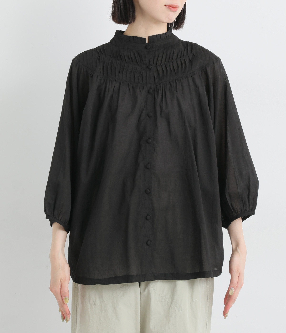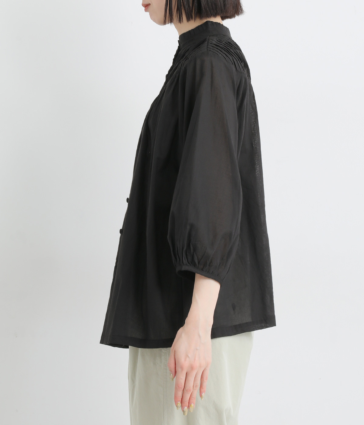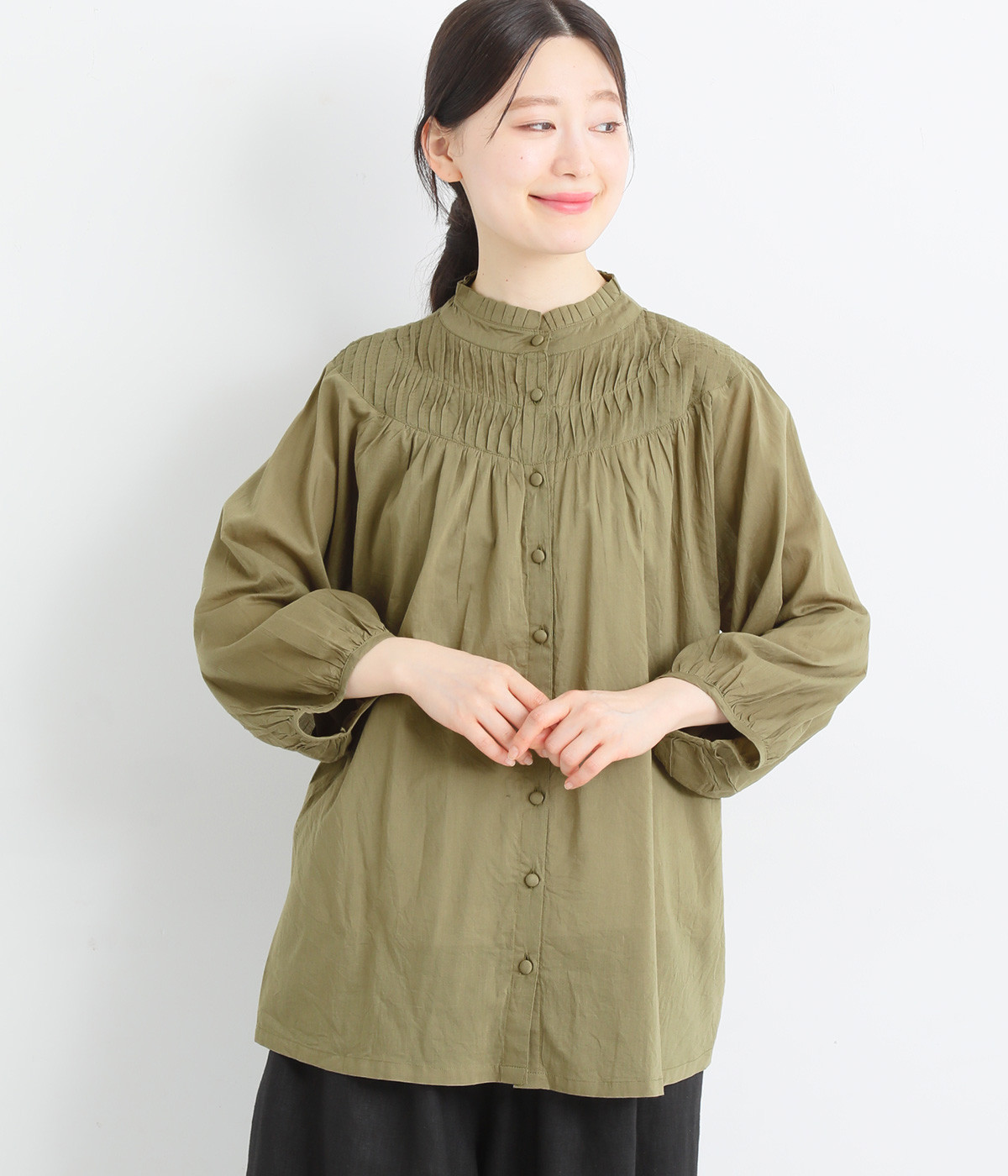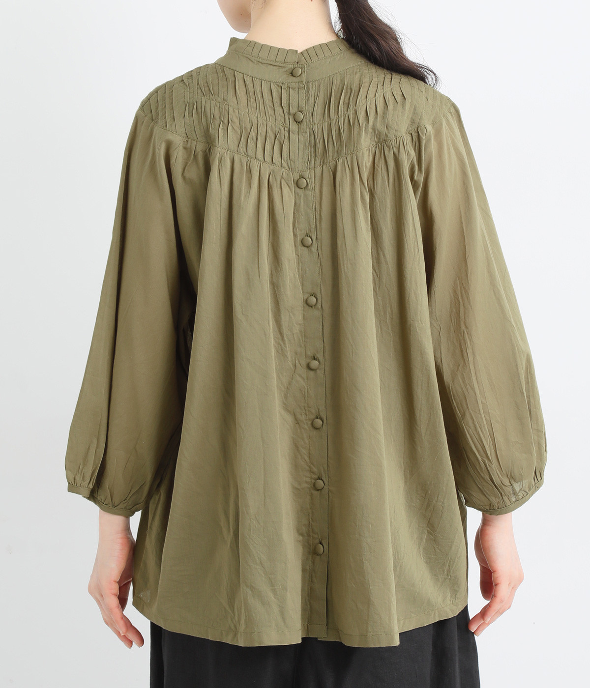 スタイリングの雰囲気に変化をつけられる、着まわし力の高い前後2way仕様。ピンタックとツイストしたピンタックのコンビネーションが際立ちます。スタンドカラーにはフリルをあしらい、クラシックムードをプラス。袖口はギャザーゴムですっきりとさせました。