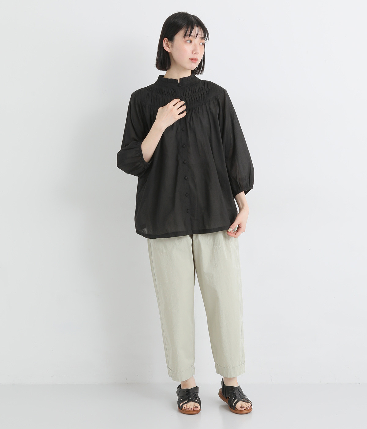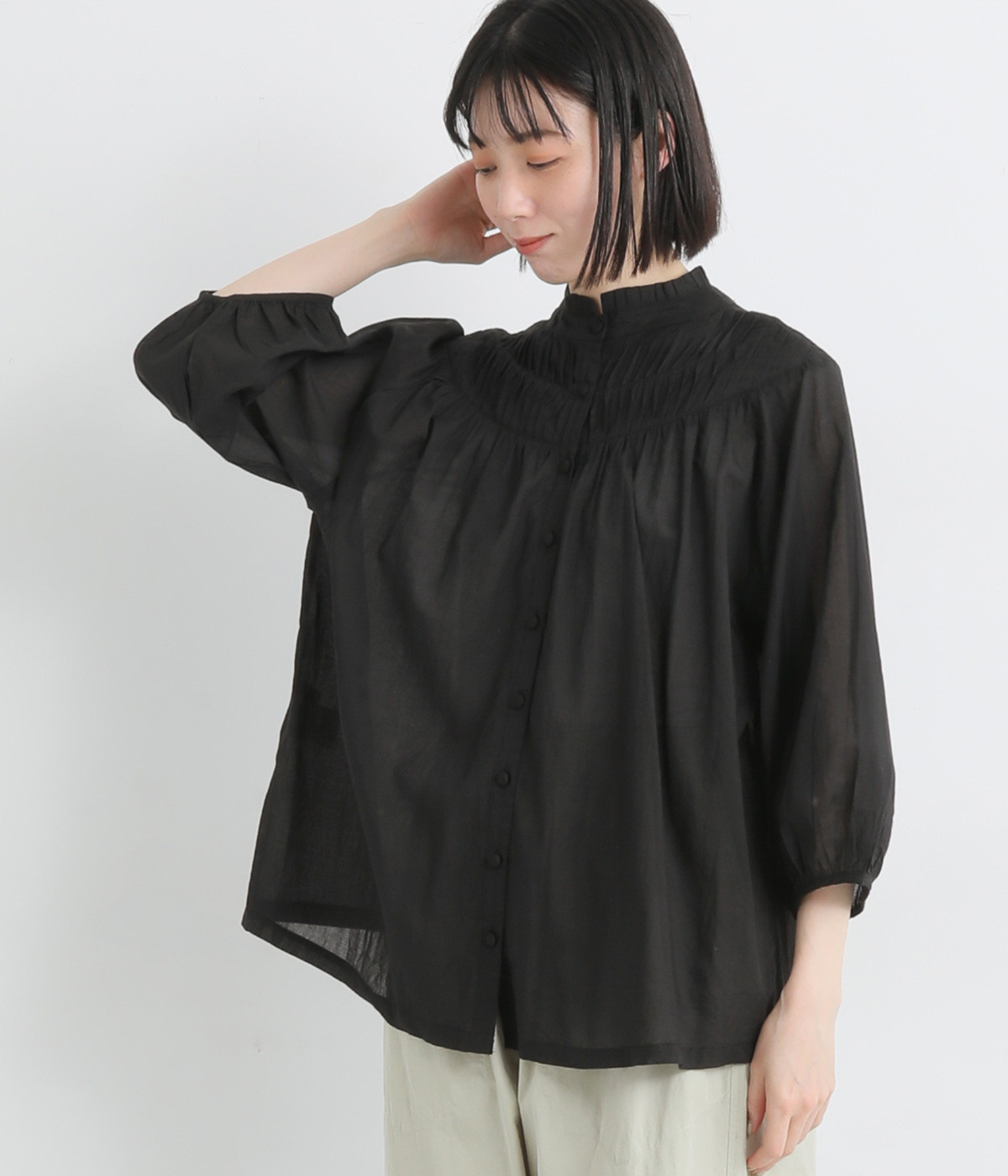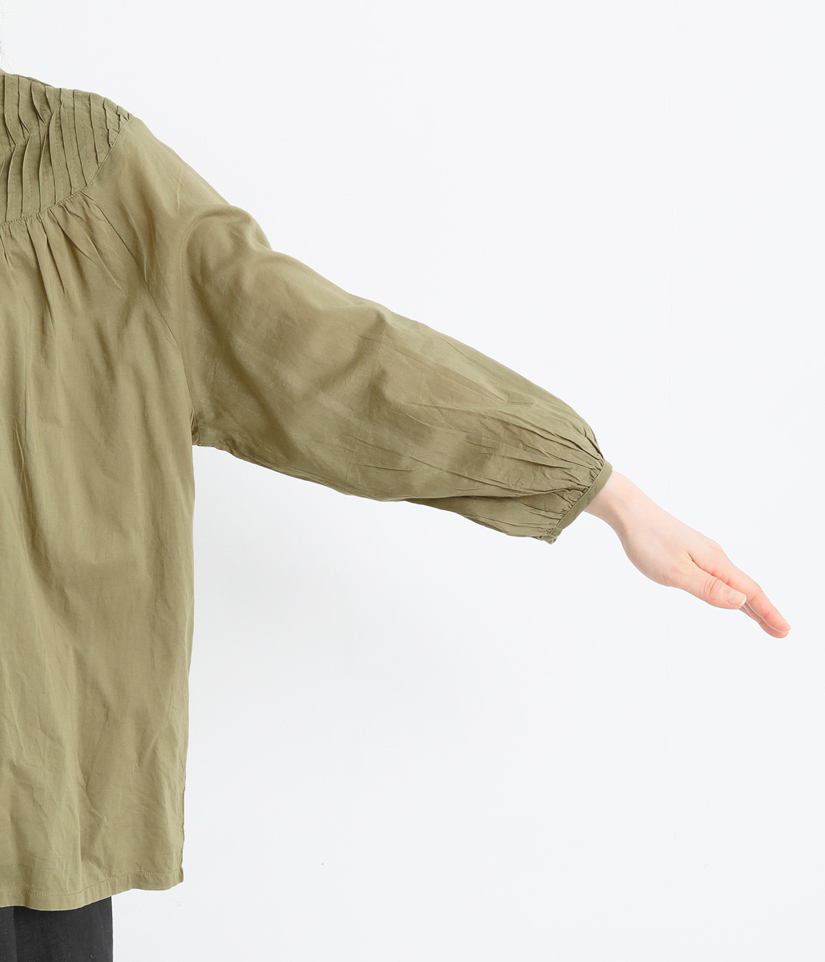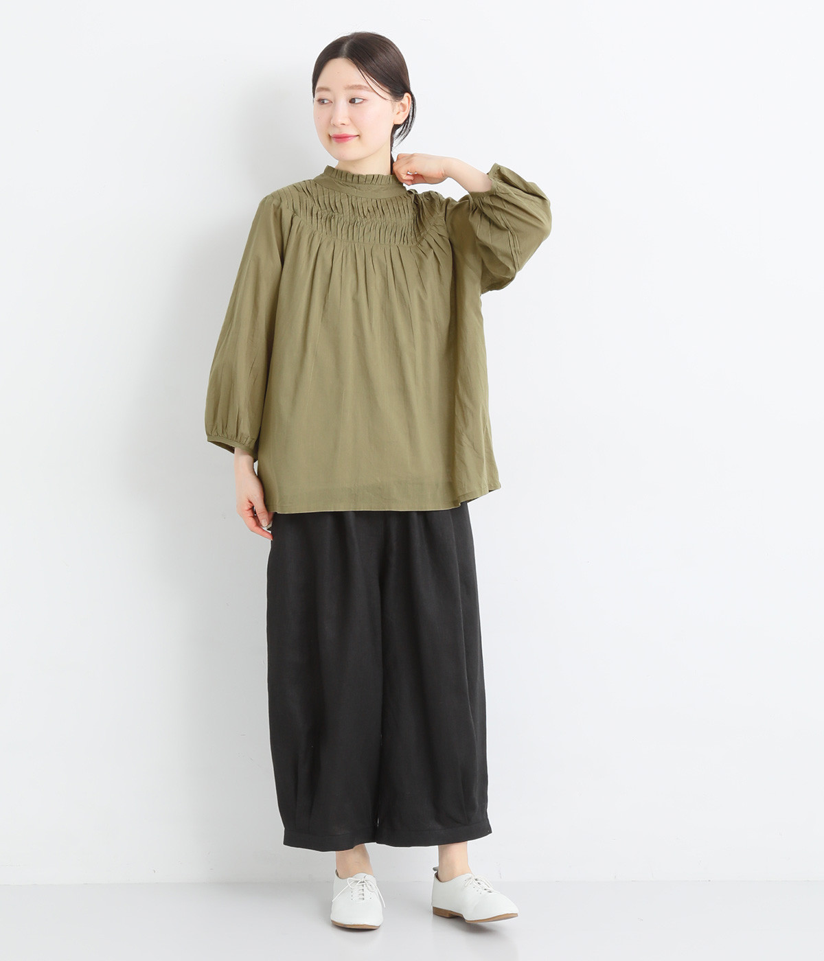 スタイリングの雰囲気に変化をつけられる、着まわし力の高い前後2way仕様。ピンタックとツイストしたピンタックのコンビネーションが際立ちます。スタンドカラーにはフリルをあしらい、クラシックムードをプラス。袖口はギャザーゴムですっきりとさせました。