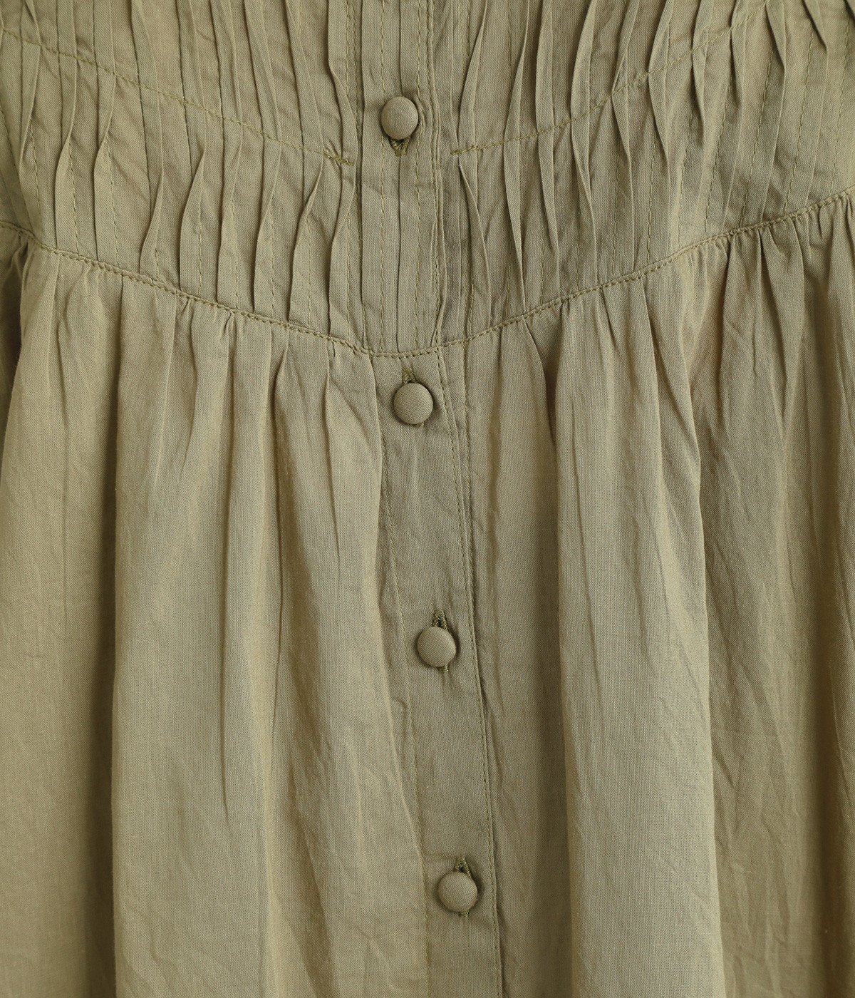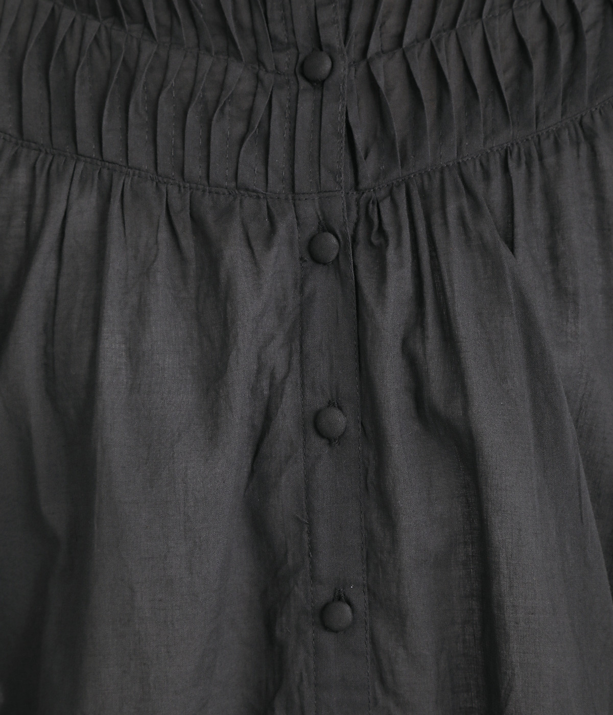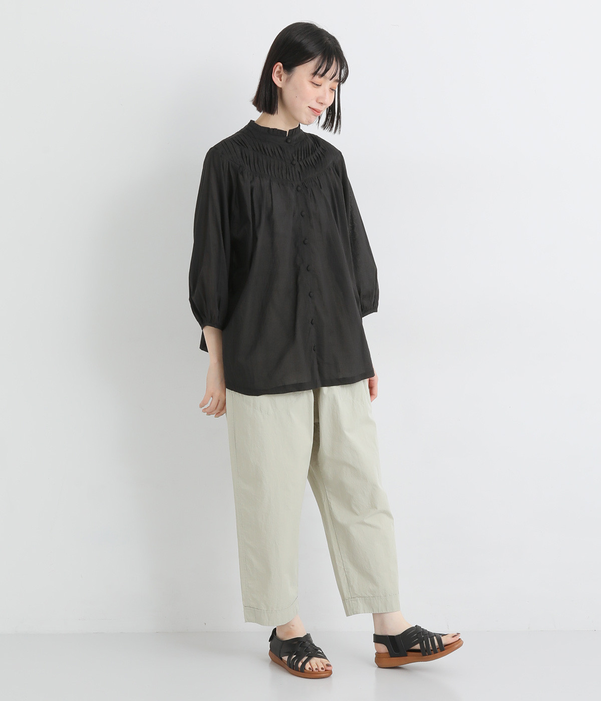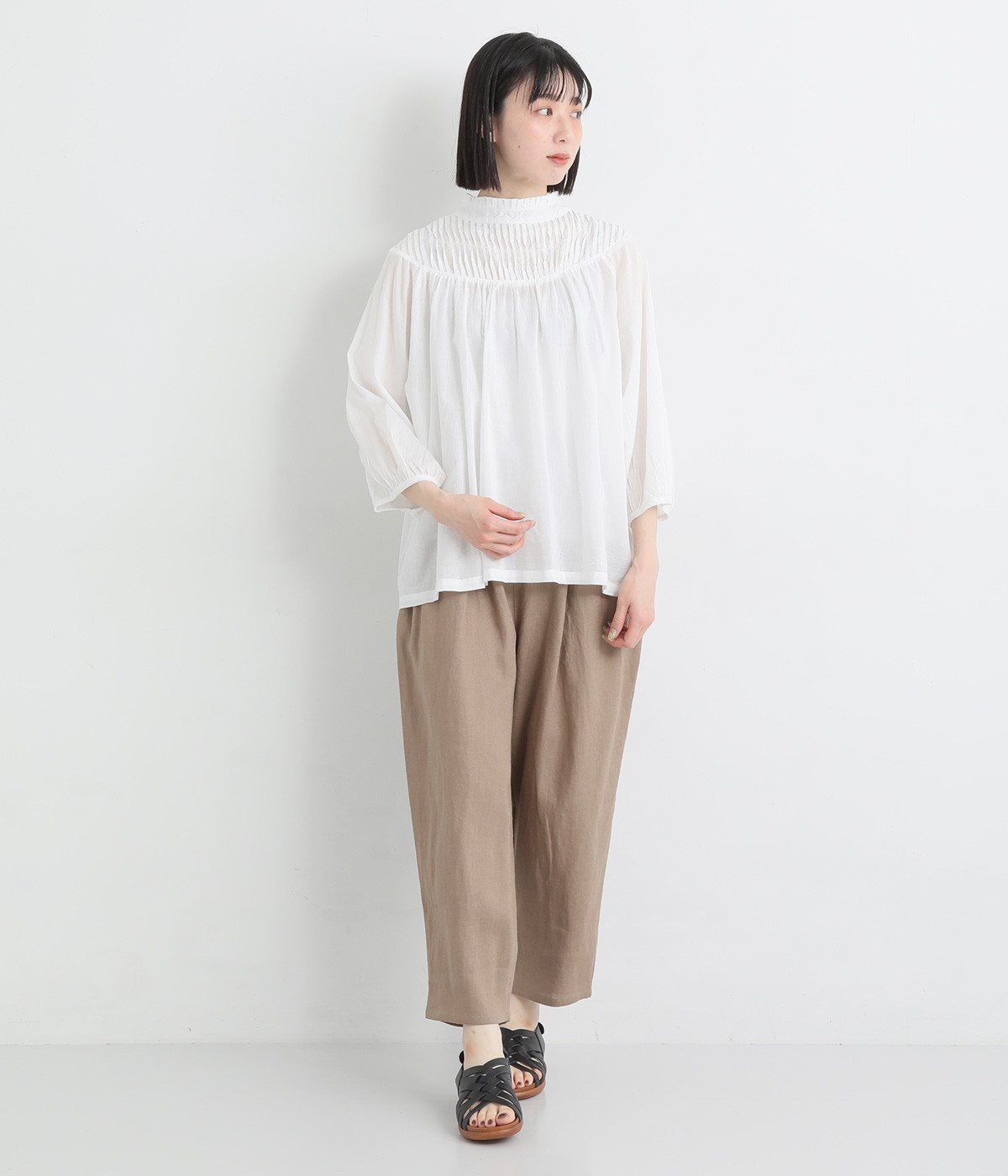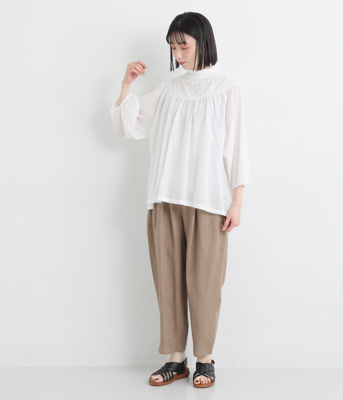 スタイリングの雰囲気に変化をつけられる、着まわし力の高い前後2way仕様。ピンタックとツイストしたピンタックのコンビネーションが際立ちます。スタンドカラーにはフリルをあしらい、クラシックムードをプラス。袖口はギャザーゴムですっきりとさせました。