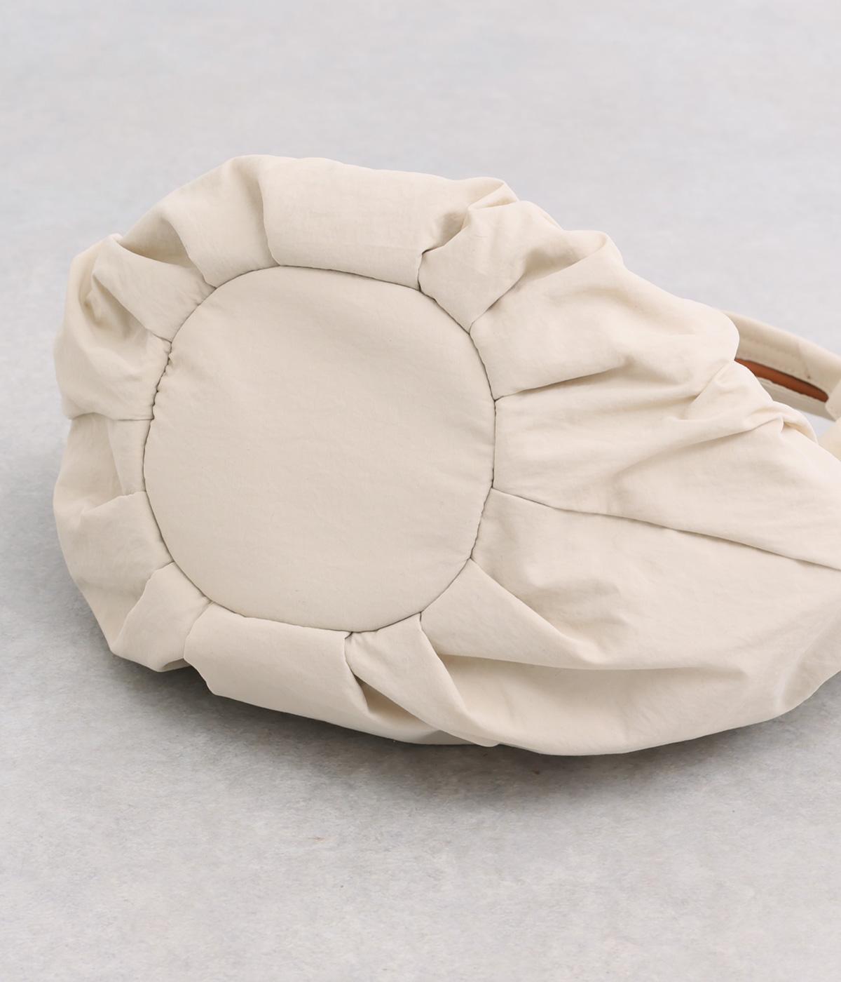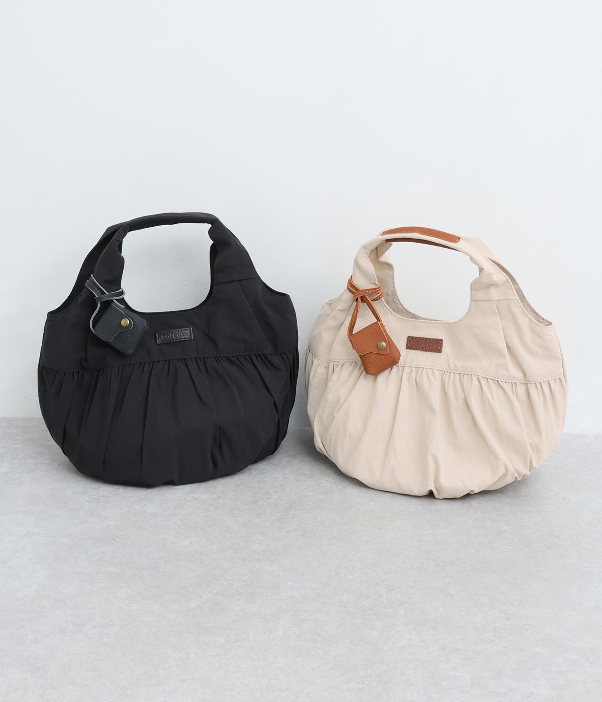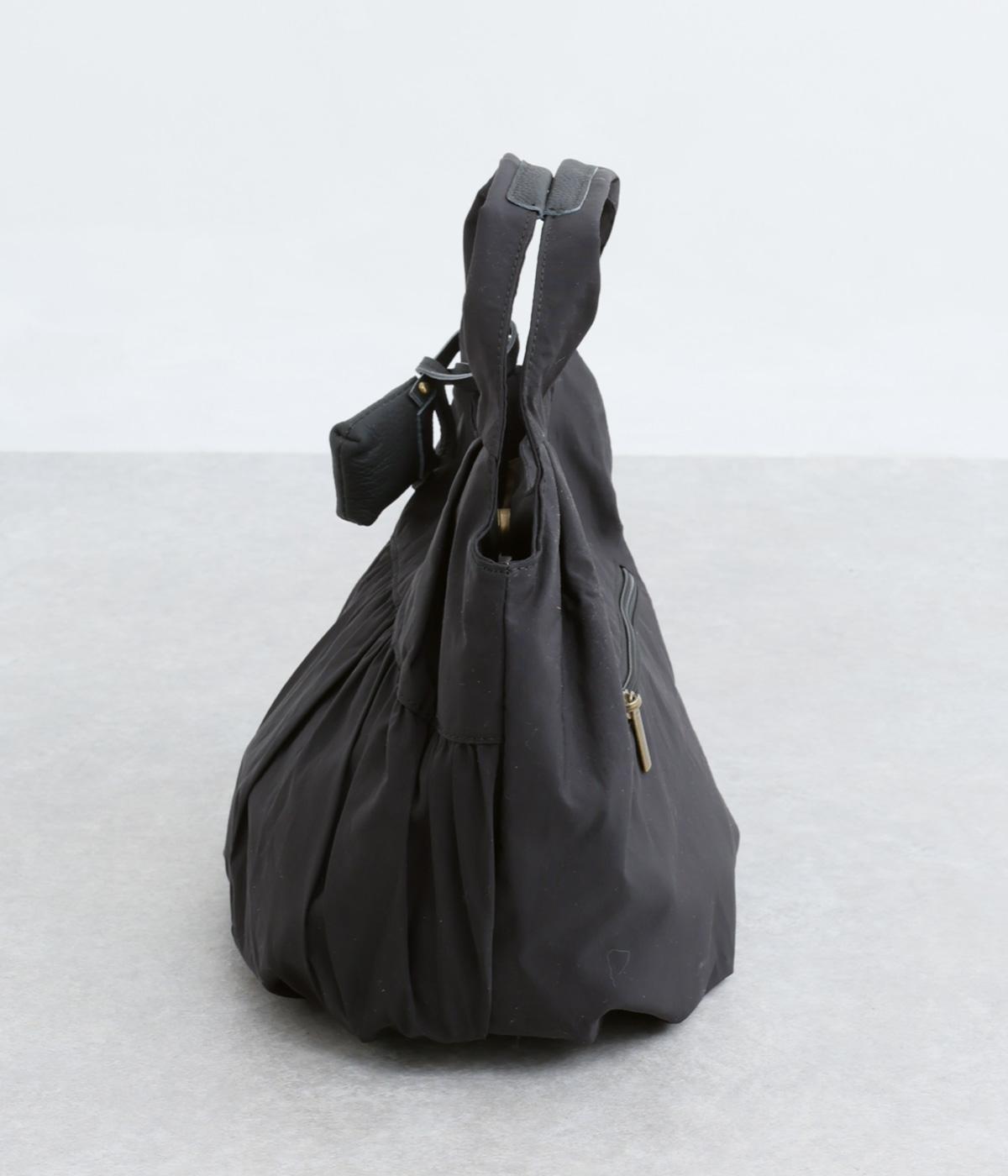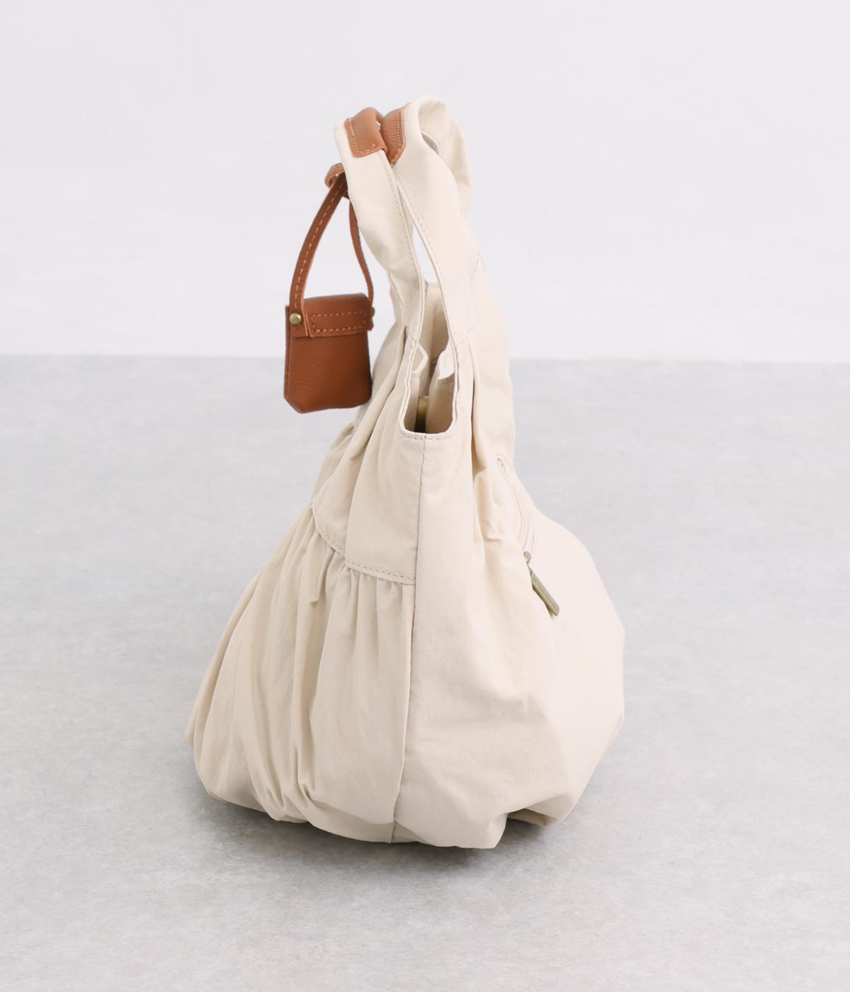 カジュアルな雰囲気のナイロン素材にギャザーを寄せて大人らしい表情に仕上げました。やや大きめなサイズ感に内外にポケットを配して抜群の収納力。コロンとしたフォルムで、手持ちでも肘にかけても愛らしいアクセントになります。かわいらしく揺れるミニレザーポーチ付きです。