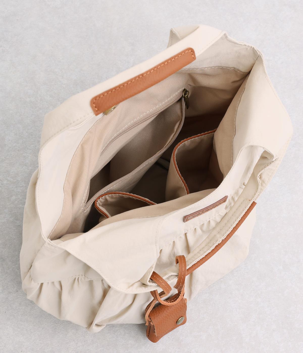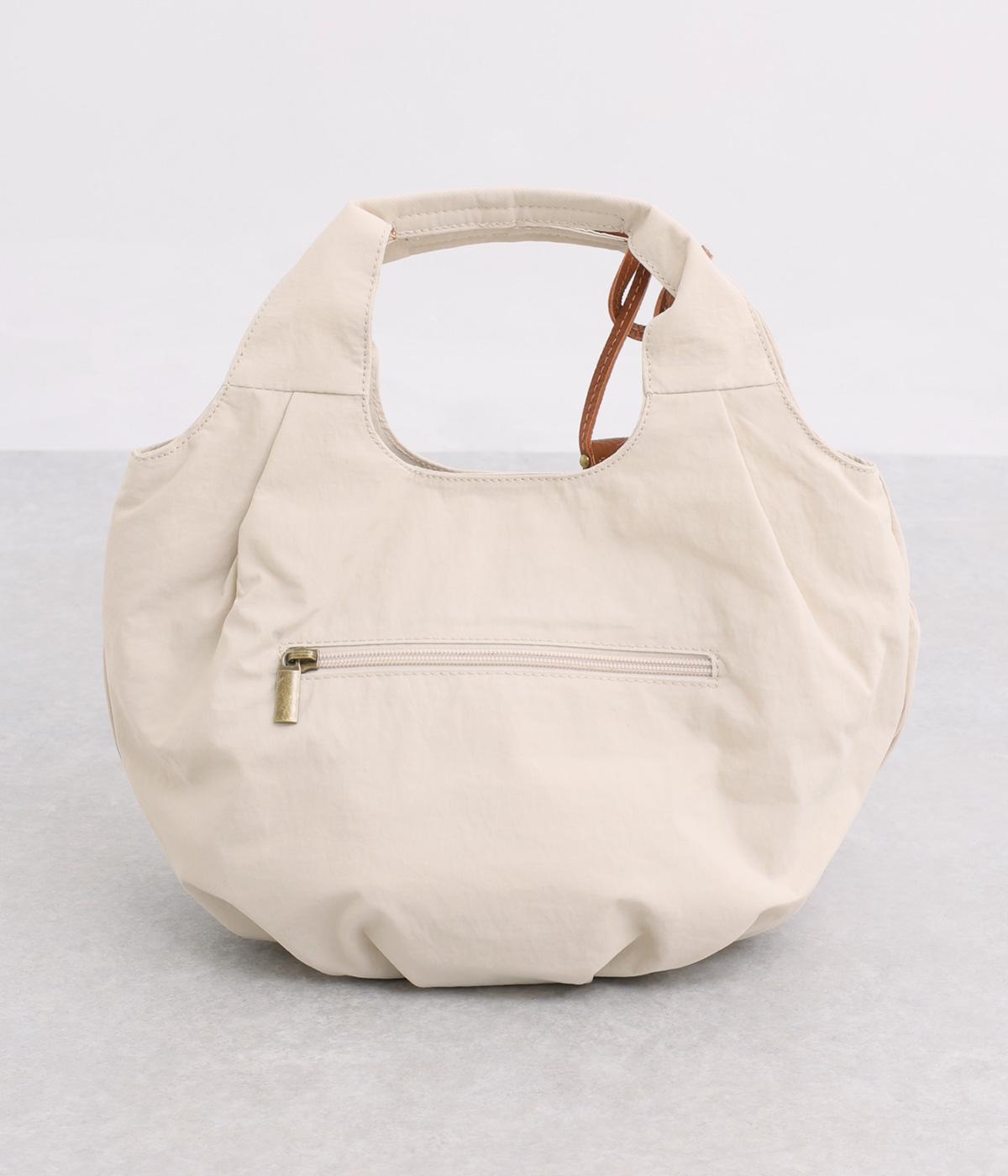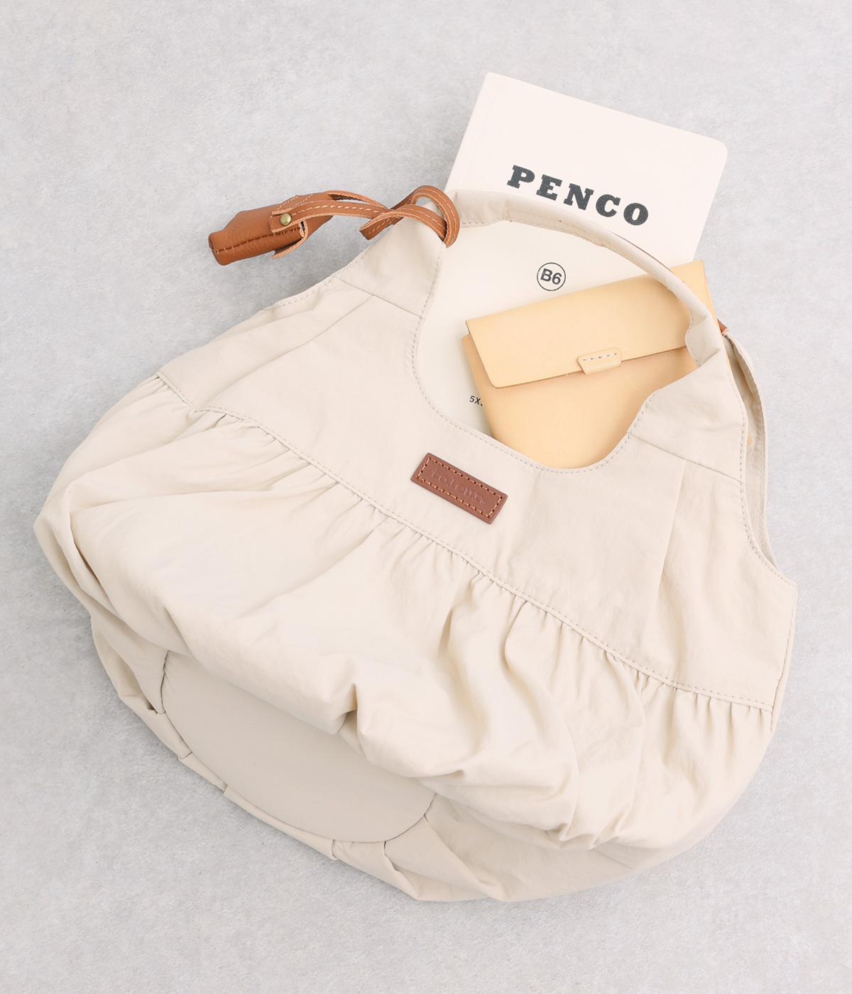カジュアルな雰囲気のナイロン素材にギャザーを寄せて大人らしい表情に仕上げました。やや大きめなサイズ感に内外にポケットを配して抜群の収納力。コロンとしたフォルムで、手持ちでも肘にかけても愛らしいアクセントになります。かわいらしく揺れるミニレザーポーチ付きです。