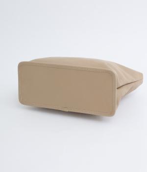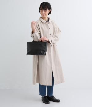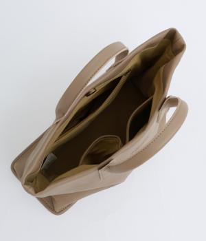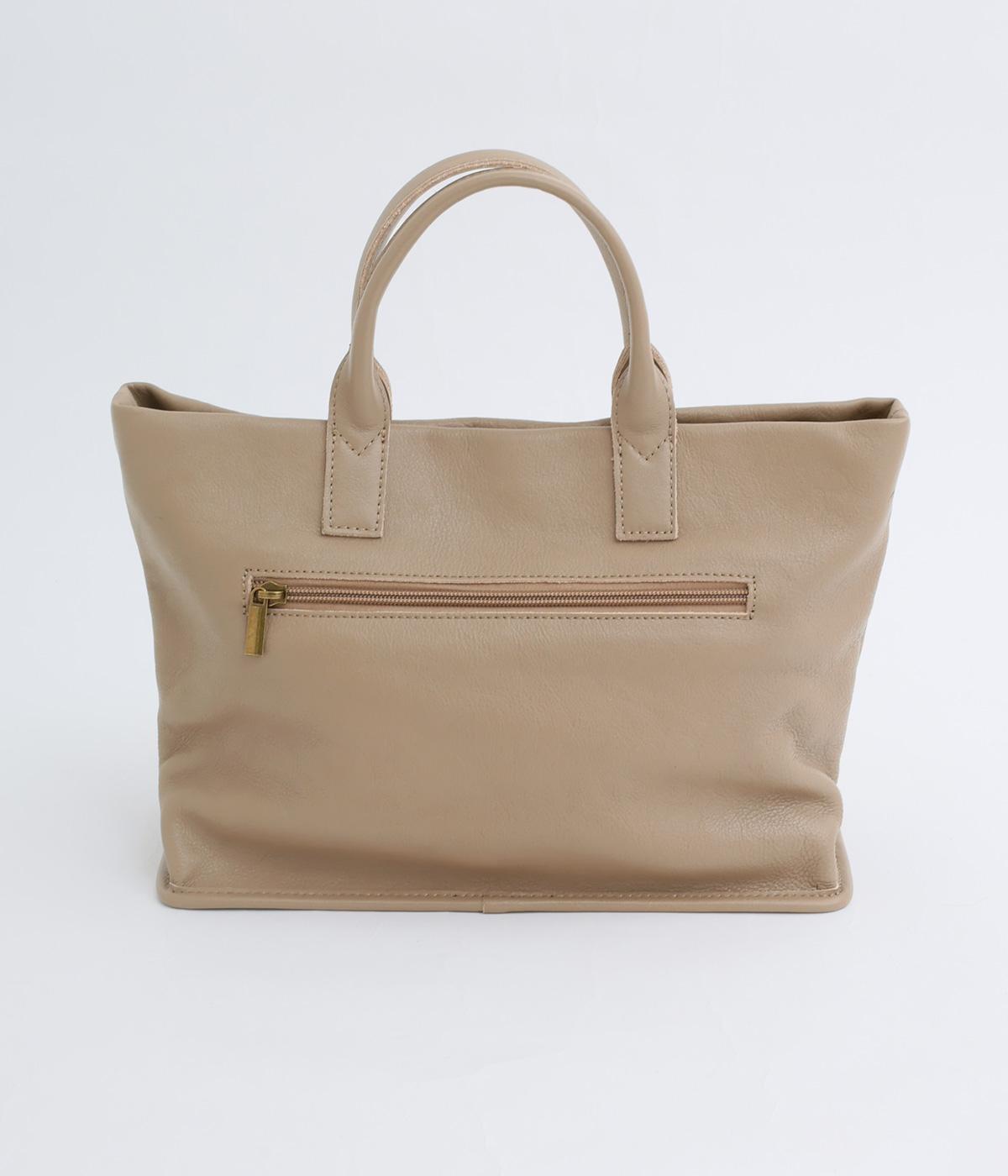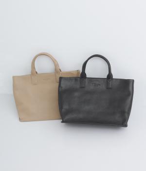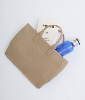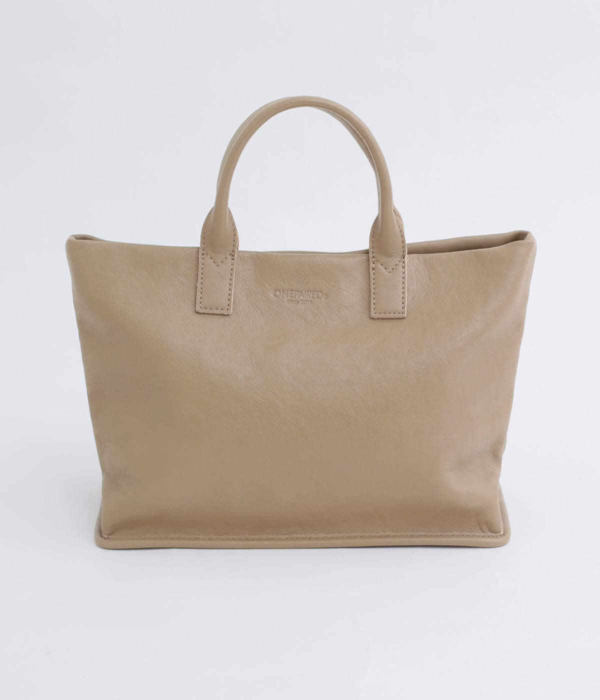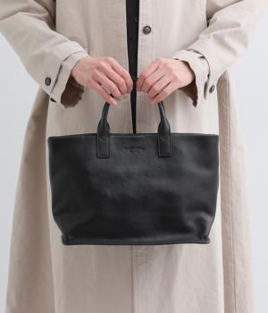 横広で収納力抜群のサイズ感です。内外にファスナー付きのポケットを配しました。しっかりしたマチがフォルムをきれいにキープします。上質な素材を引き立てるシンプルな型で、どんなスタイルにもマッチします。