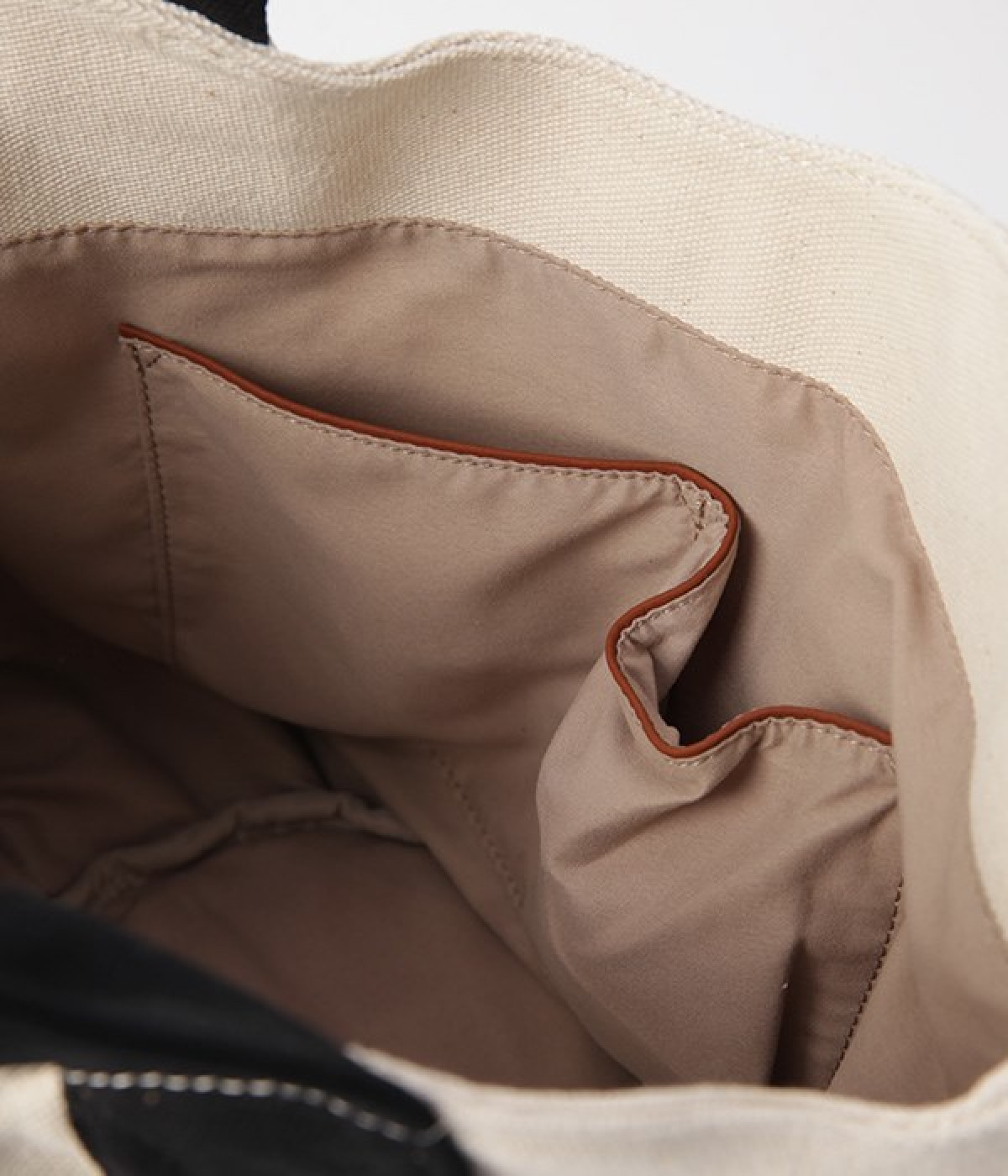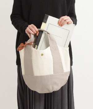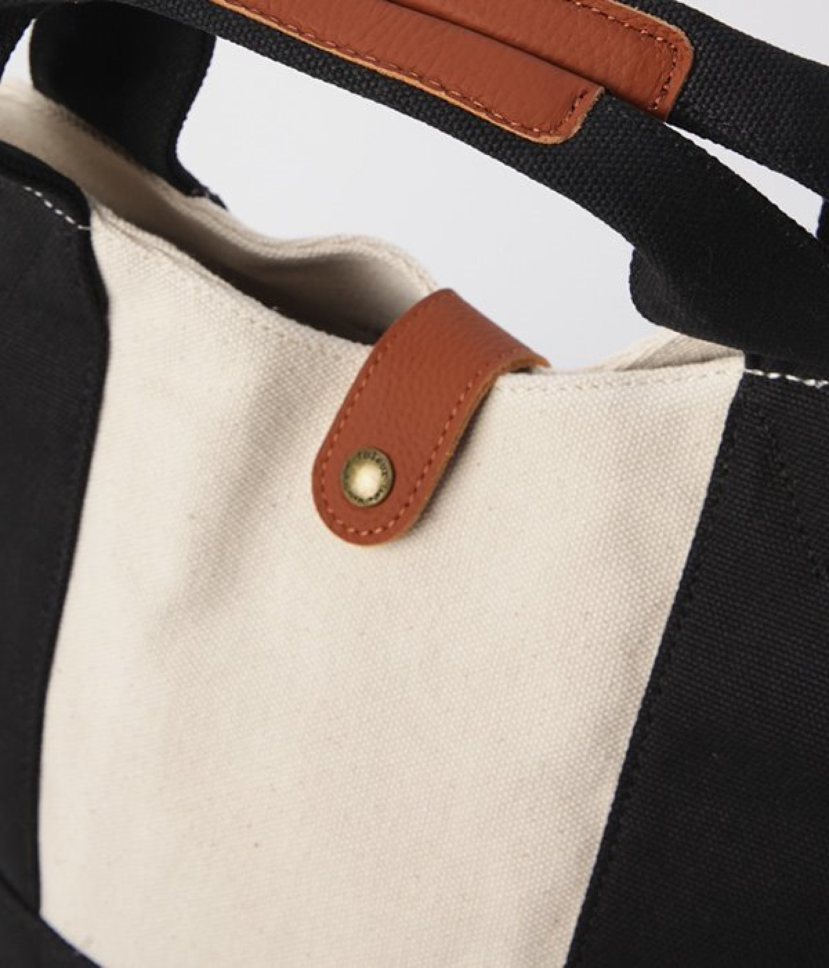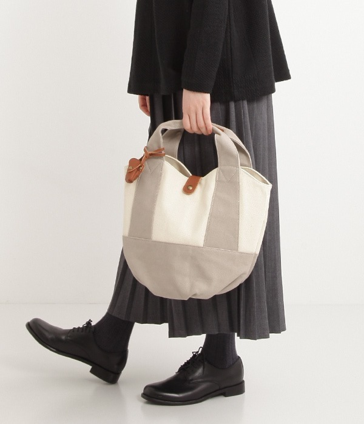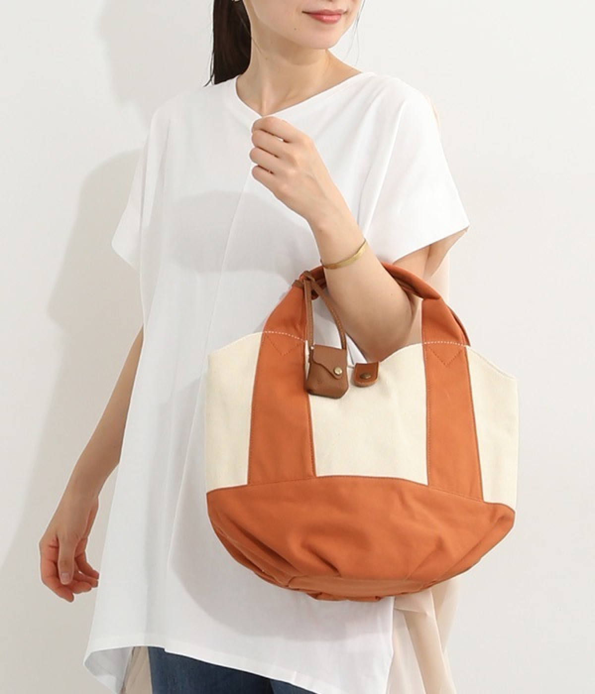 定番のキャンバス地トートバッグです。波打ったデザインの開閉口に、底板がタックの寄った丸みのある形で容量もたっぷり。内ポケットが充実していて使い勝手は抜群です。レザーのベルトボタンが大人らしいアクセントになっています。配色デザインもカジュアルで、デイリーに活躍するアイテムです。
