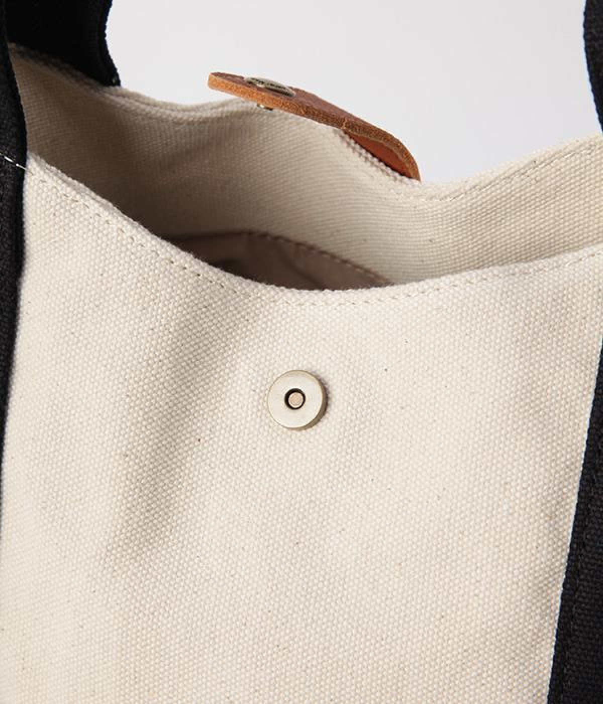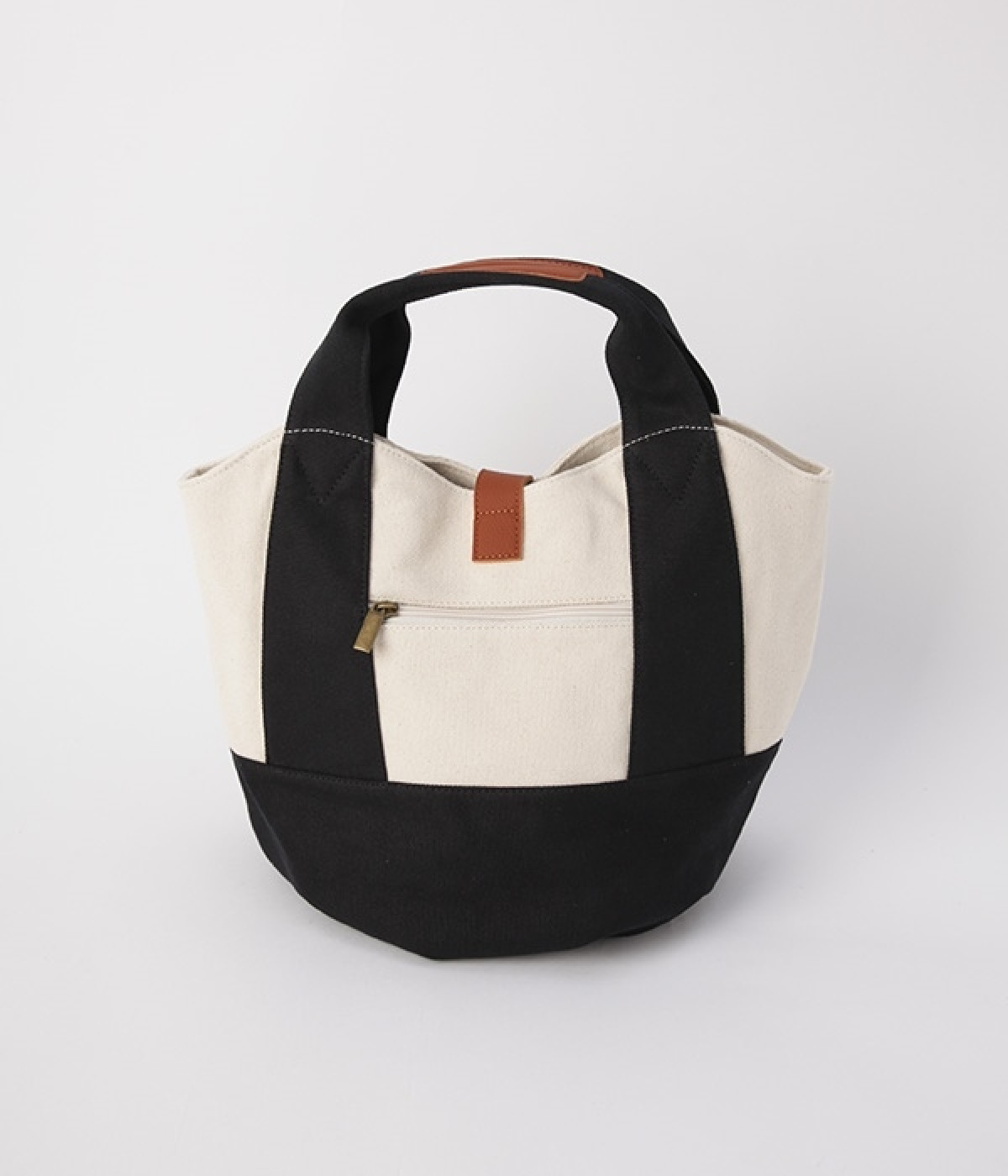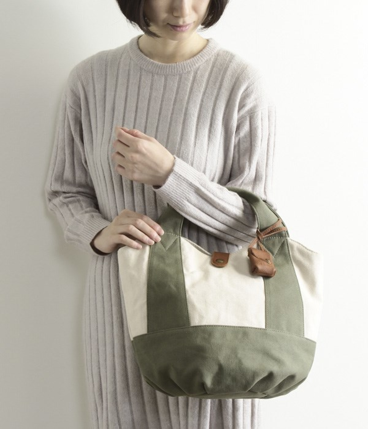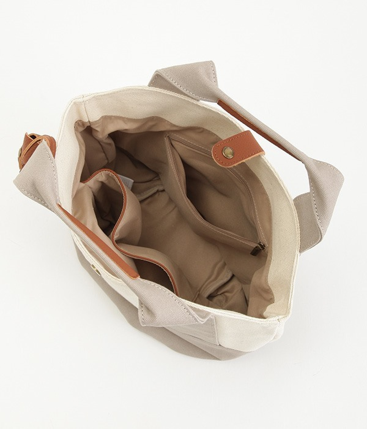 定番のキャンバス地トートバッグです。波打ったデザインの開閉口に、底板がタックの寄った丸みのある形で容量もたっぷり。内ポケットが充実していて使い勝手は抜群です。レザーのベルトボタンが大人らしいアクセントになっています。配色デザインもカジュアルで、デイリーに活躍するアイテムです。