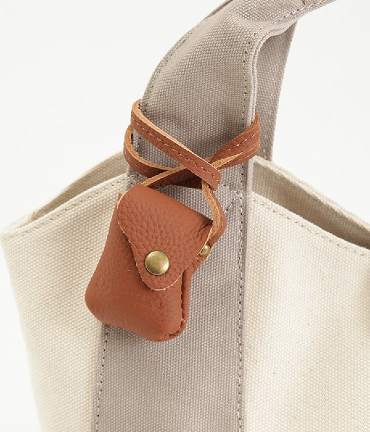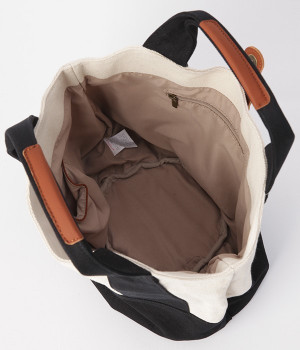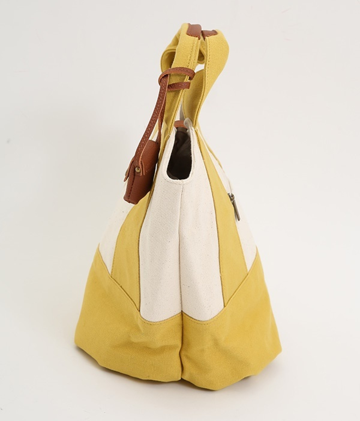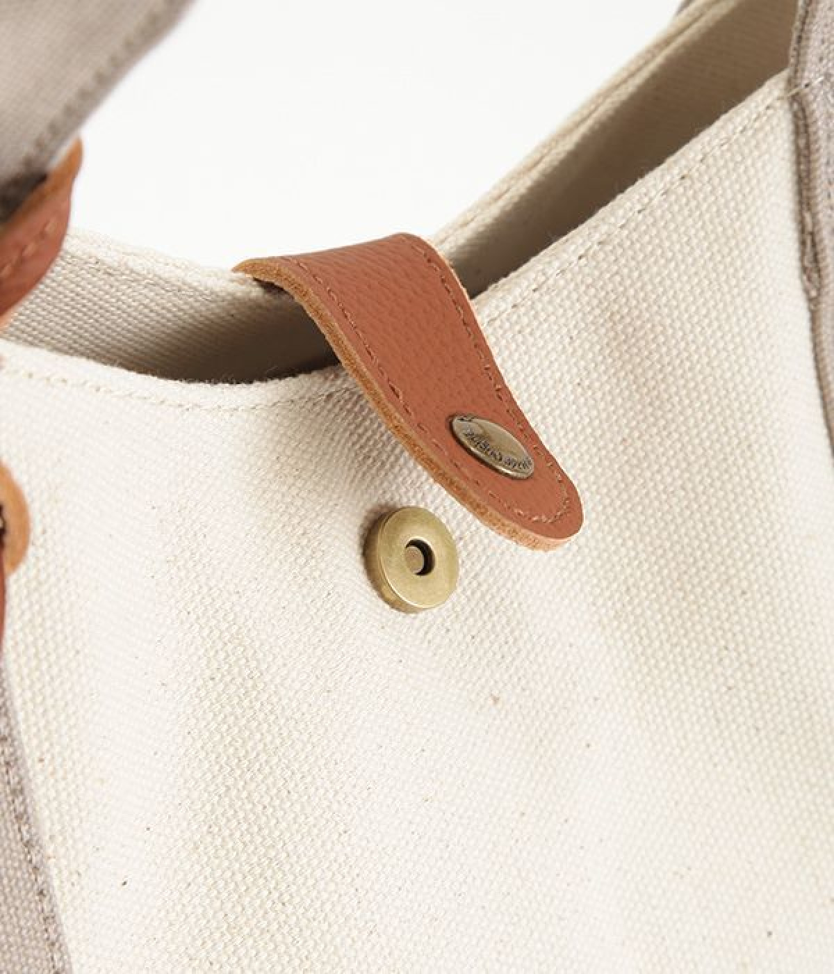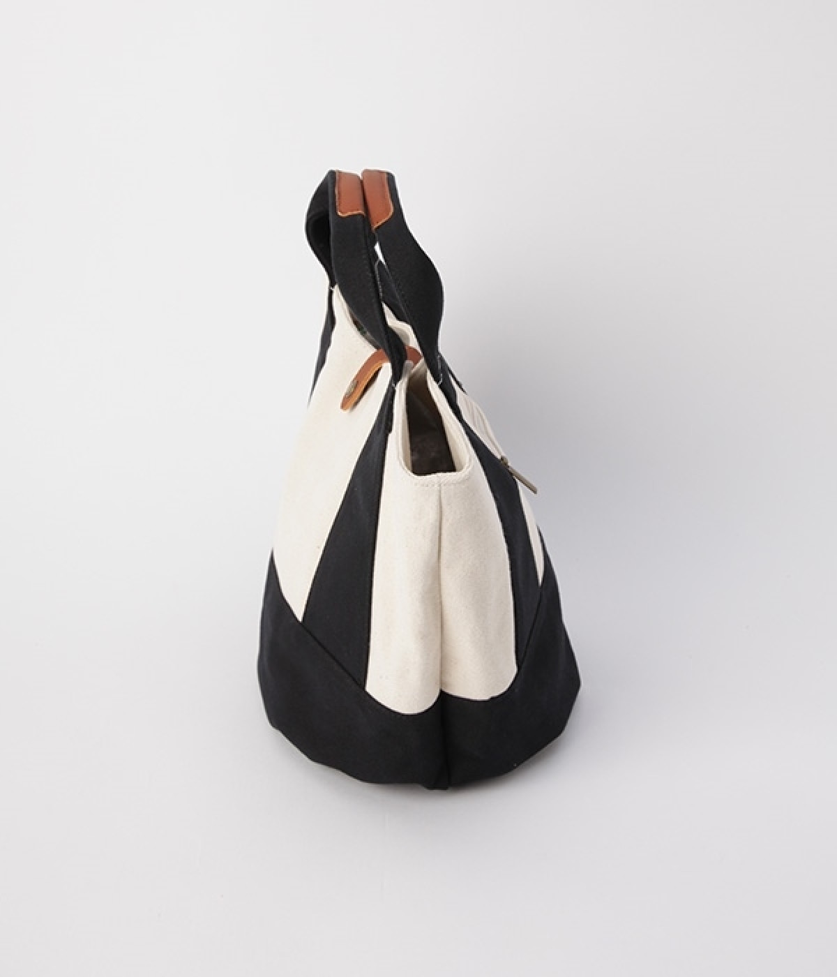 定番のキャンバス地トートバッグです。波打ったデザインの開閉口に、底板がタックの寄った丸みのある形で容量もたっぷり。内ポケットが充実していて使い勝手は抜群です。レザーのベルトボタンが大人らしいアクセントになっています。配色デザインもカジュアルで、デイリーに活躍するアイテムです。