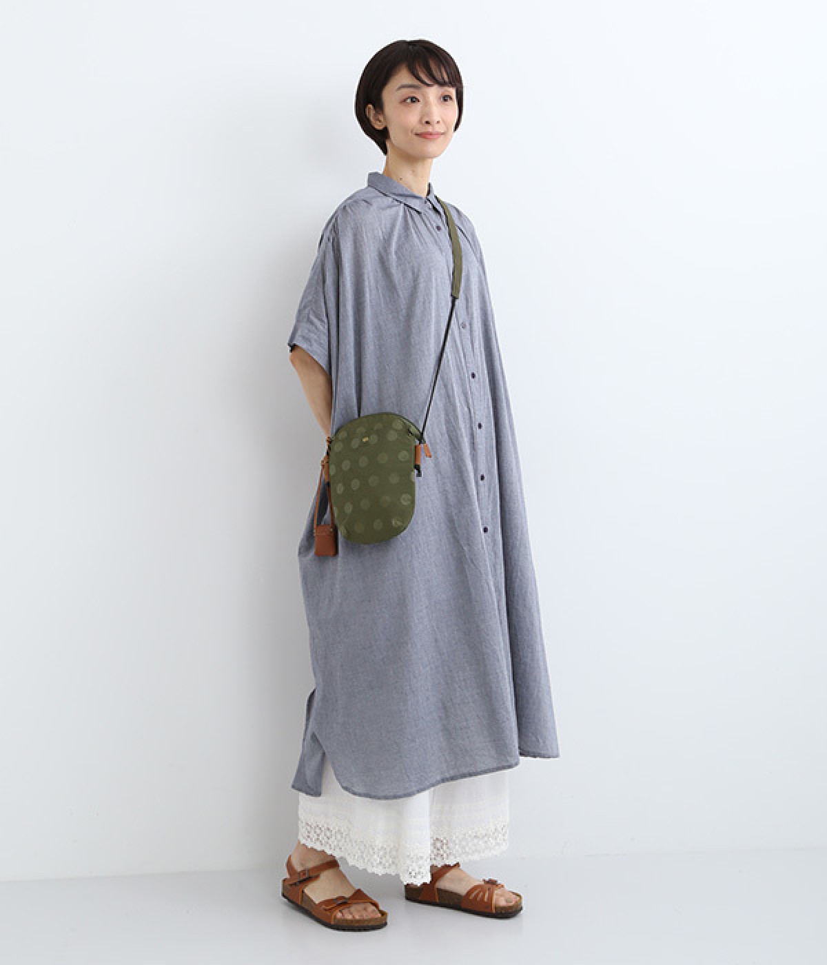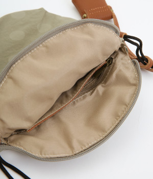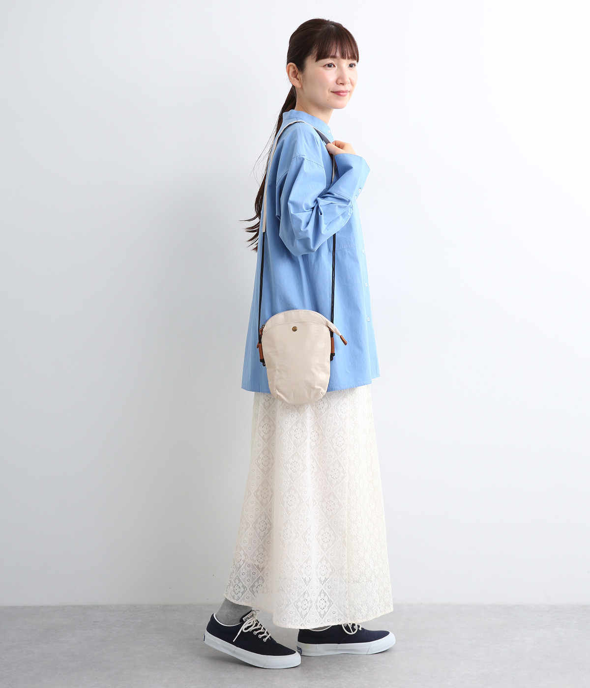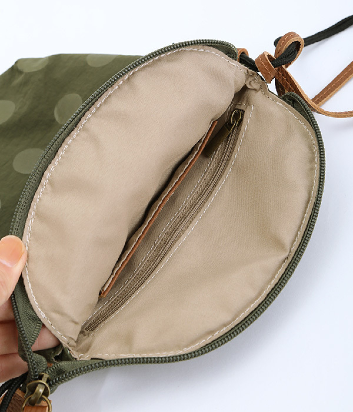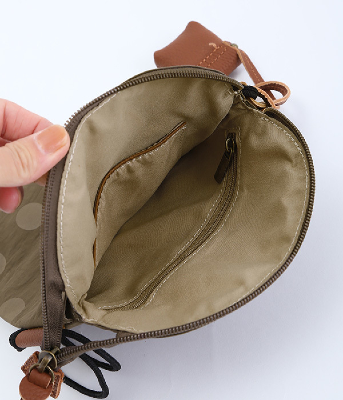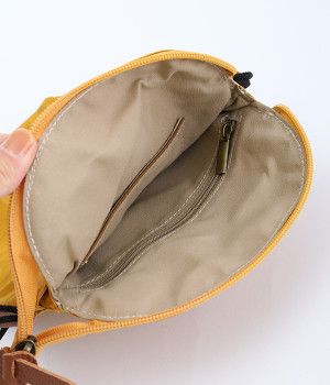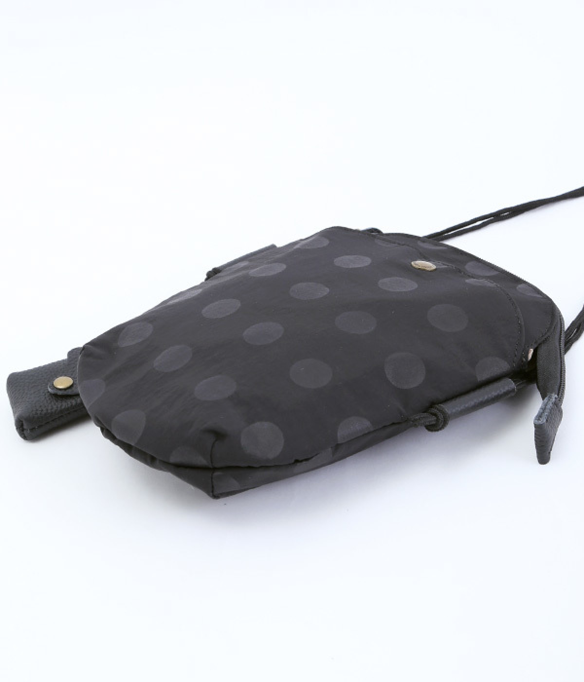 レザー仕立てのかわいらしいミニポーチがポイントに