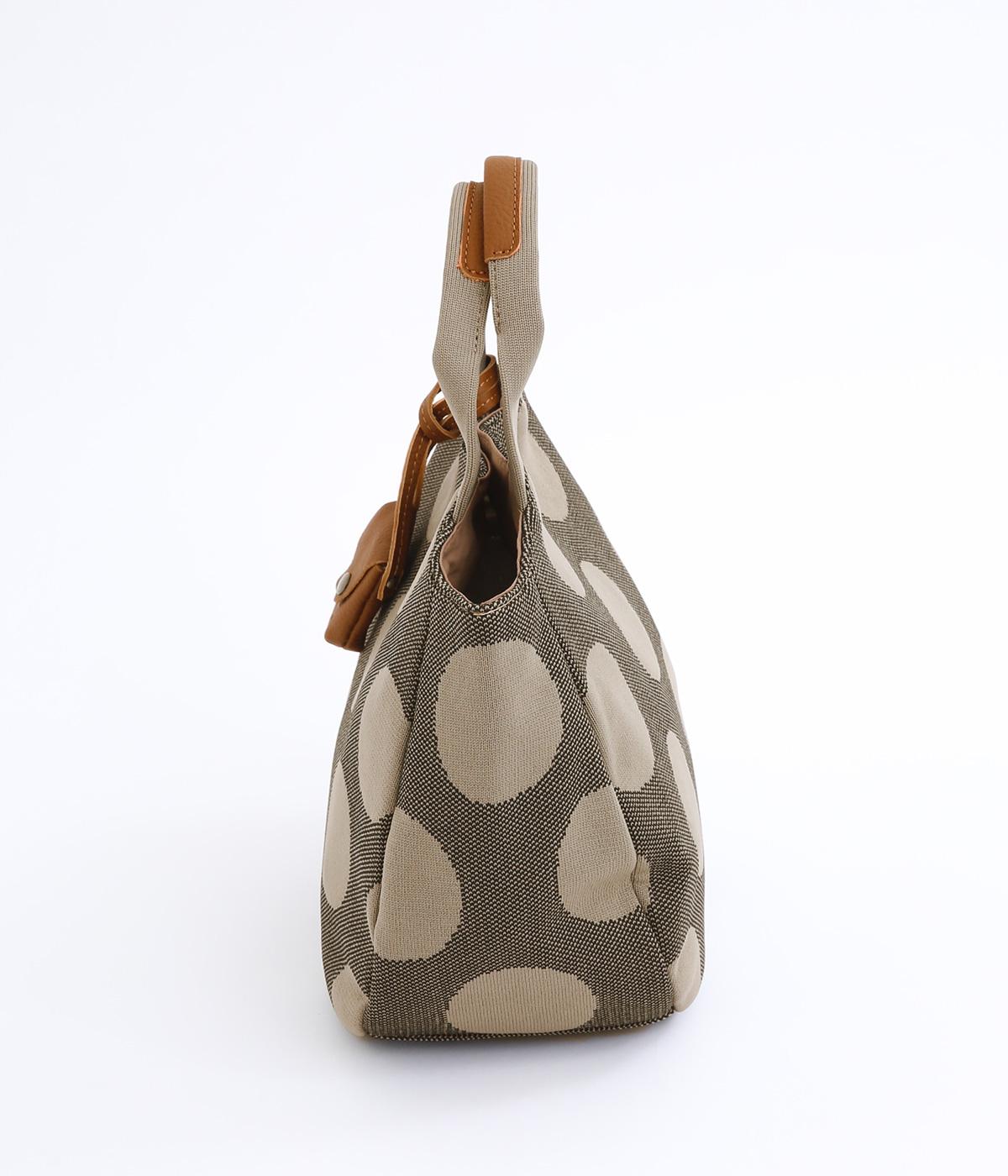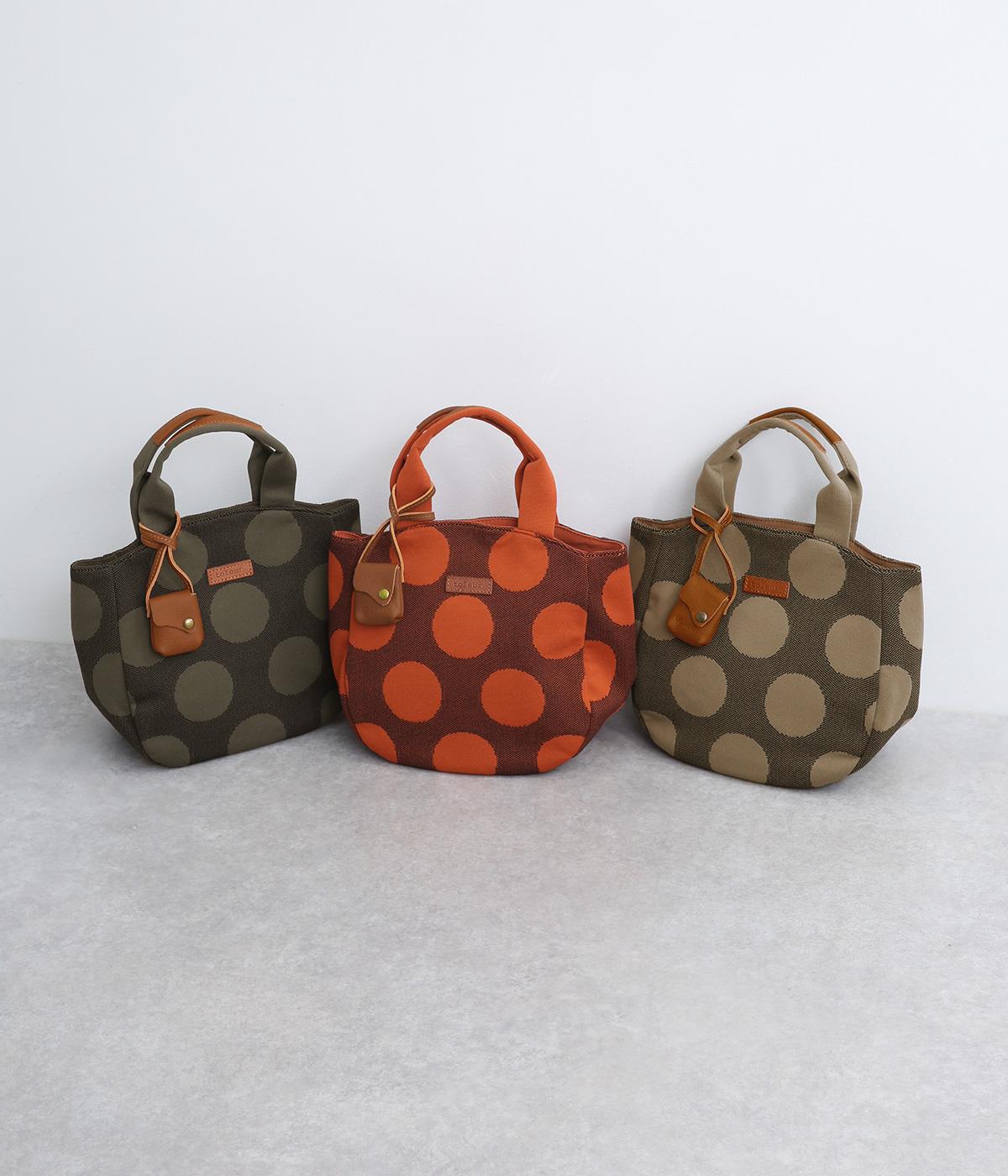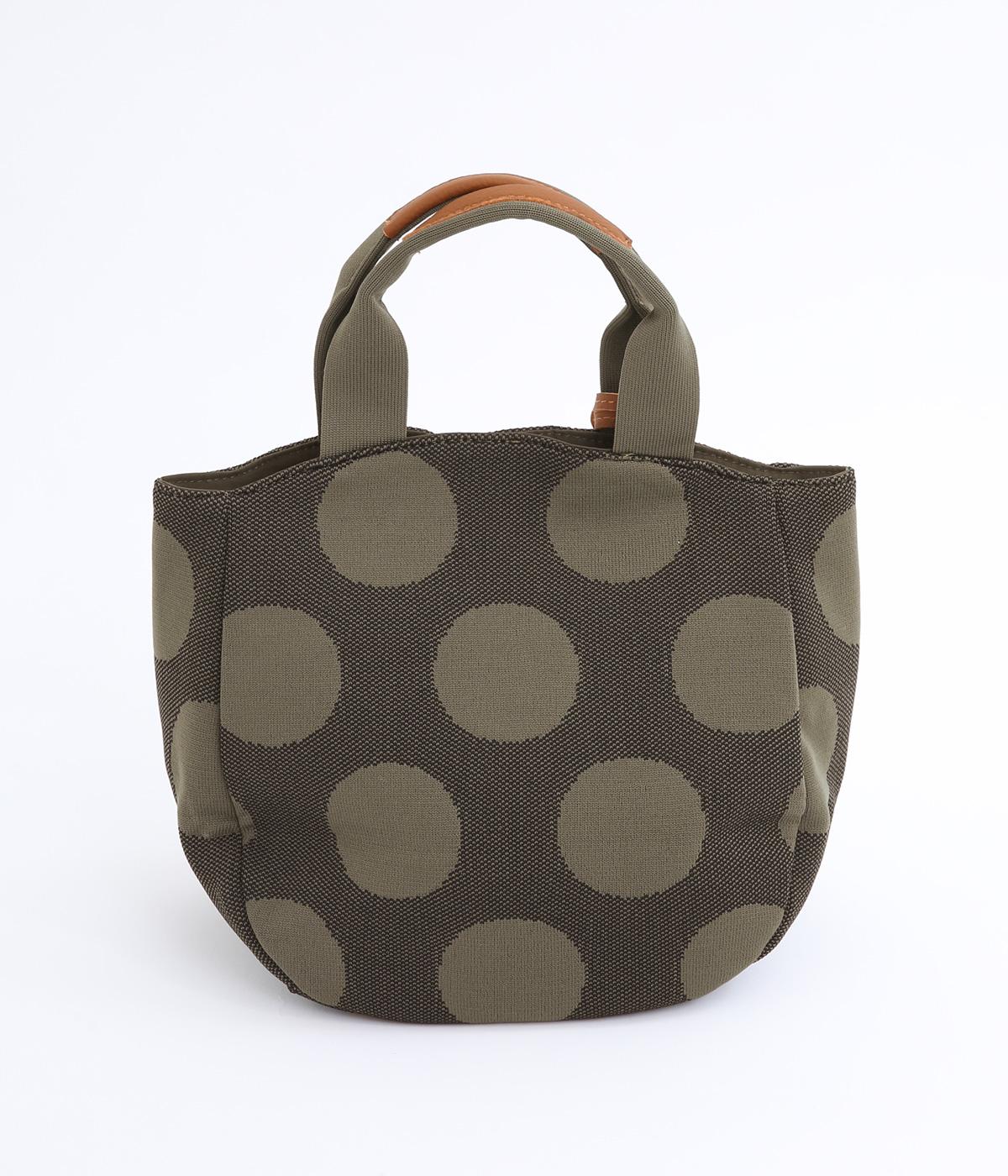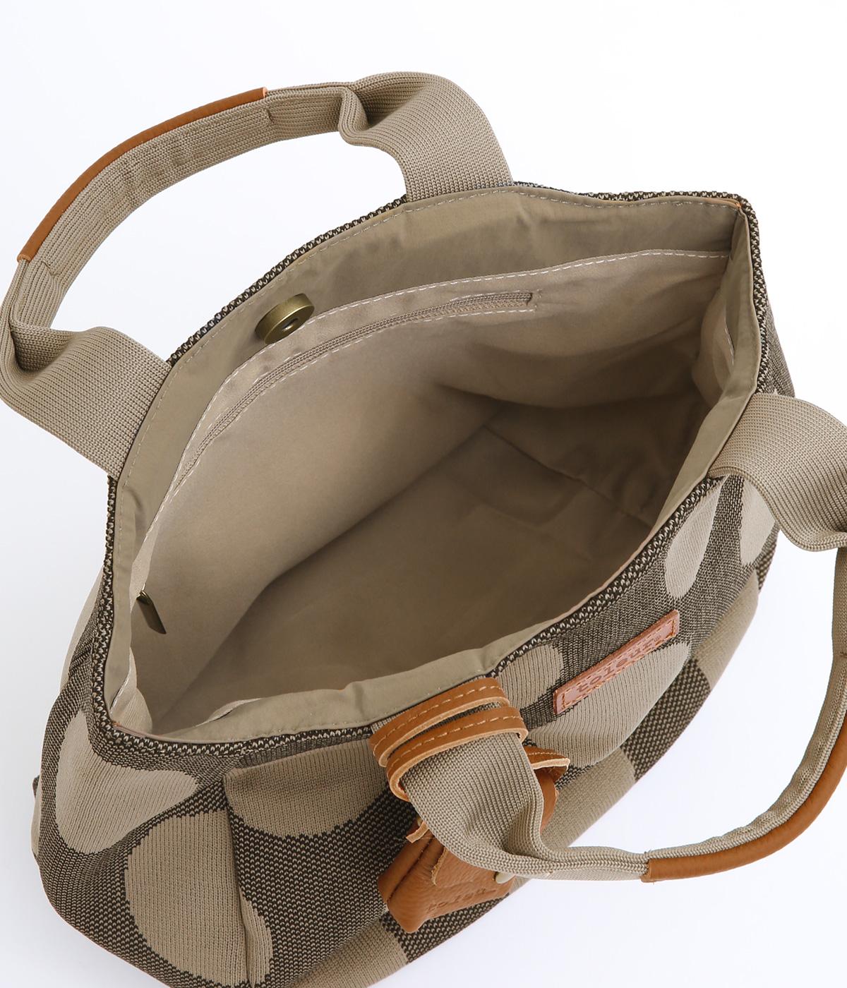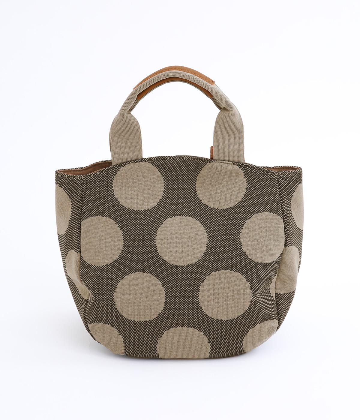 ドット柄に編み込んだポリエステルニット素材がスタイリングを盛り上げてくれます。パーツに牛革を配することで、カジュアルに寄りすぎず大人顔に。裏布もあてて強度&使い勝手の良さを高めました。