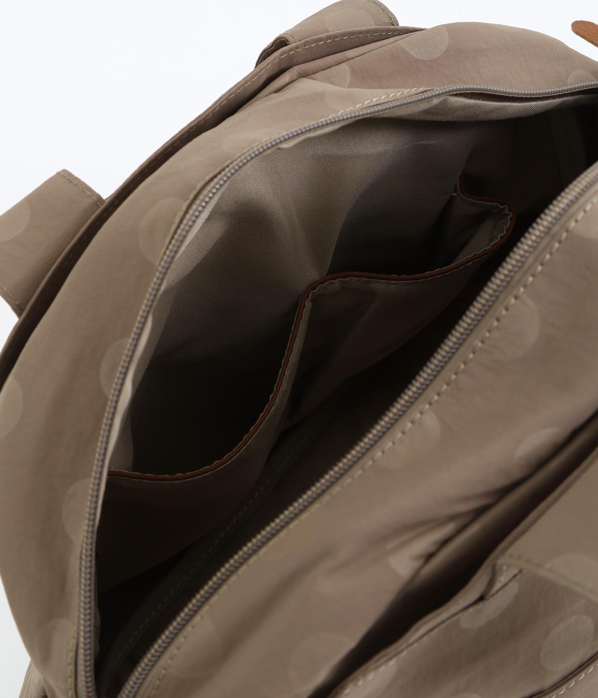 さらりとした撥水ナイロン生地を使用しています。大人かわいいさりげないドット柄と、細かなパーツに用いられた品の良いレザーがマッチ。コーディネートになじみやすく、適度なアクセントを与えてくれます。
