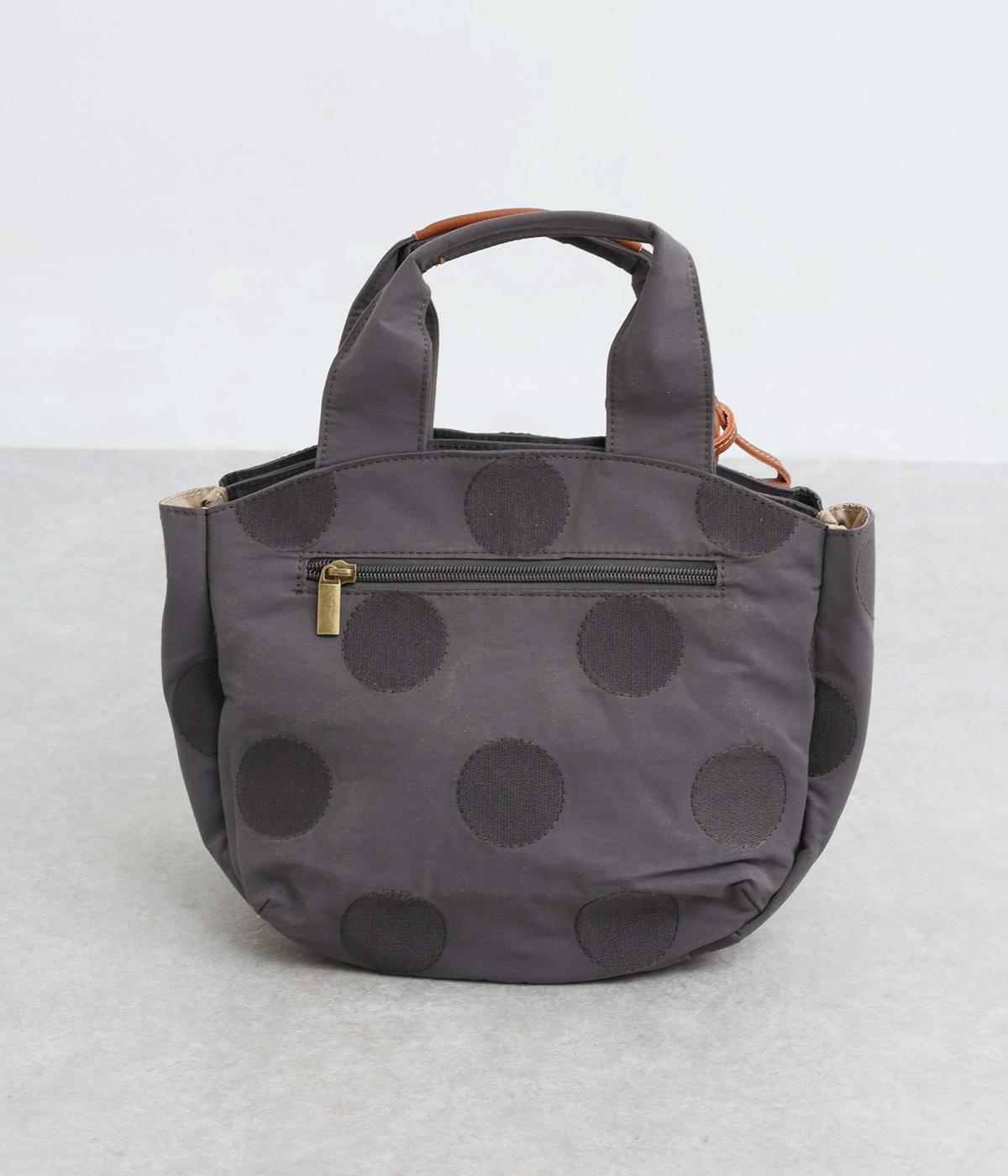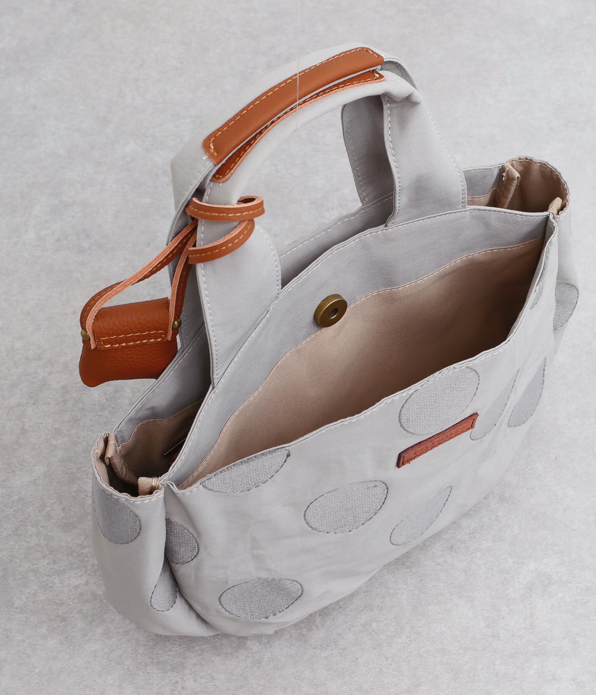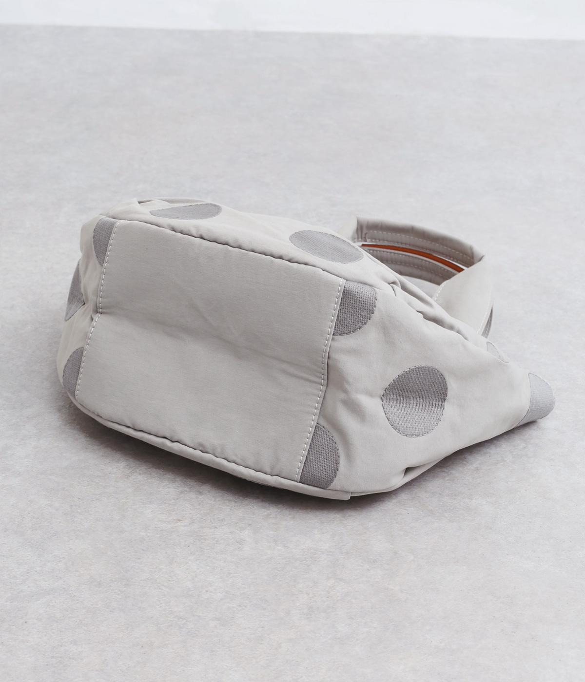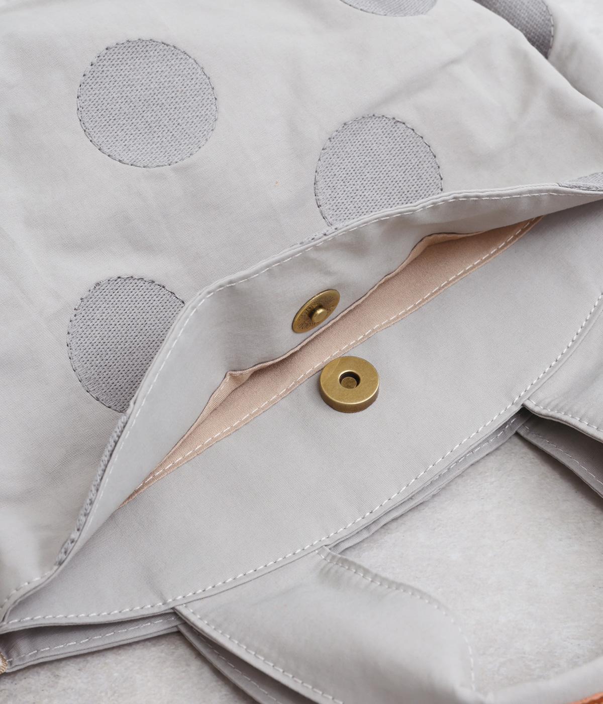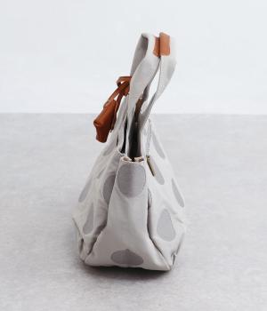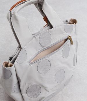 撥水加工をほどこしたナイロン生地に同系色のドット柄を刺しゅうで立体的にあしらいました。淡いコントラストが大人な表情です。持ち手部分には牛革を合わせて上品な雰囲気に仕上げました。