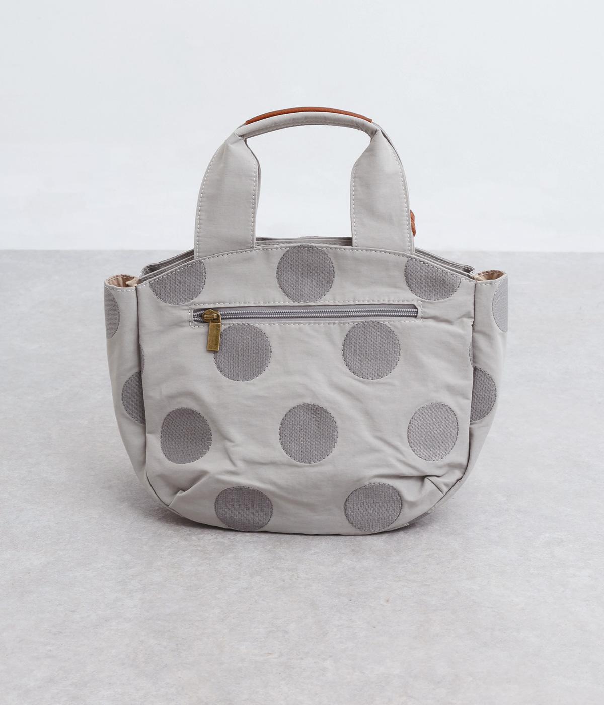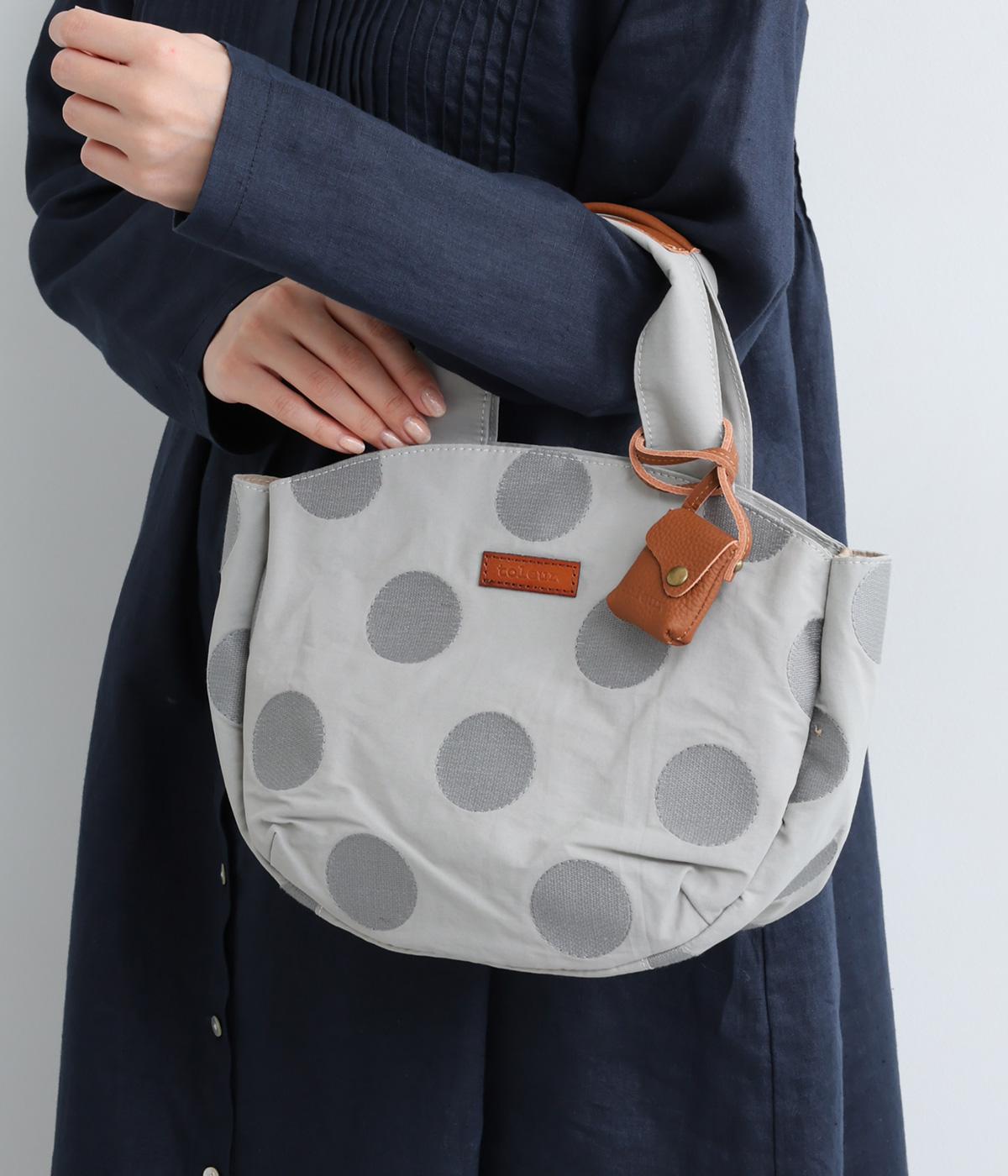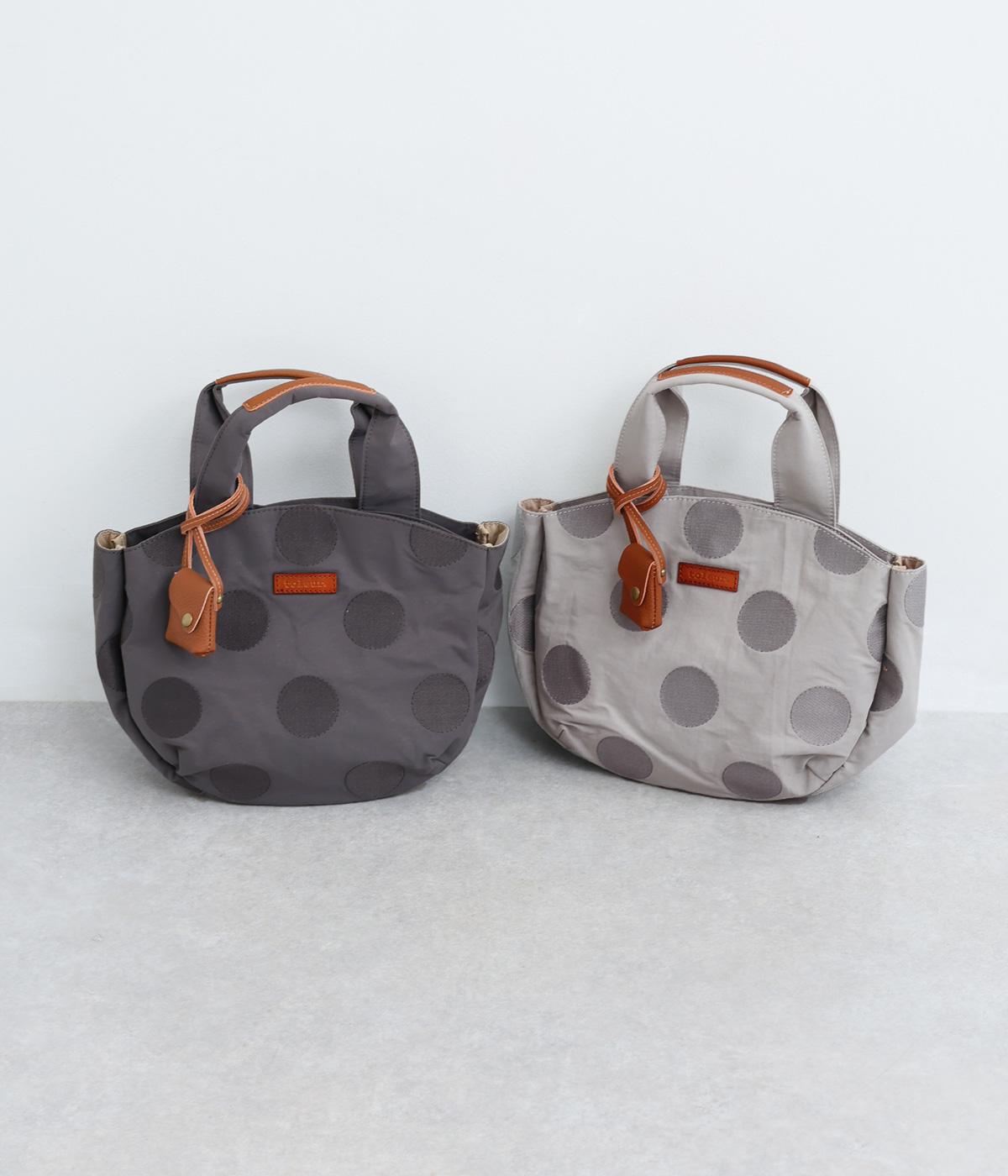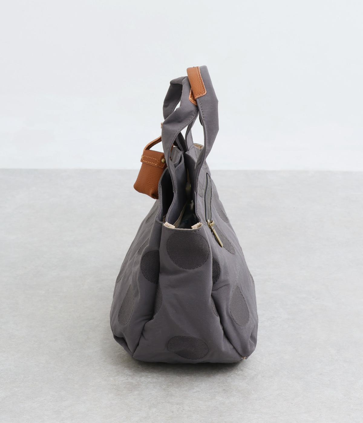 撥水加工をほどこしたナイロン生地に同系色のドット柄を刺しゅうで立体的にあしらいました。淡いコントラストが大人な表情です。持ち手部分には牛革を合わせて上品な雰囲気に仕上げました。