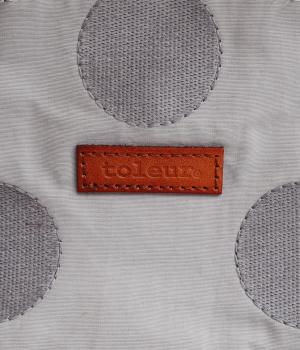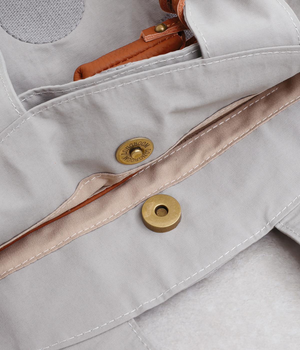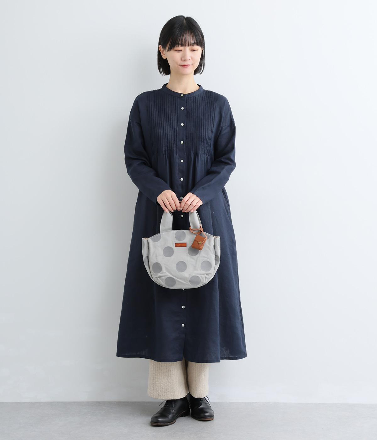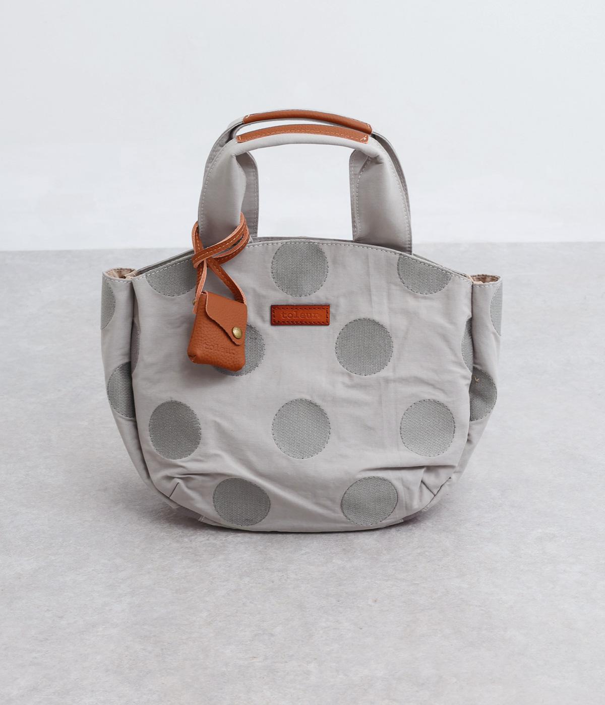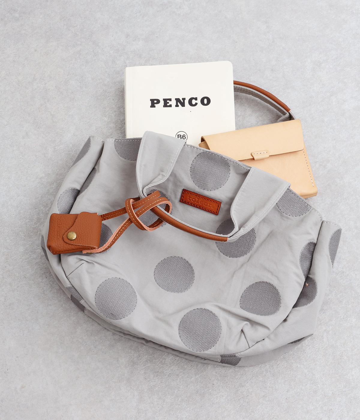撥水加工をほどこしたナイロン生地に同系色のドット柄を刺しゅうで立体的にあしらいました。淡いコントラストが大人な表情です。持ち手部分には牛革を合わせて上品な雰囲気に仕上げました。