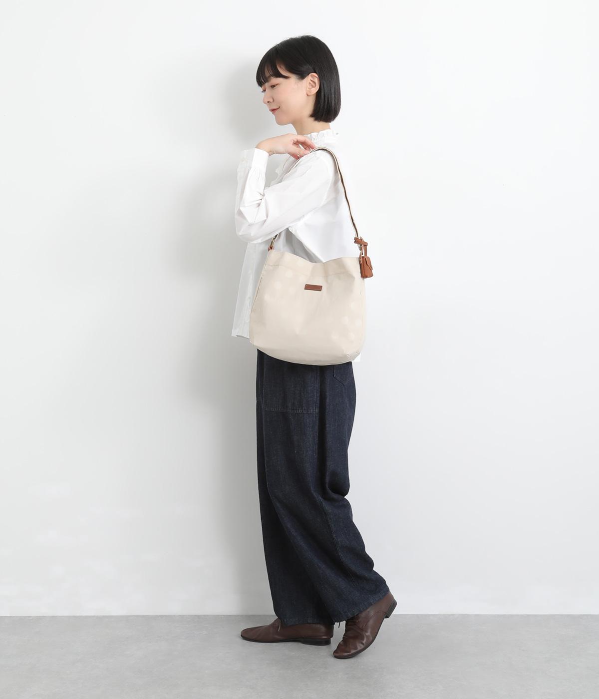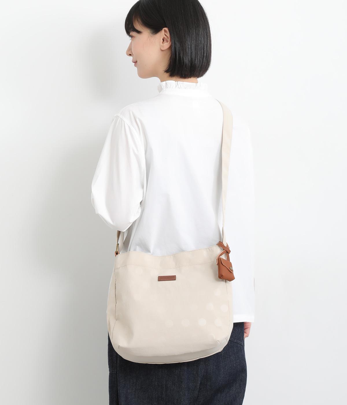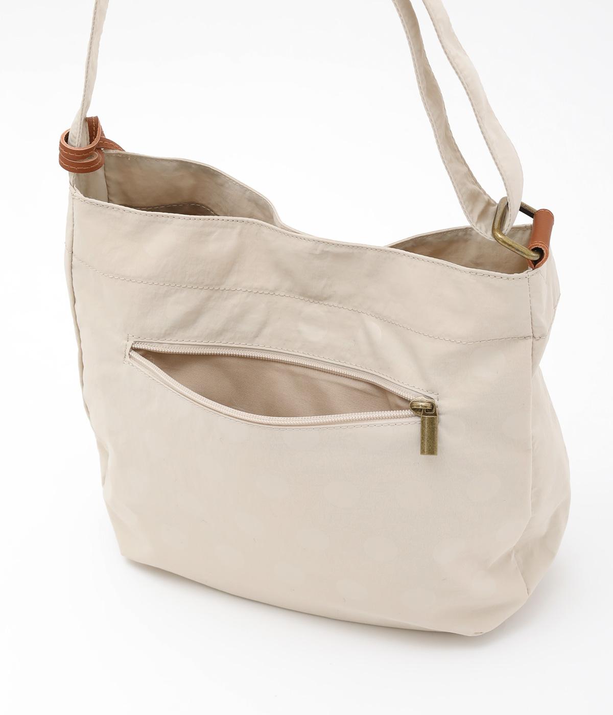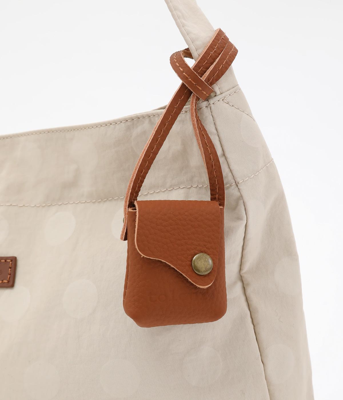 ひかえめな光沢のあるドットプリントが、さりげないアクセントに。落ち着いた雰囲気で、大人の装いにも合わせやすいデザインです。3つの内ポケットと外ポケットがついているので、小物もすっきり整理できます。ミニレザーポーチがさりげないポイントとなり、使うたびに愛着が深まるバッグです。
