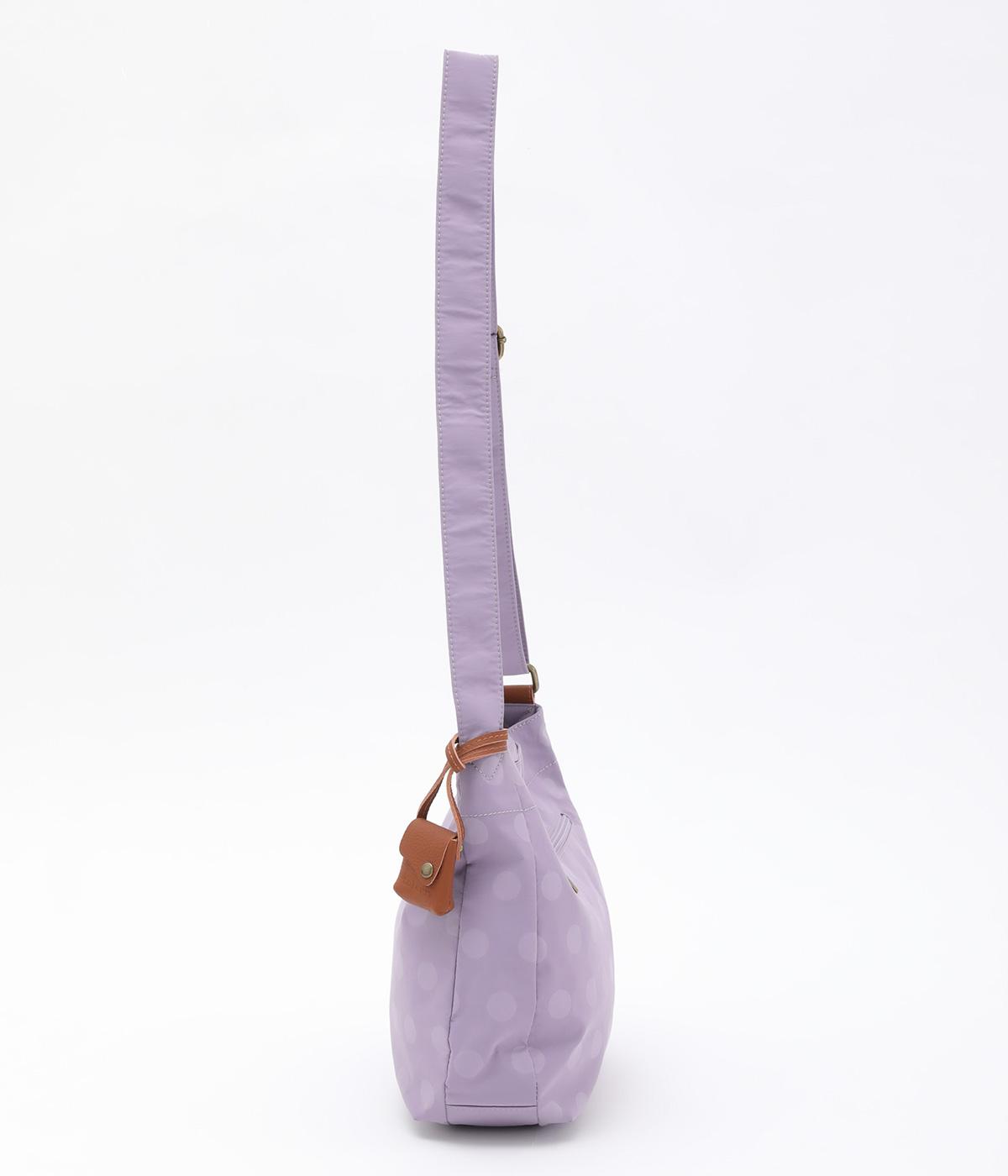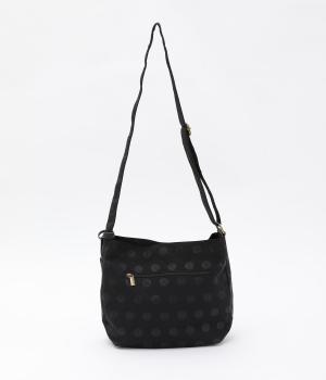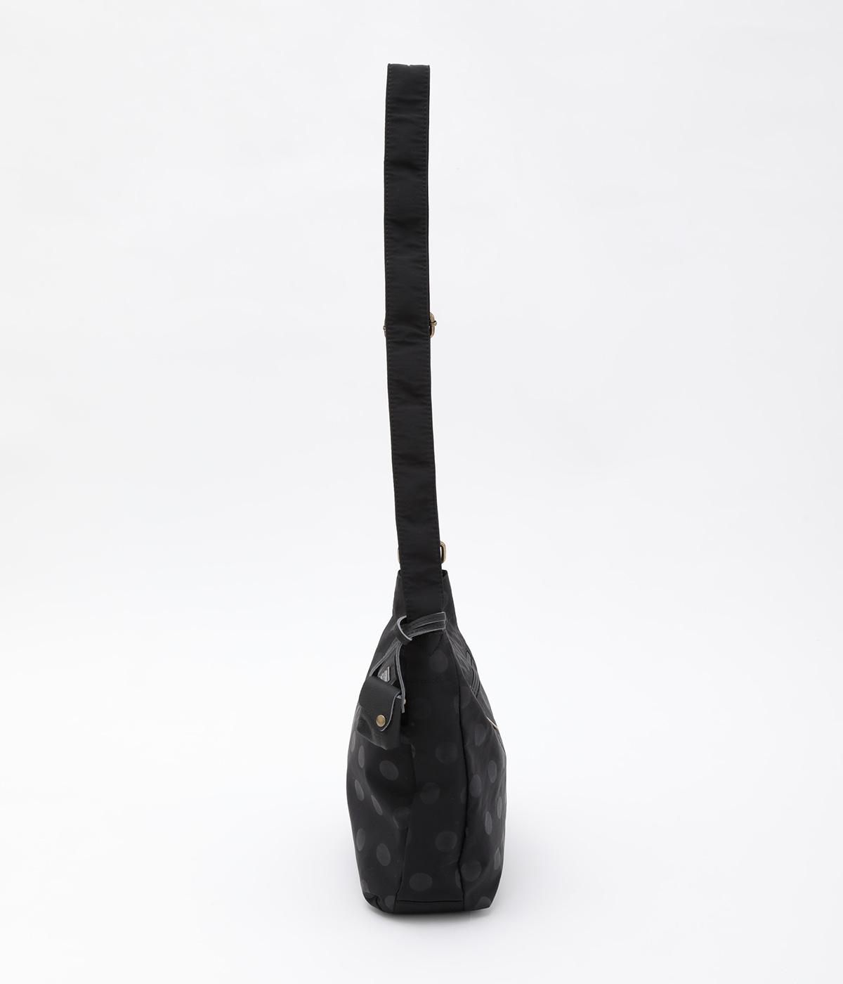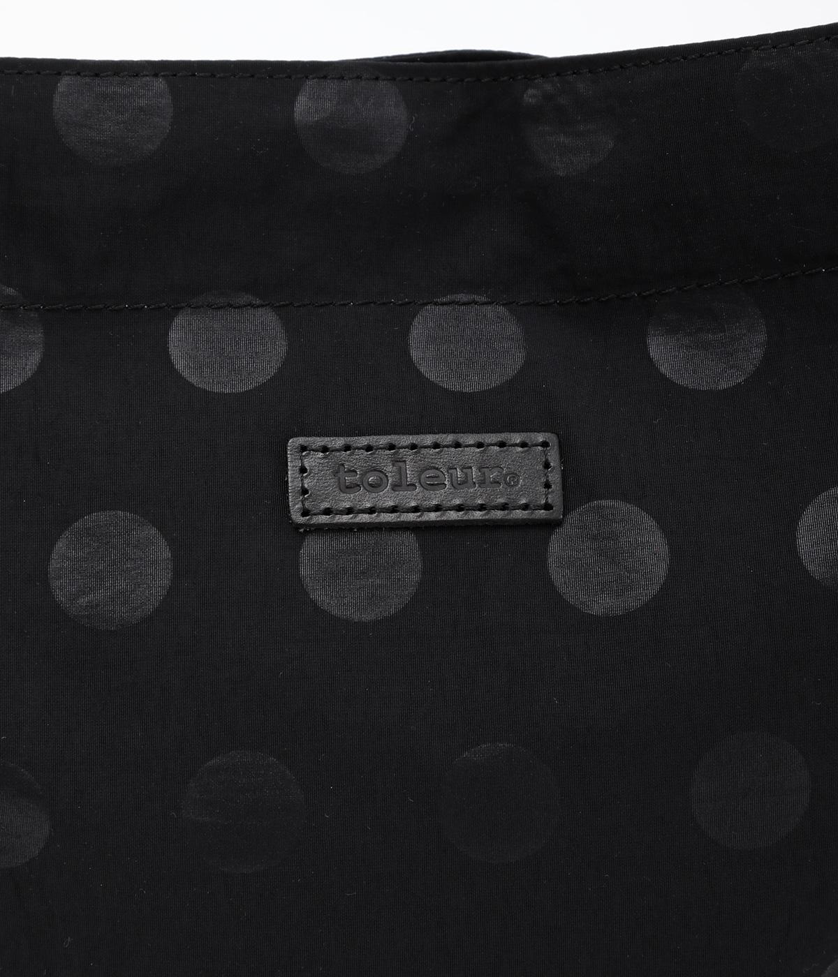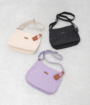 ひかえめな光沢のあるドットプリントが、さりげないアクセントに。落ち着いた雰囲気で、大人の装いにも合わせやすいデザインです。3つの内ポケットと外ポケットがついているので、小物もすっきり整理できます。ミニレザーポーチがさりげないポイントとなり、使うたびに愛着が深まるバッグです。