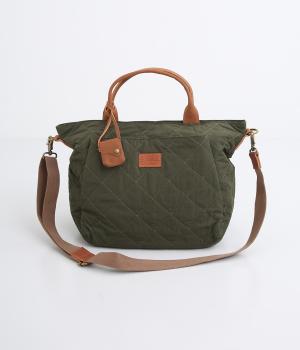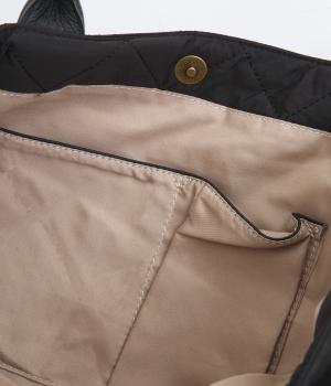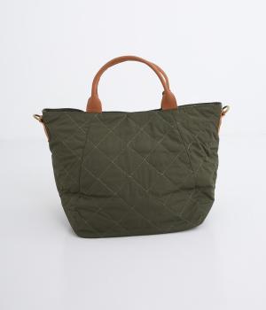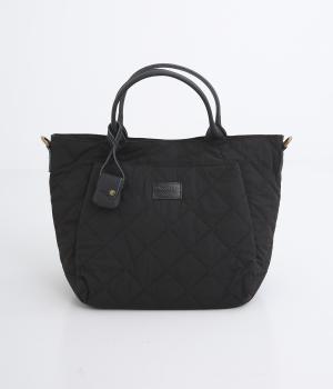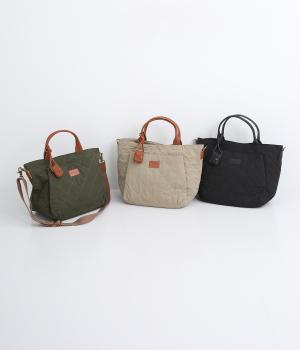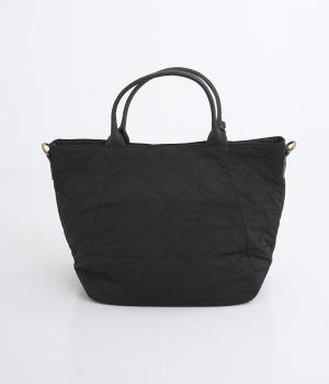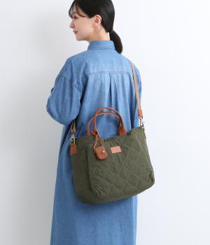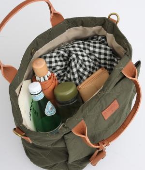 キルティングに牛革のアクセントが効いた横長バッグです。長さ調整・取り外し可能なショルダーベルトがついており、トートバックとしてもショルダーとしても使えます。A4サイズも入り、両サイドやフロントにもポケットつきで収納力も抜群です。