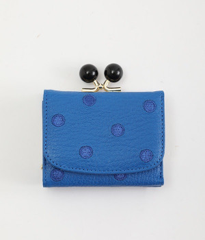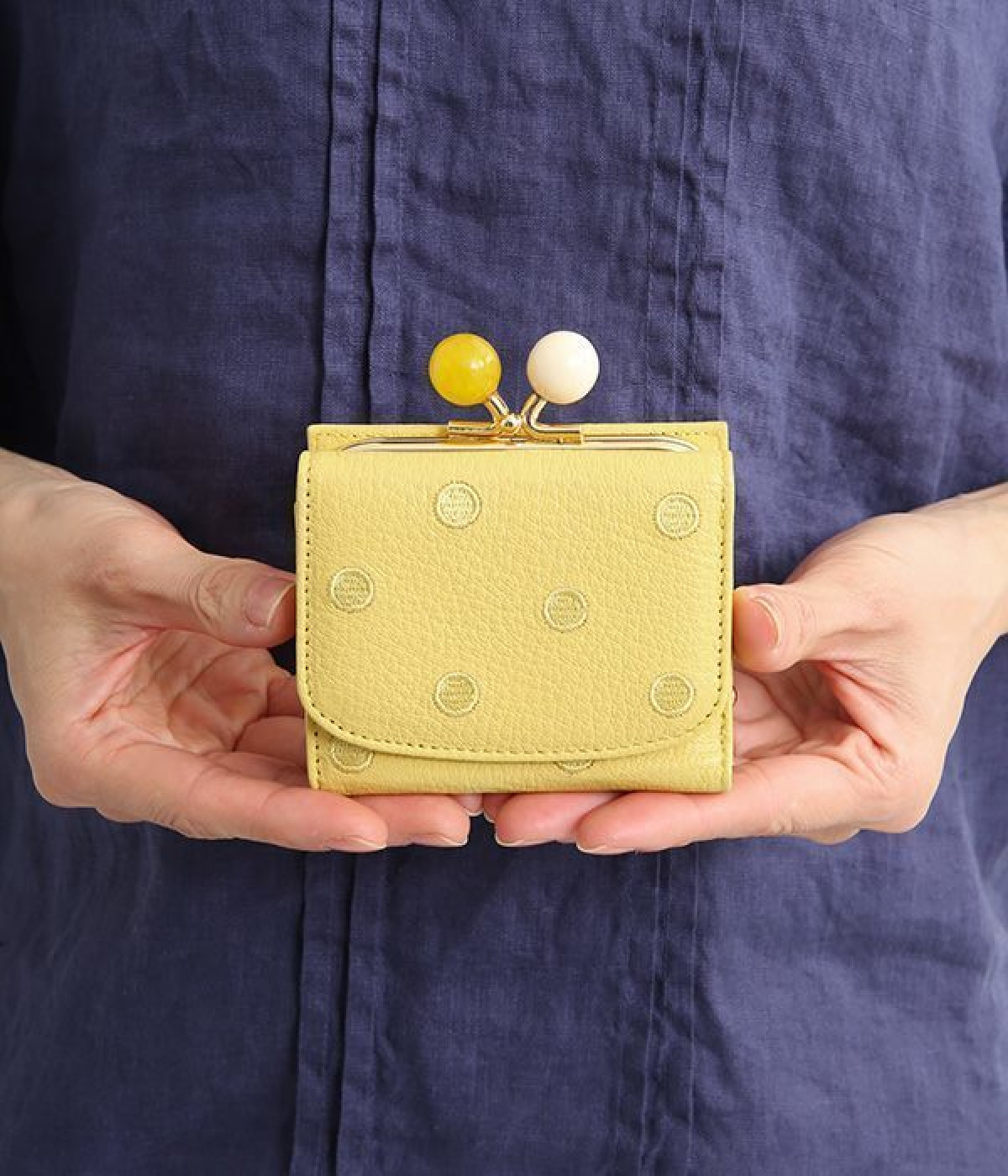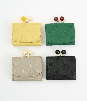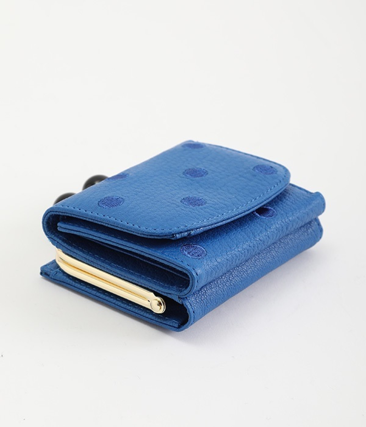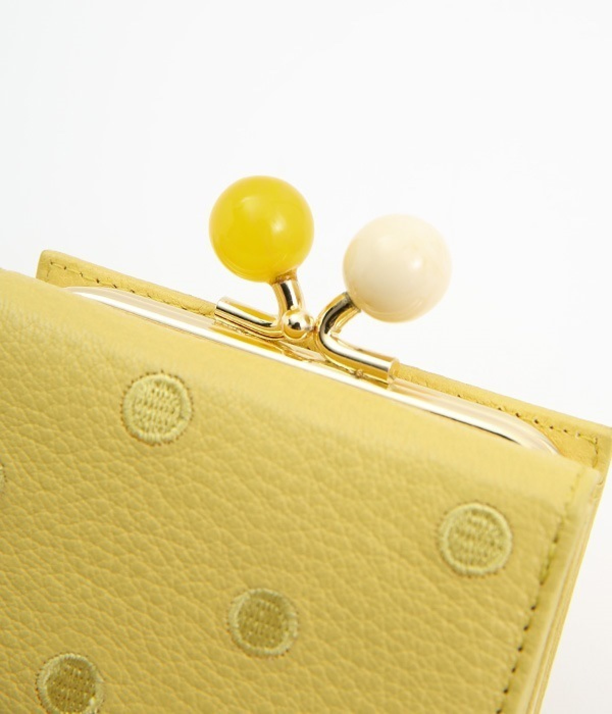 ふんわりとした手触りの山羊革に、ドットの刺しゅうをあしらって可愛らしく仕上げました。中の裏地にもドット柄が入っています。ゴールド金具とがま口部分のアクリル玉がアクセント。