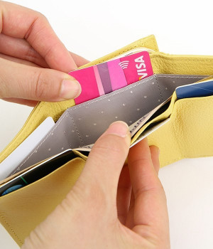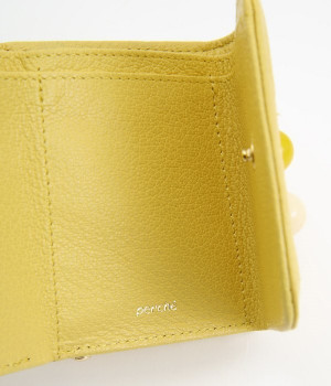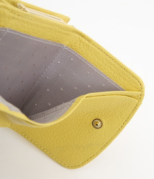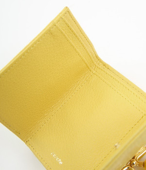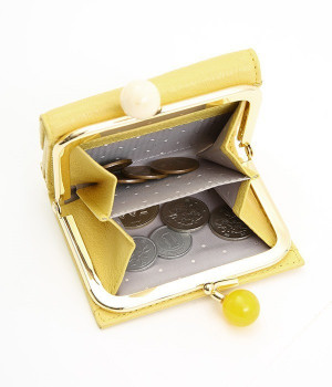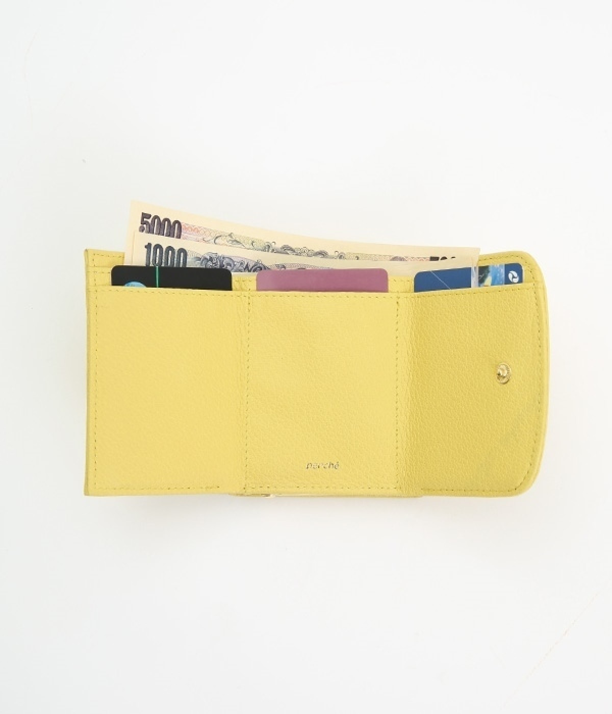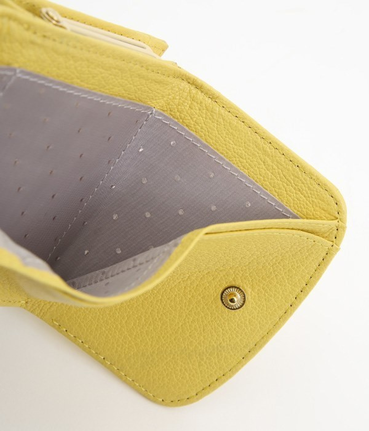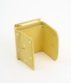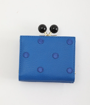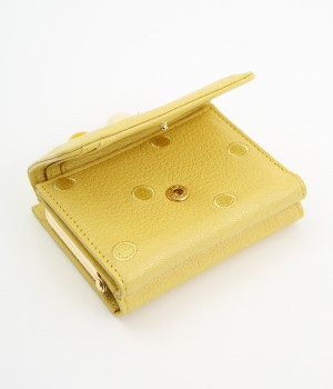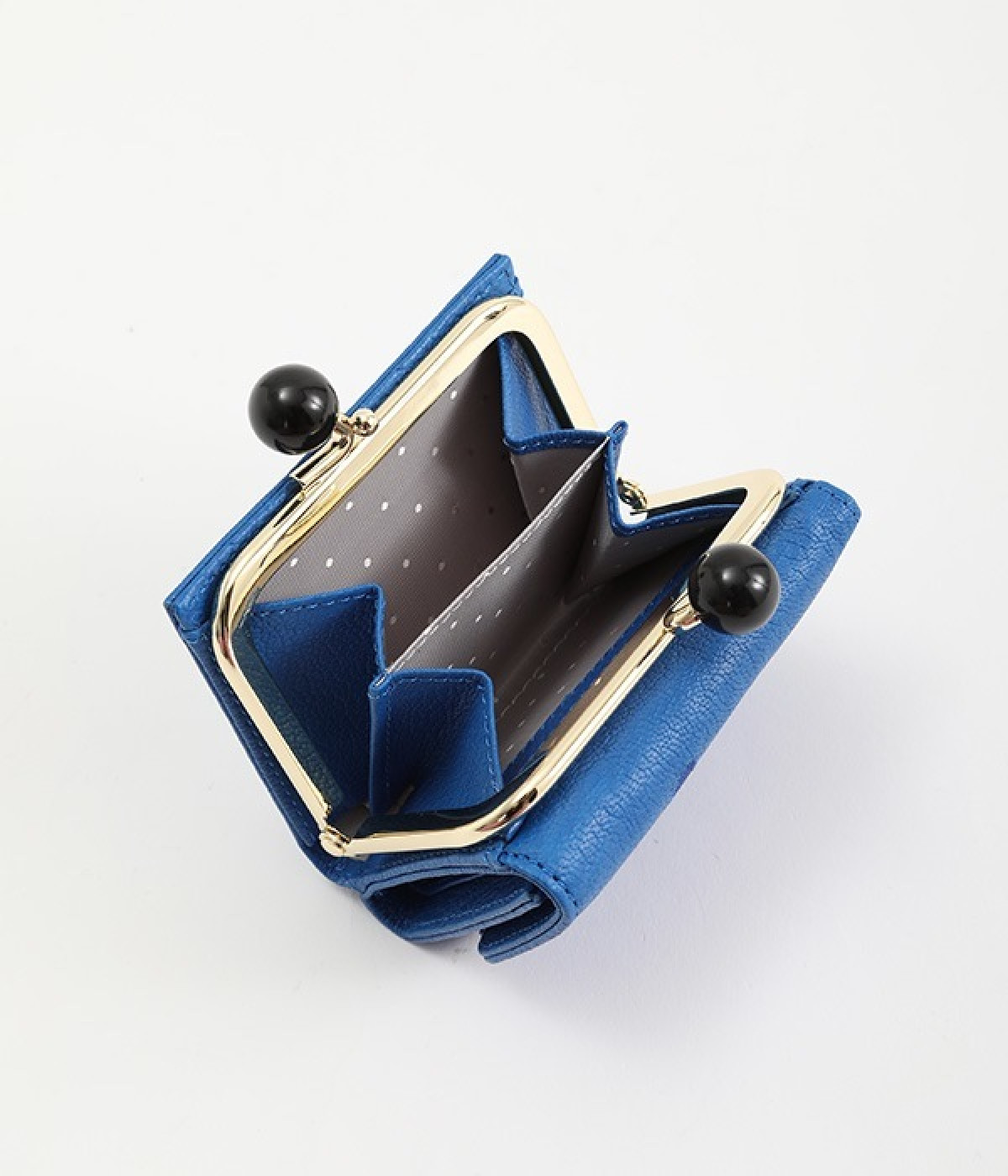 ドット柄とがま口のアクリル玉がかわいい三つ折り財布です。持ち歩きやすいコンパクトなサイズ感ながら、ホックを開けるとカード入れが6か所、お札入れや小銭入れも完備。しっかりと収納力を備えています。