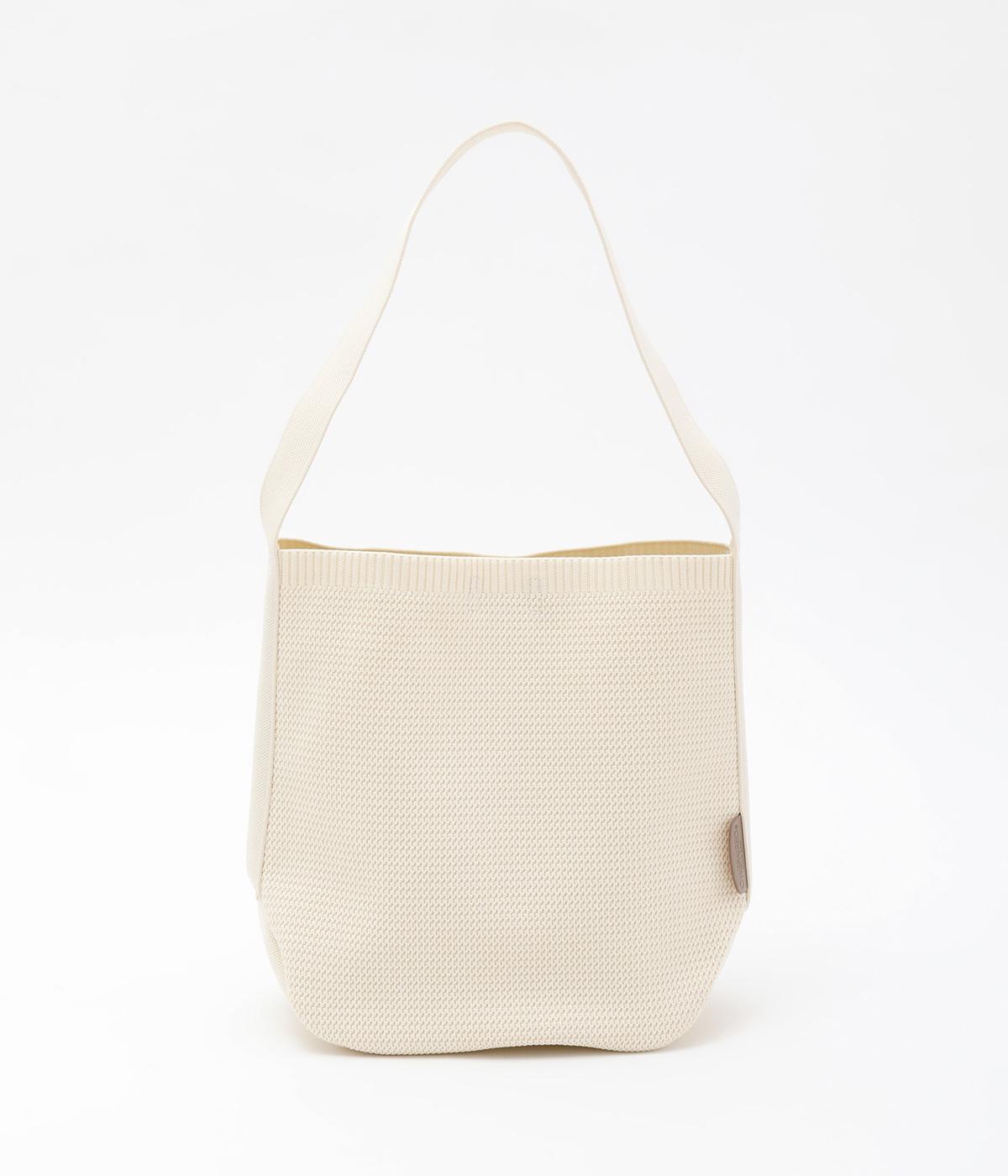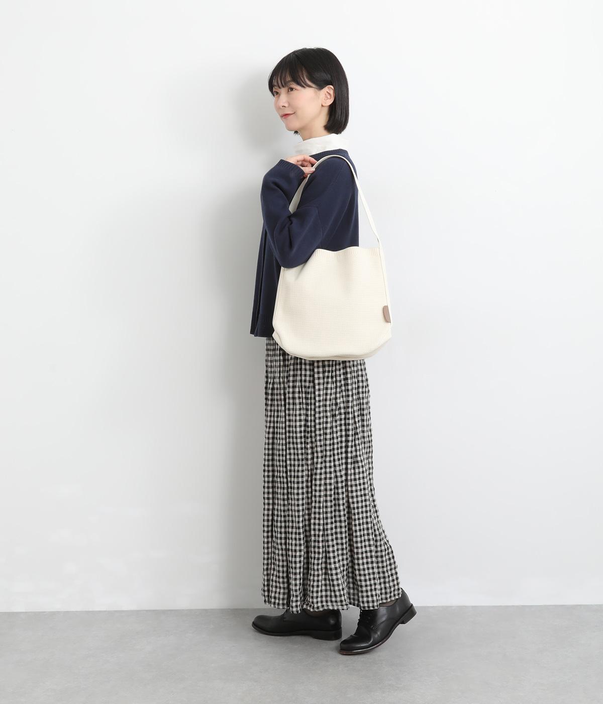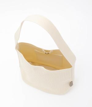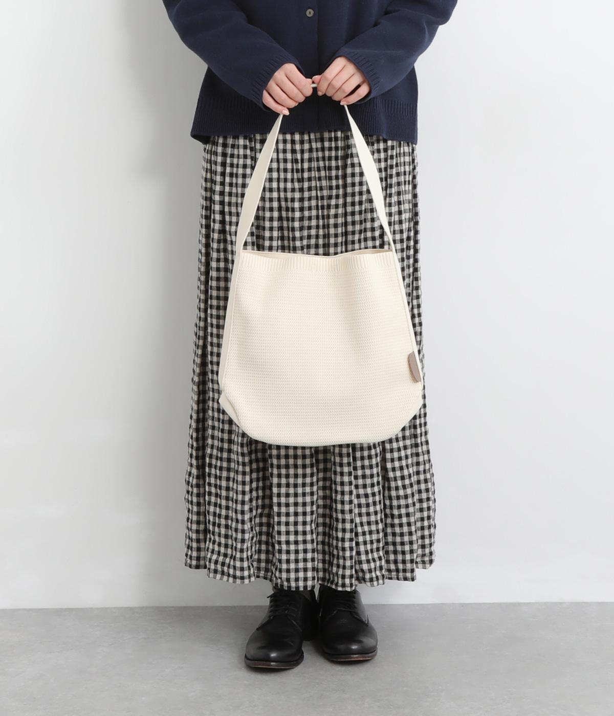 凹凸のある編み地が表情を添える、ワンハンドルのデザインです。直線とやわらかな曲線を組み合わせたフォルムが、カジュアルすぎない上品さを添えます。持ち手はほどよい太さで、肩にかけたときの安定感も◎。内ポケットとマチつきで収納力も抜群です。カジュアルからきれいめまで、幅広い装いにマッチします。