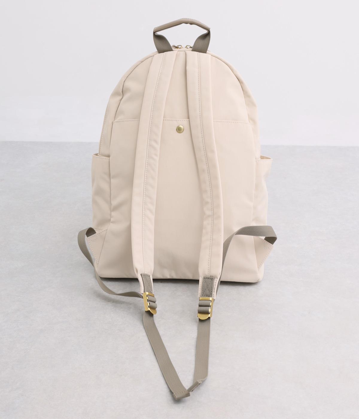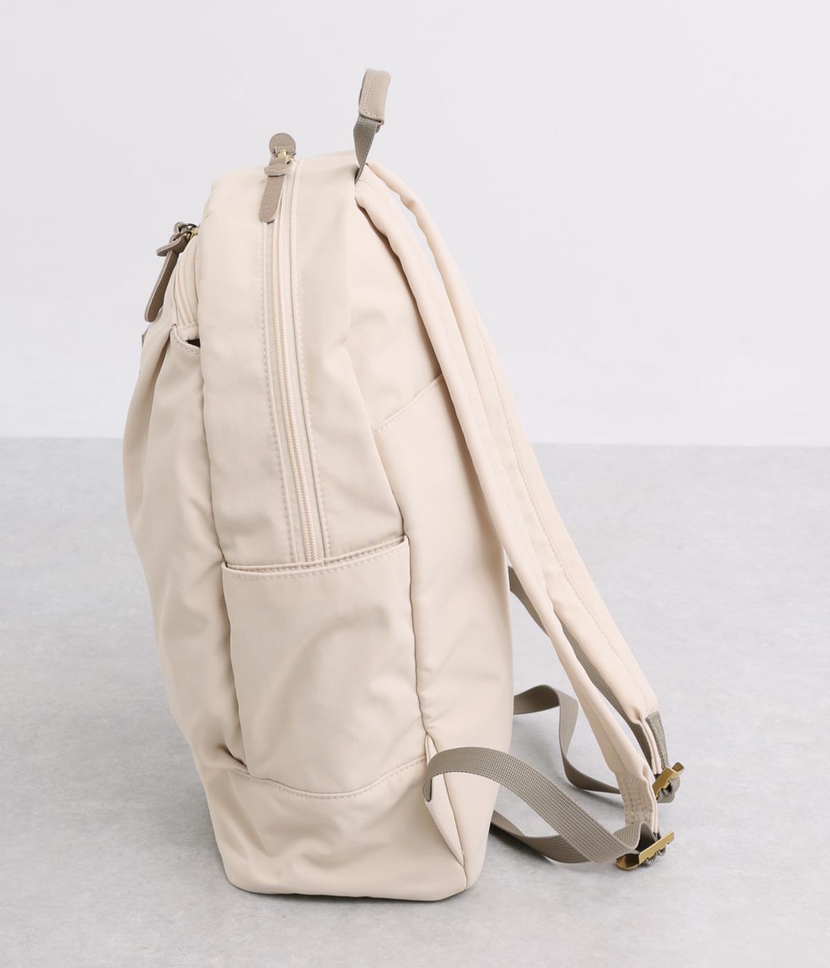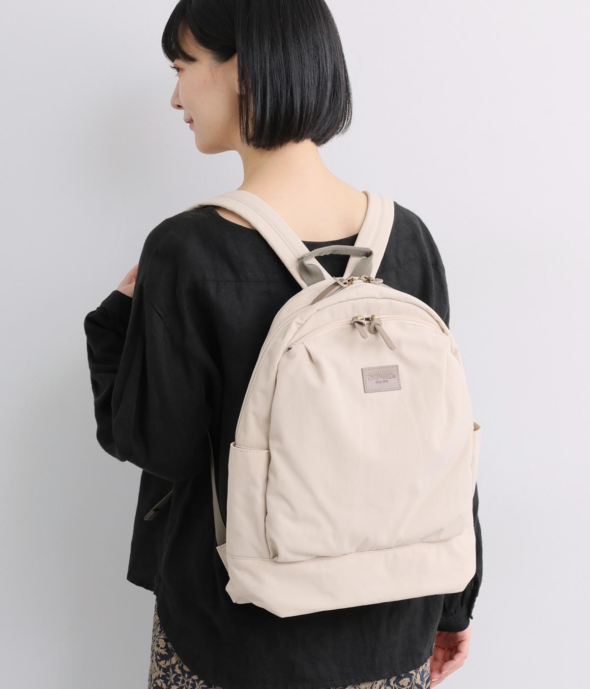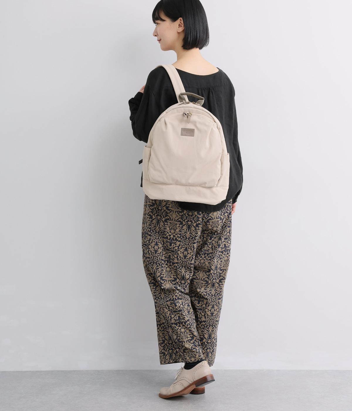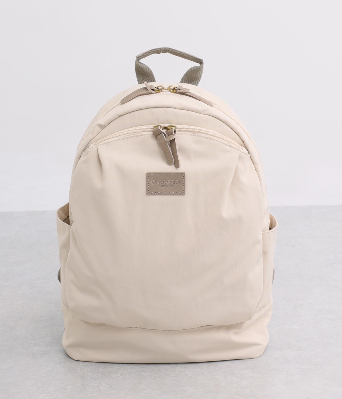 丸みを帯びたシルエットがかわいらしい印象のリュック。前面だけでなく背面にもポケットを配し、抜群の収納力です。サイドポケットはドリンクボトルや折り畳み傘の収納に◎。やや小ぶりながらA4がすっぽりおさまるサイズ感です。