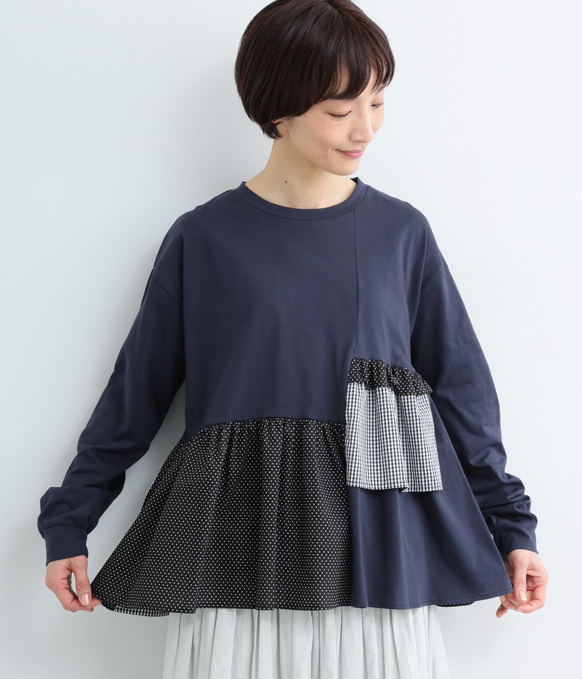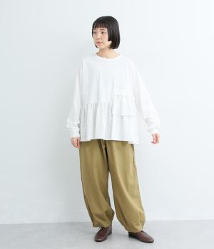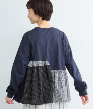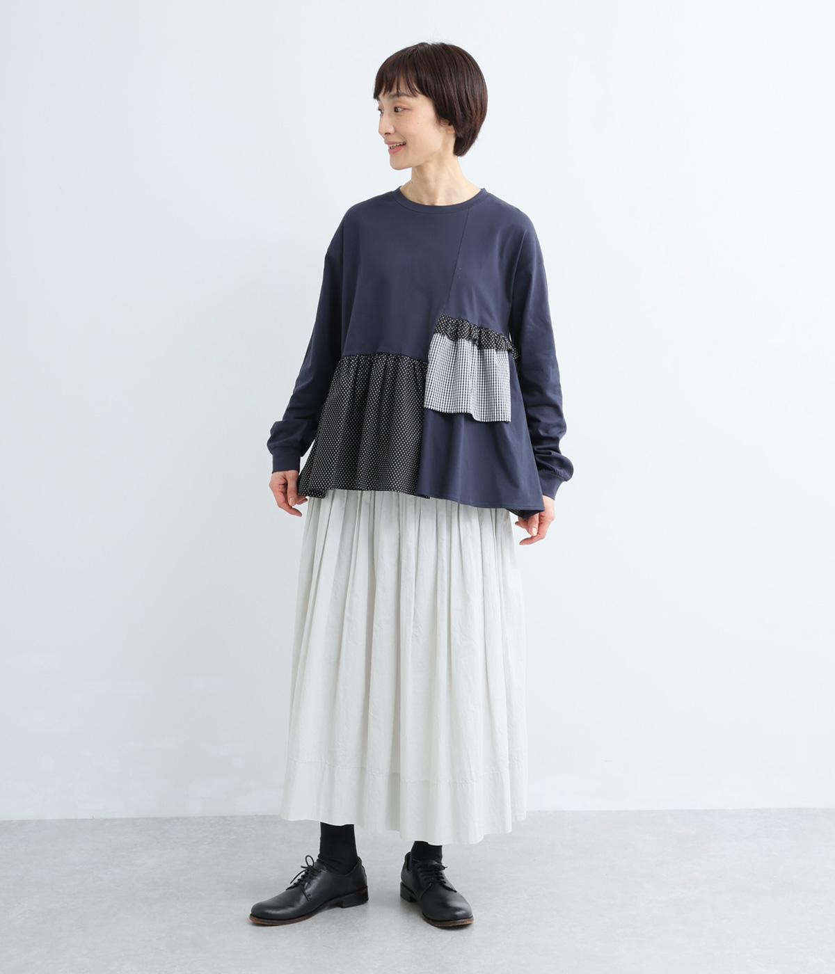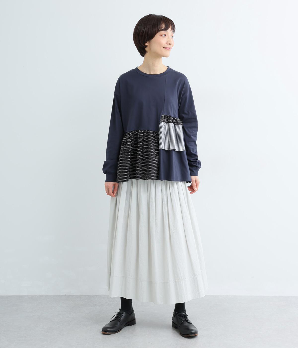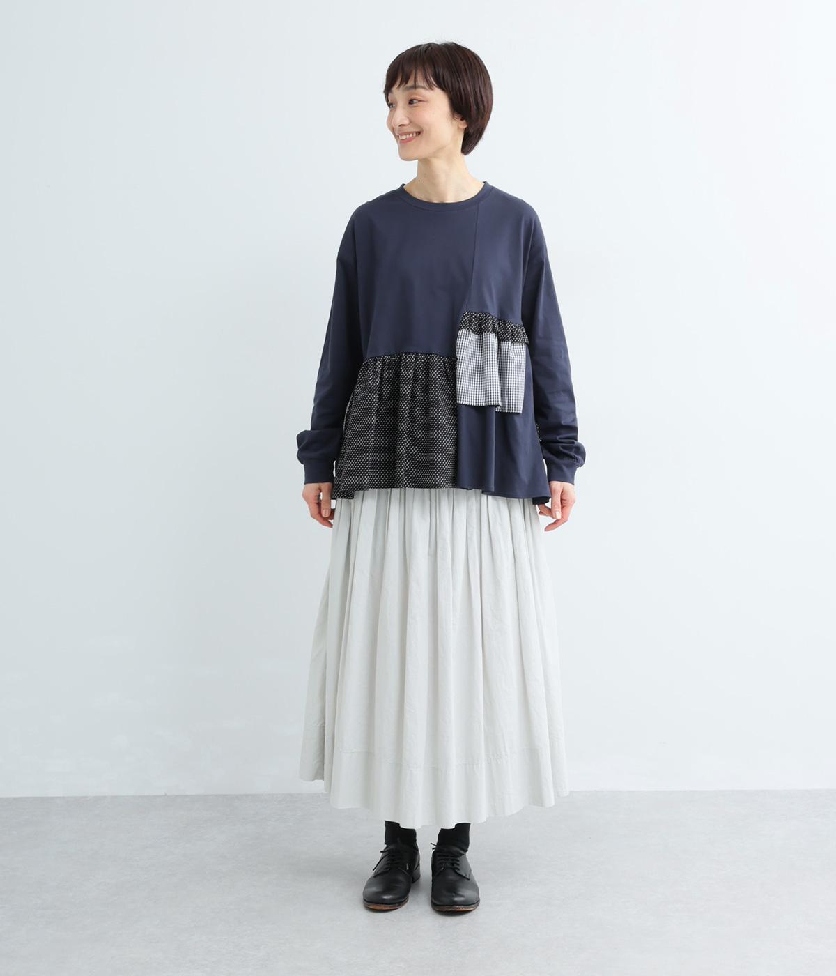 素材のコントラストがたのしめる、異素材ミックスのプルオーバーです。ランダムな切り替えと、裾のギャザーが生み出す立体的なシルエットが、シンプルな装いに動きを添えます。ヒップにかかる着丈で安心感があり、そのまま着るのはもちろん、レイヤードで裾を見せる着こなしもおすすめです。