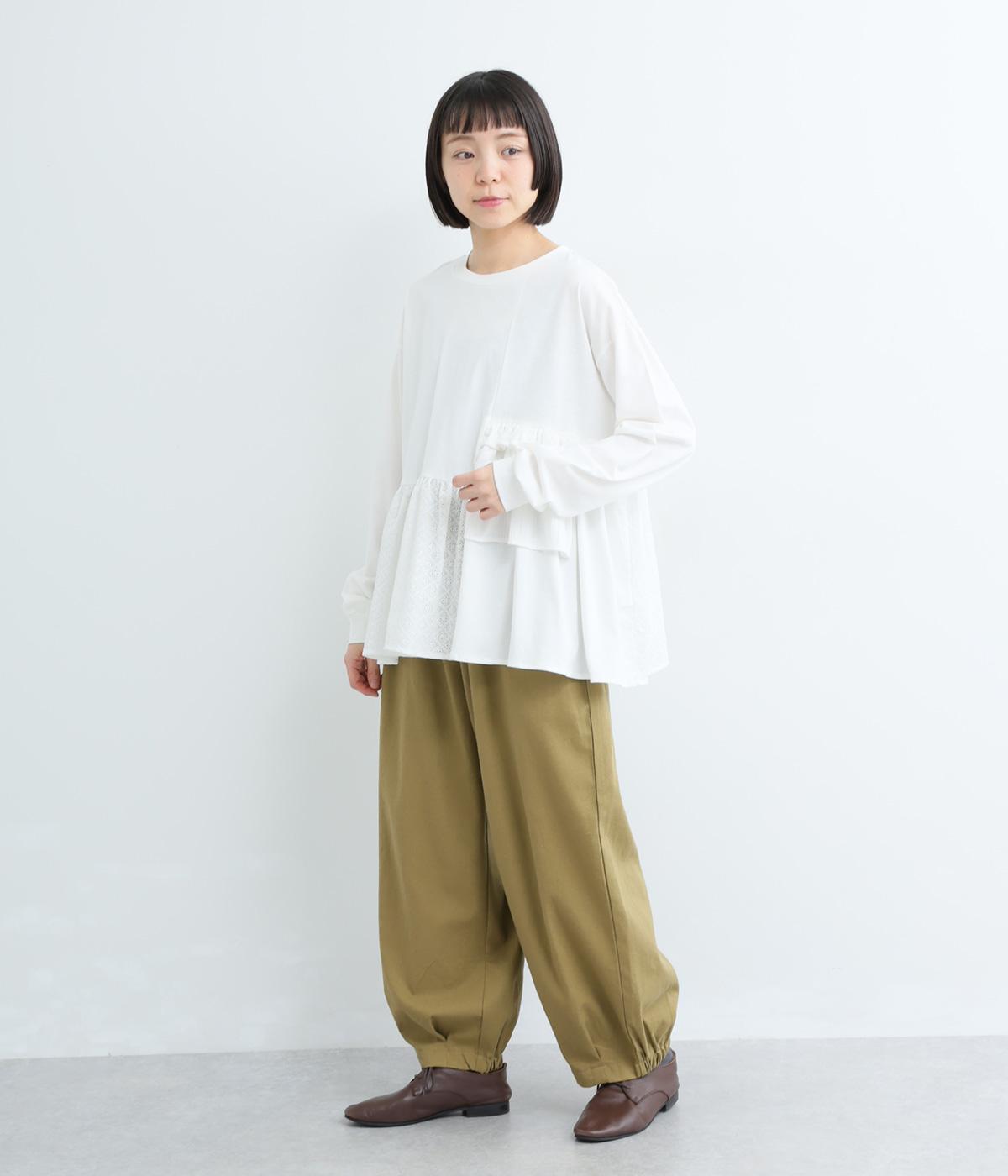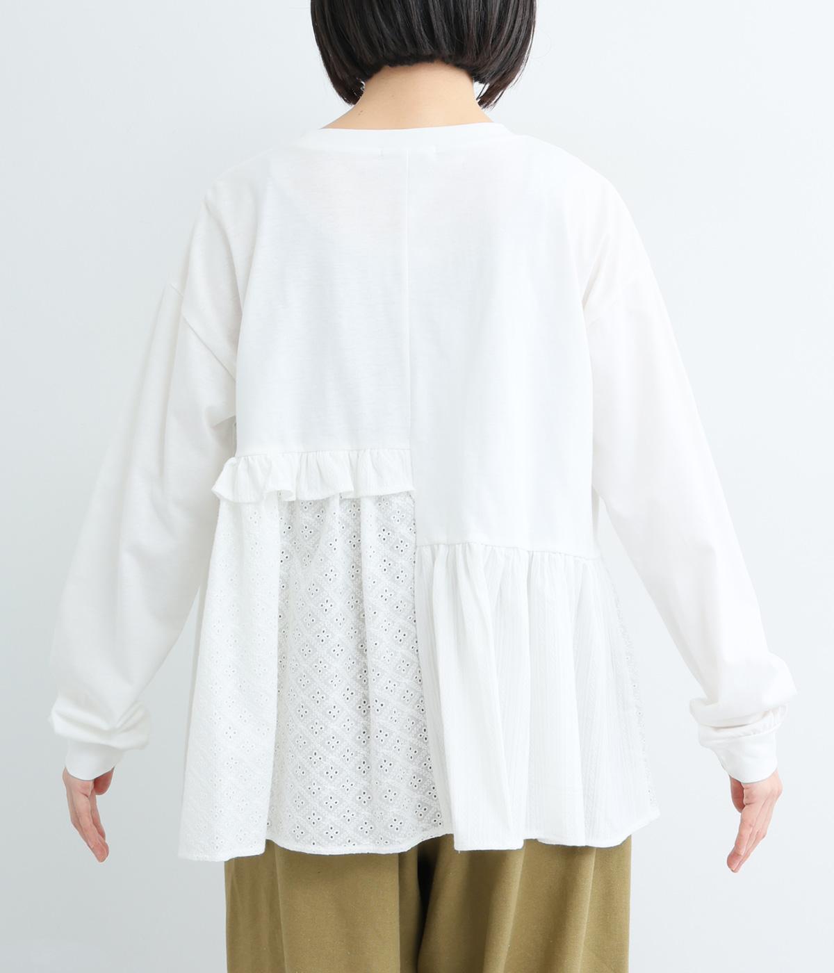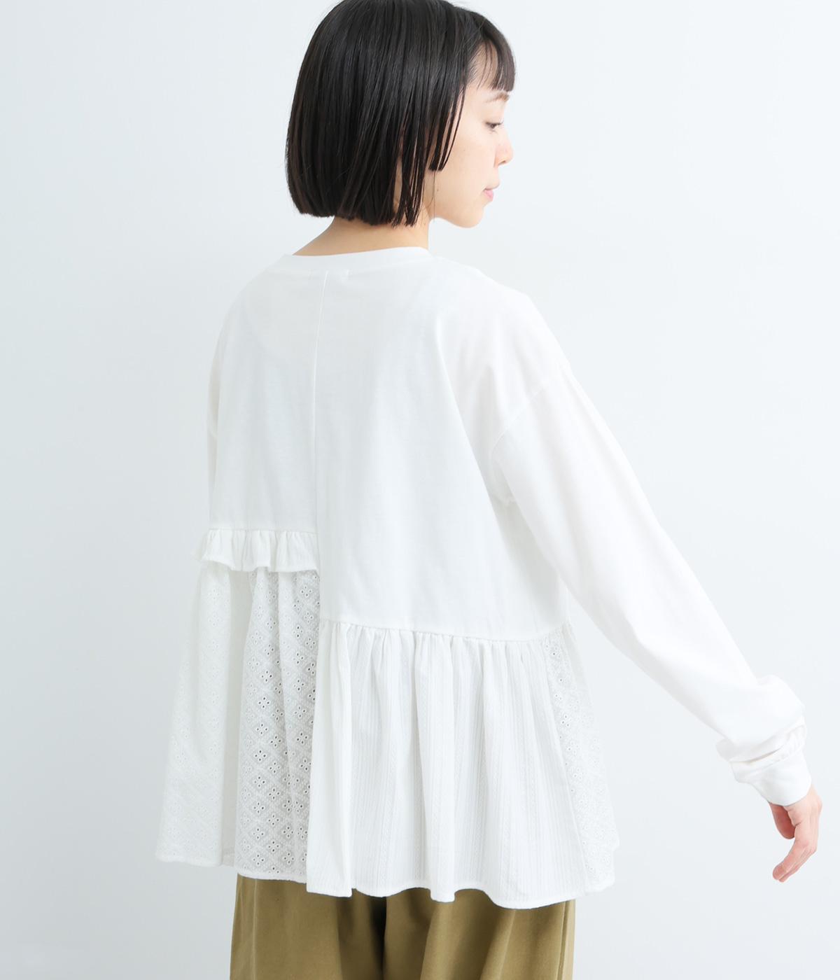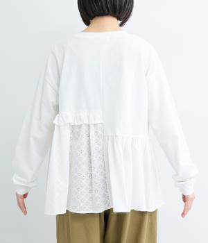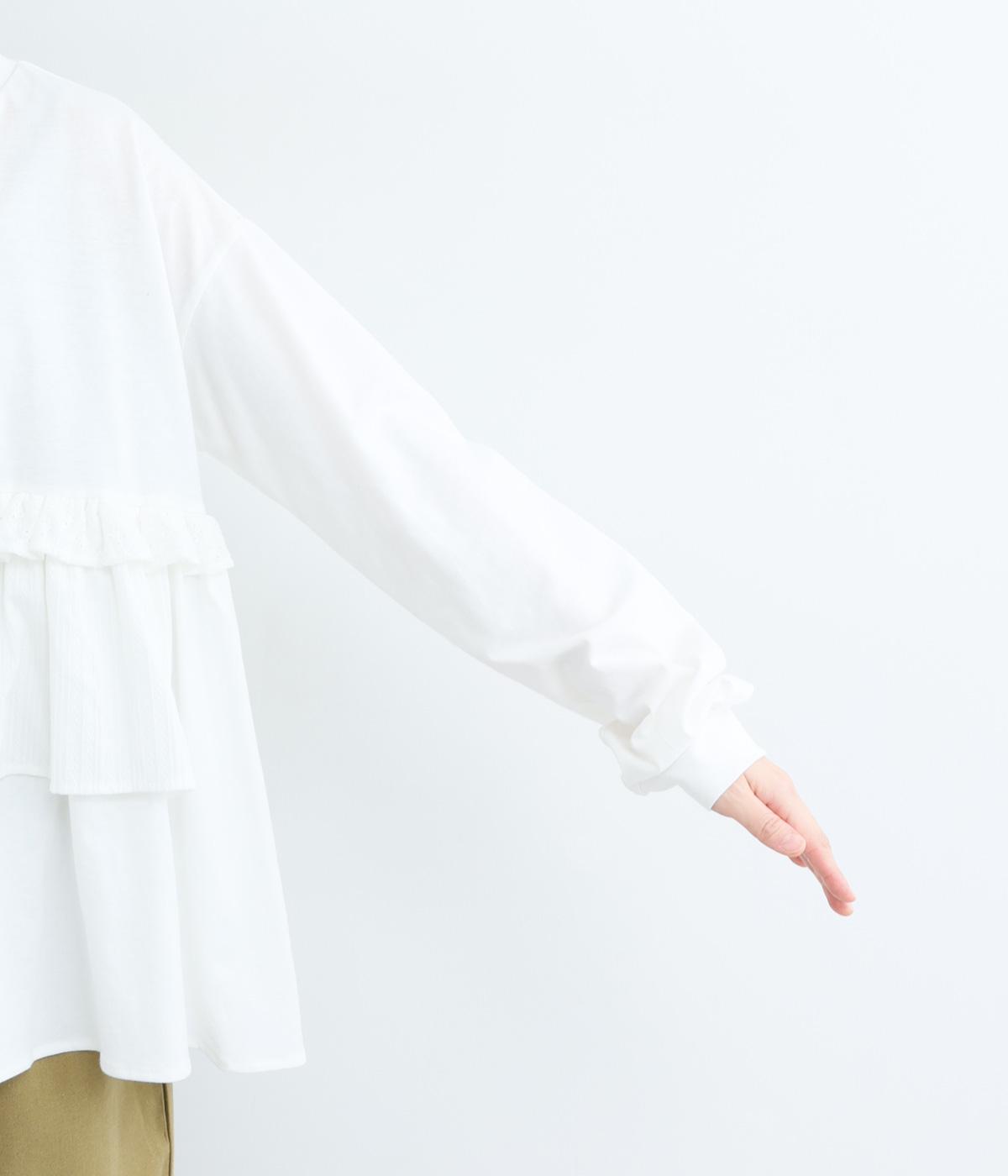 素材のコントラストがたのしめる、異素材ミックスのプルオーバーです。ランダムな切り替えと、裾のギャザーが生み出す立体的なシルエットが、シンプルな装いに動きを添えます。ヒップにかかる着丈で安心感があり、そのまま着るのはもちろん、レイヤードで裾を見せる着こなしもおすすめです。