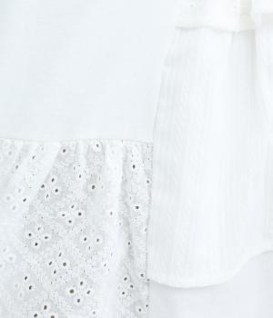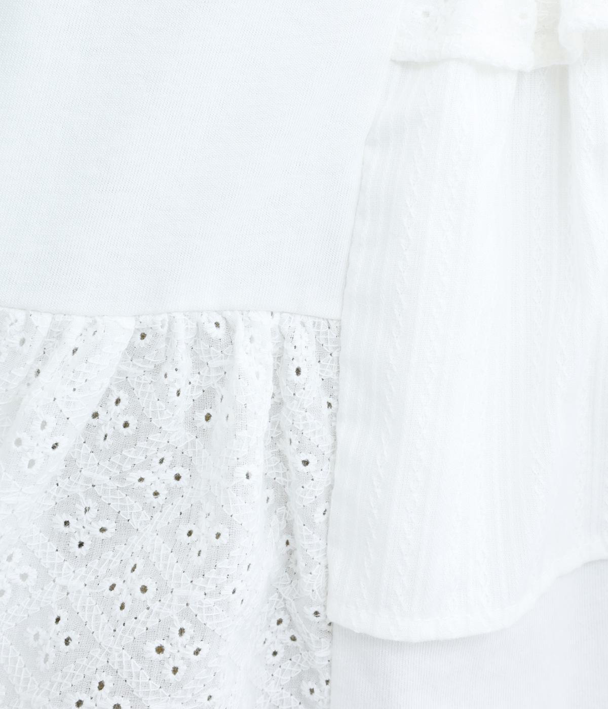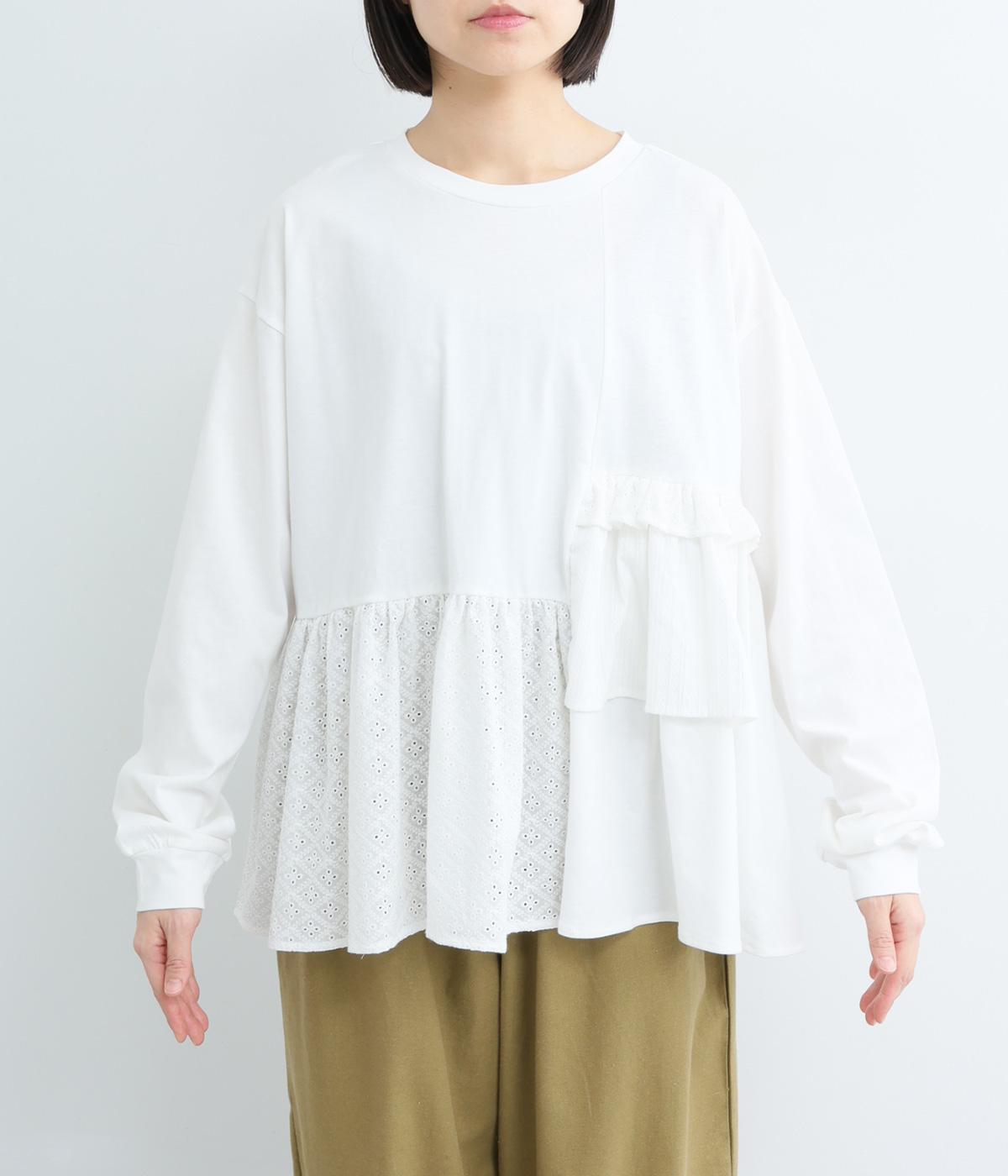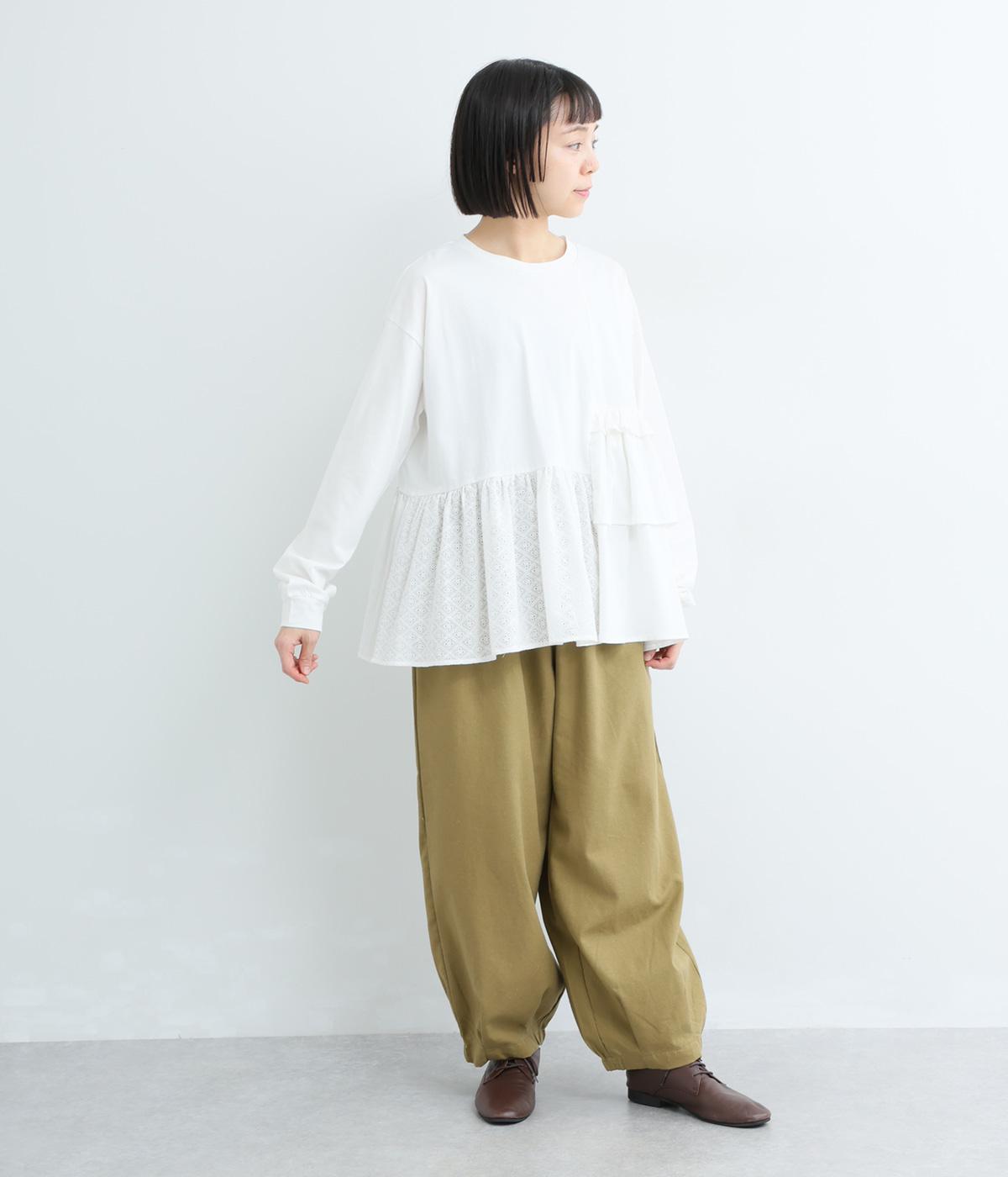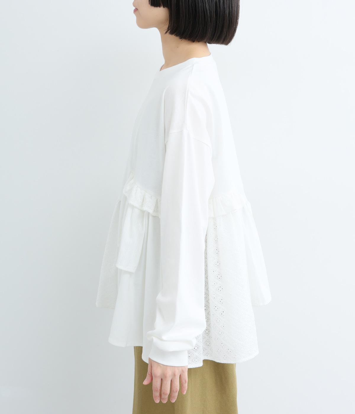 素材のコントラストがたのしめる、異素材ミックスのプルオーバーです。ランダムな切り替えと、裾のギャザーが生み出す立体的なシルエットが、シンプルな装いに動きを添えます。ヒップにかかる着丈で安心感があり、そのまま着るのはもちろん、レイヤードで裾を見せる着こなしもおすすめです。