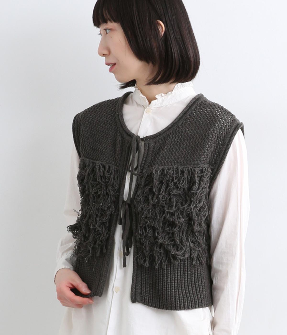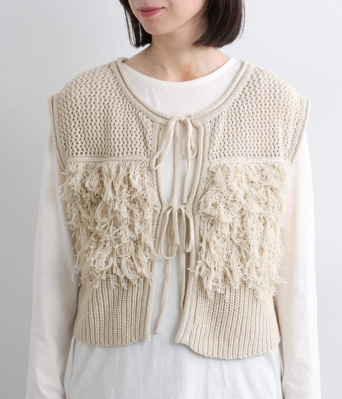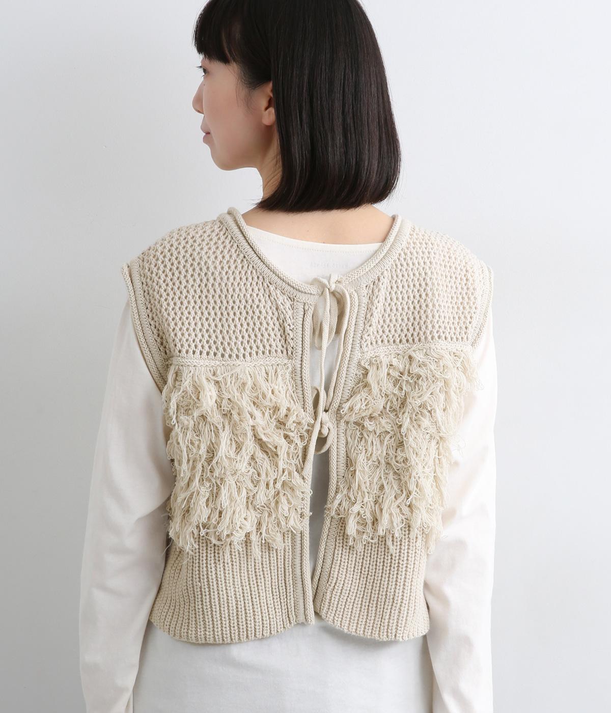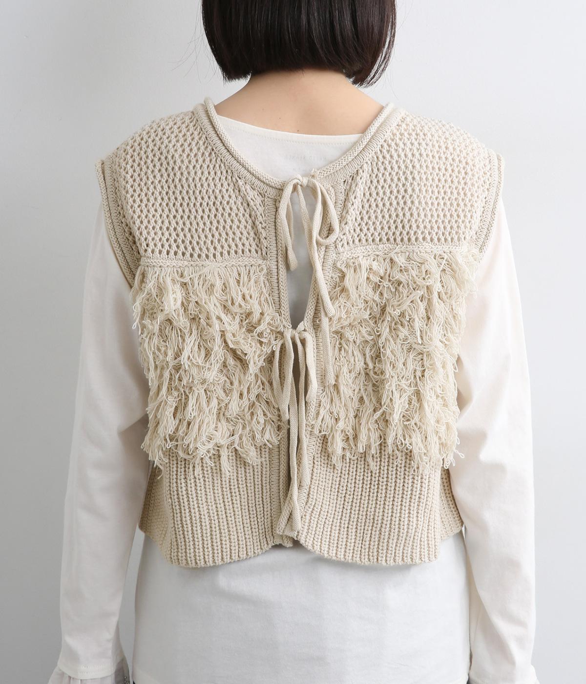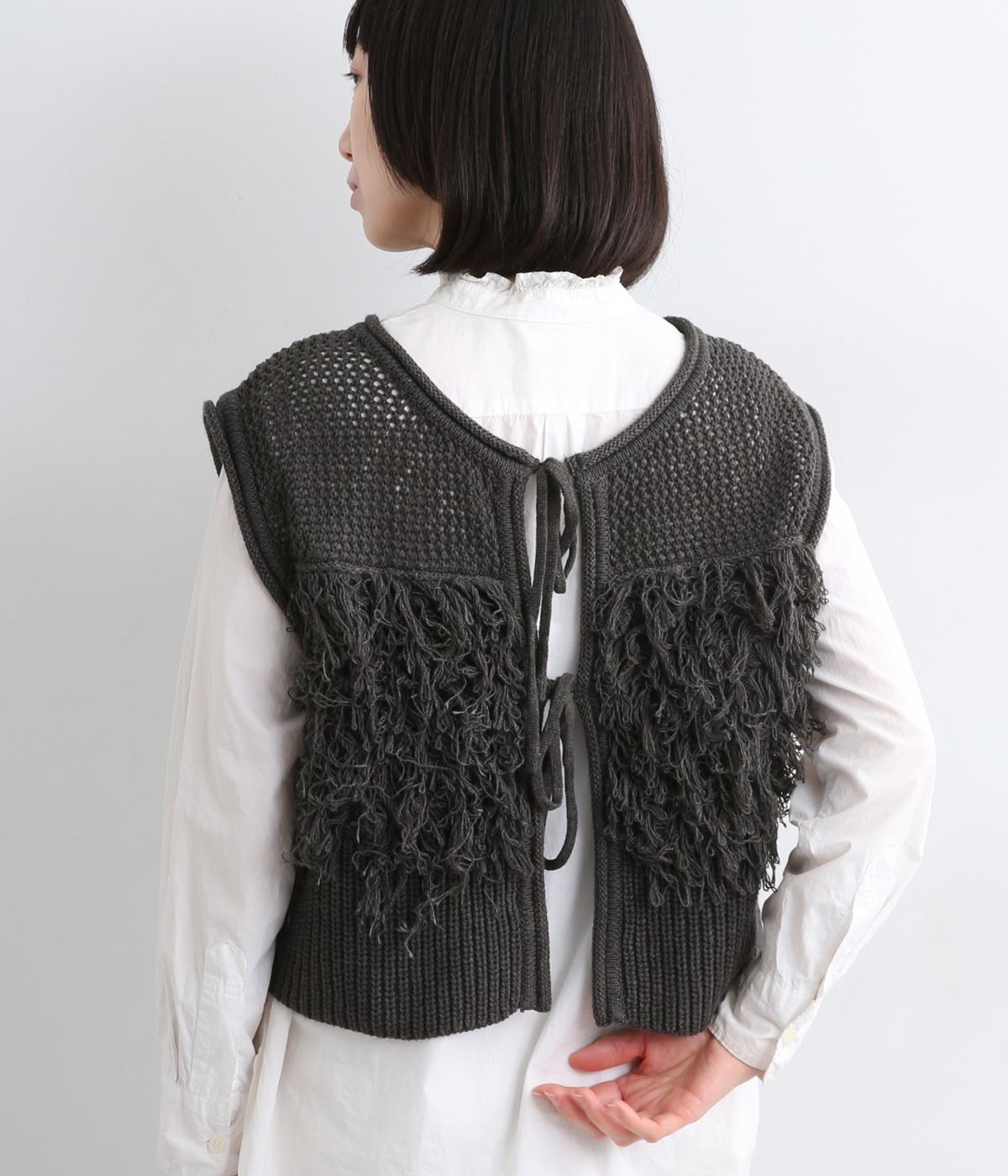 中央のフリンジがアイキャッチになり、上部分は透け編みに、裾は畦編みのリブ切り替えでほどよくメリハリをつけました。ダブルリボンは前後どちらでもたのしめる2way仕様で、シンプルな装いにプラスするだけで一気に華やかに。