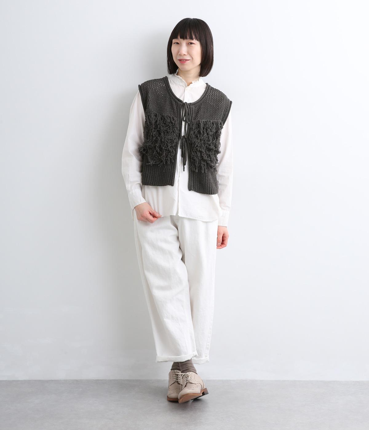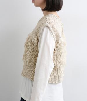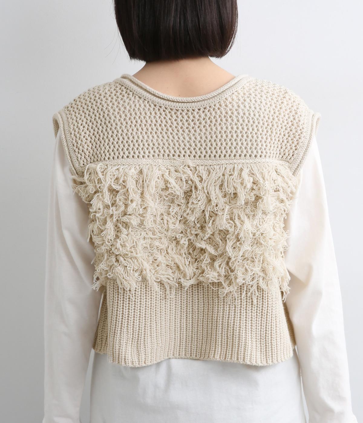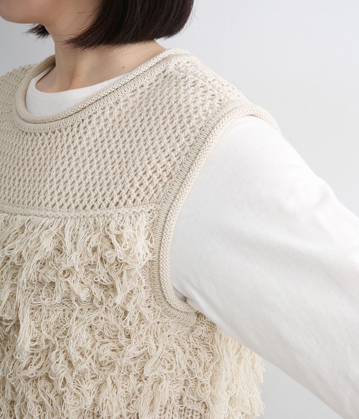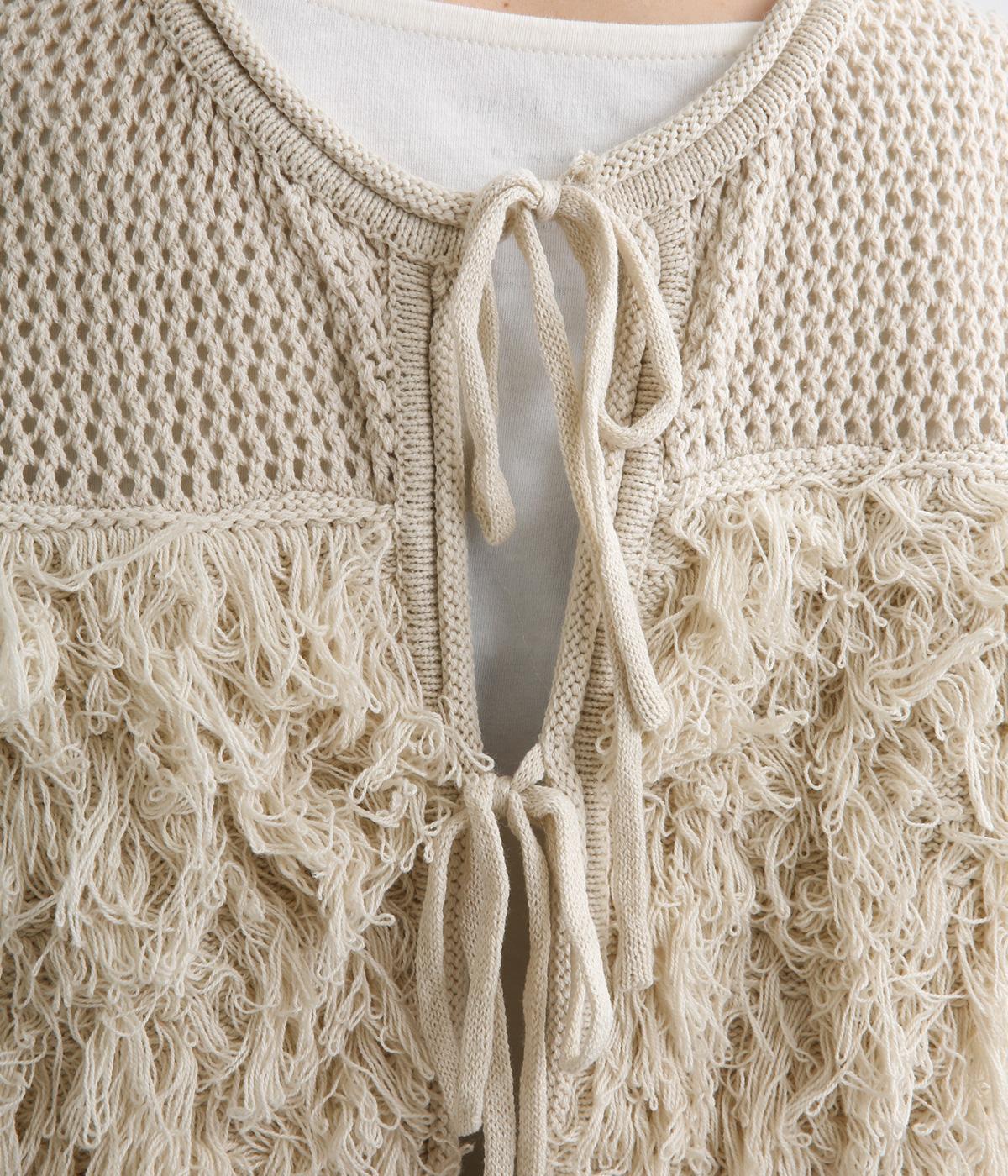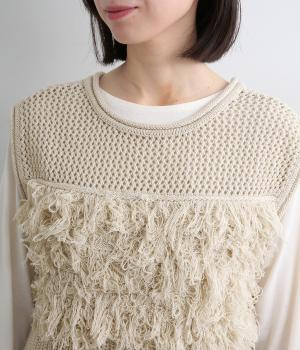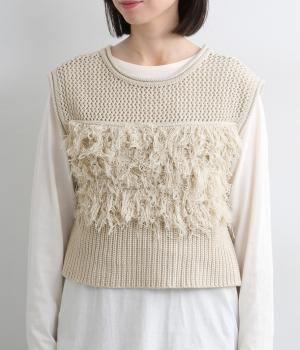 中央のフリンジがアイキャッチになり、上部分は透け編みに、裾は畦編みのリブ切り替えでほどよくメリハリをつけました。ダブルリボンは前後どちらでもたのしめる2way仕様で、シンプルな装いにプラスするだけで一気に華やかに。