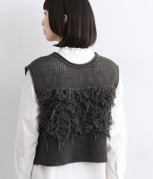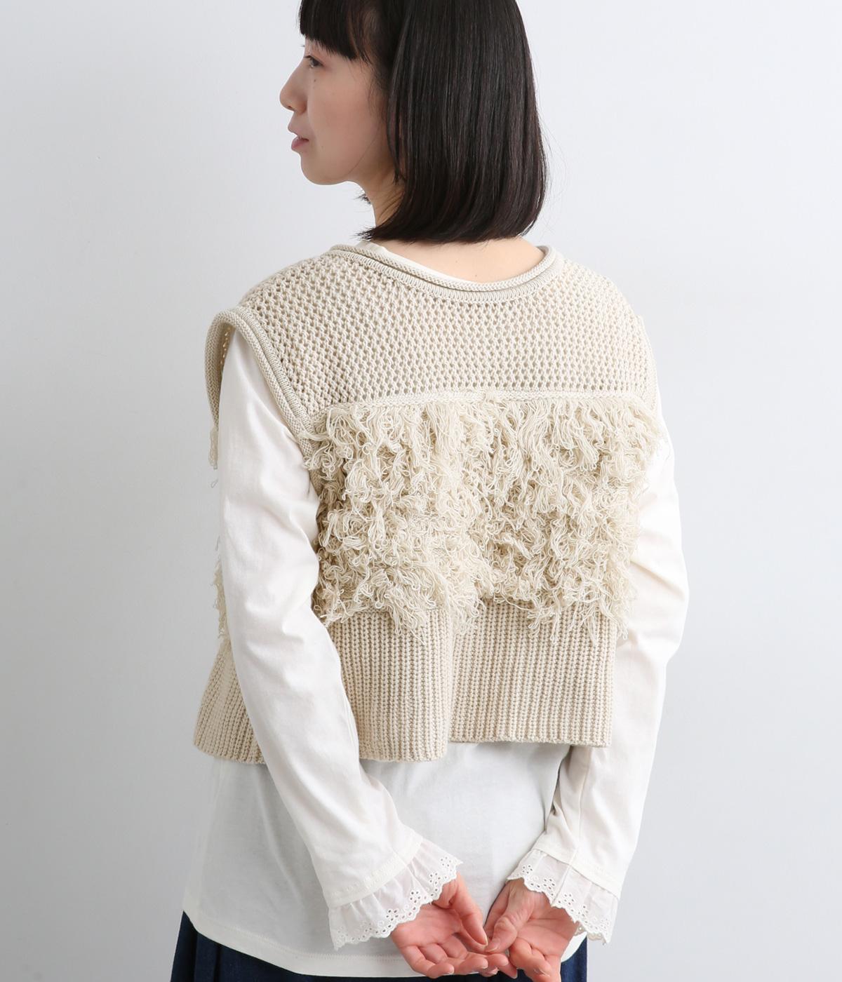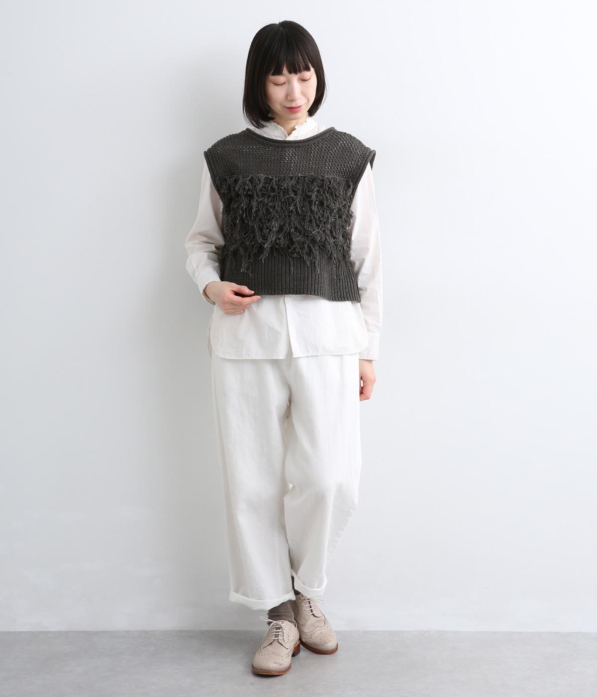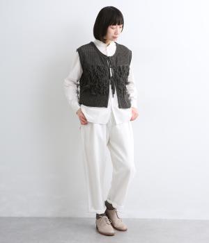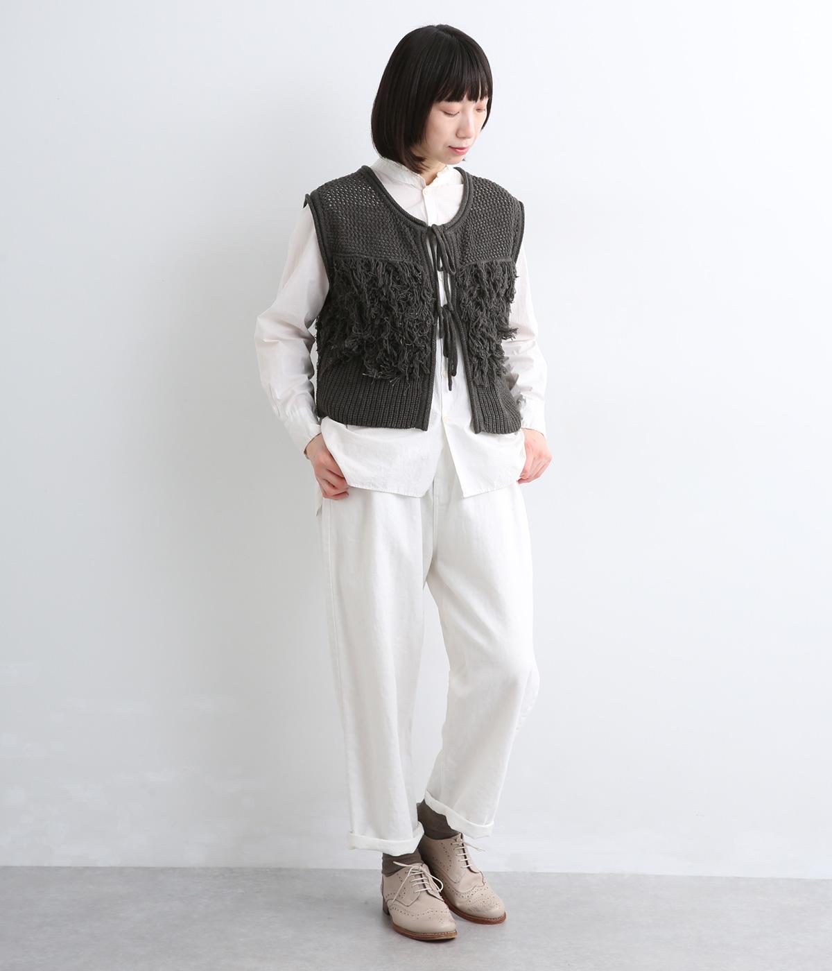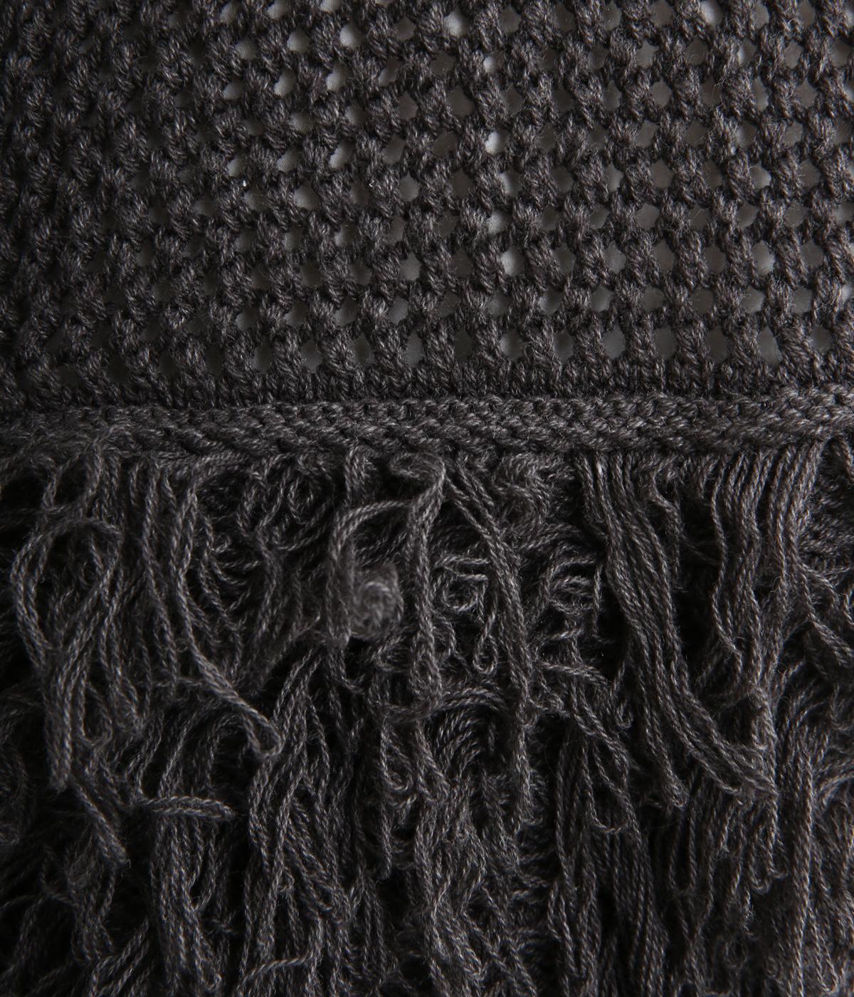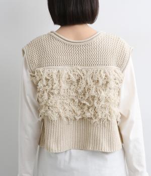 中央のフリンジがアイキャッチになり、上部分は透け編みに、裾は畦編みのリブ切り替えでほどよくメリハリをつけました。ダブルリボンは前後どちらでもたのしめる2way仕様で、シンプルな装いにプラスするだけで一気に華やかに。