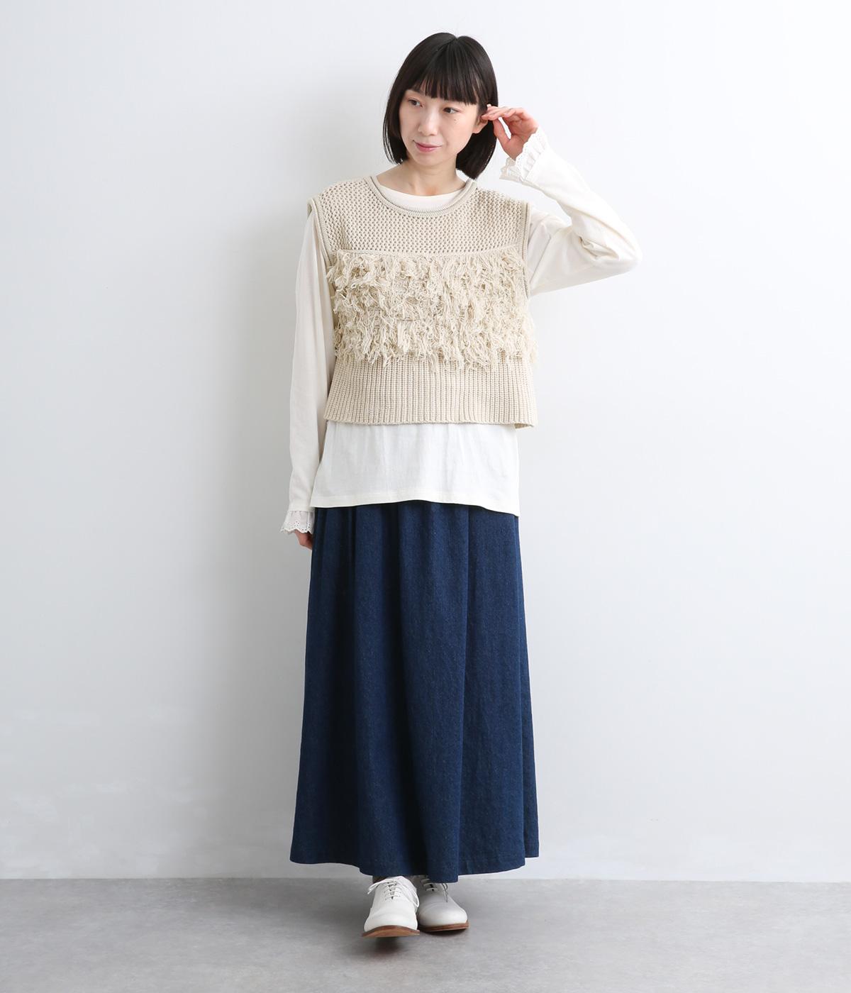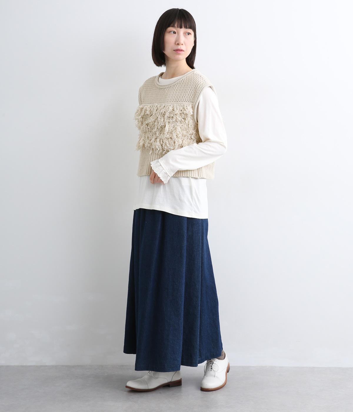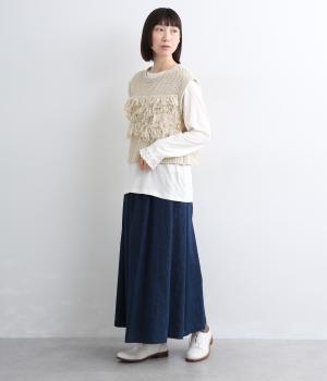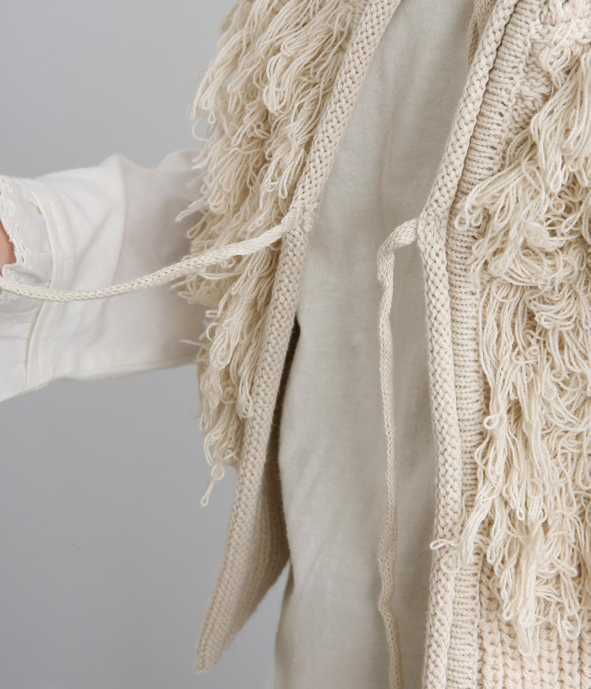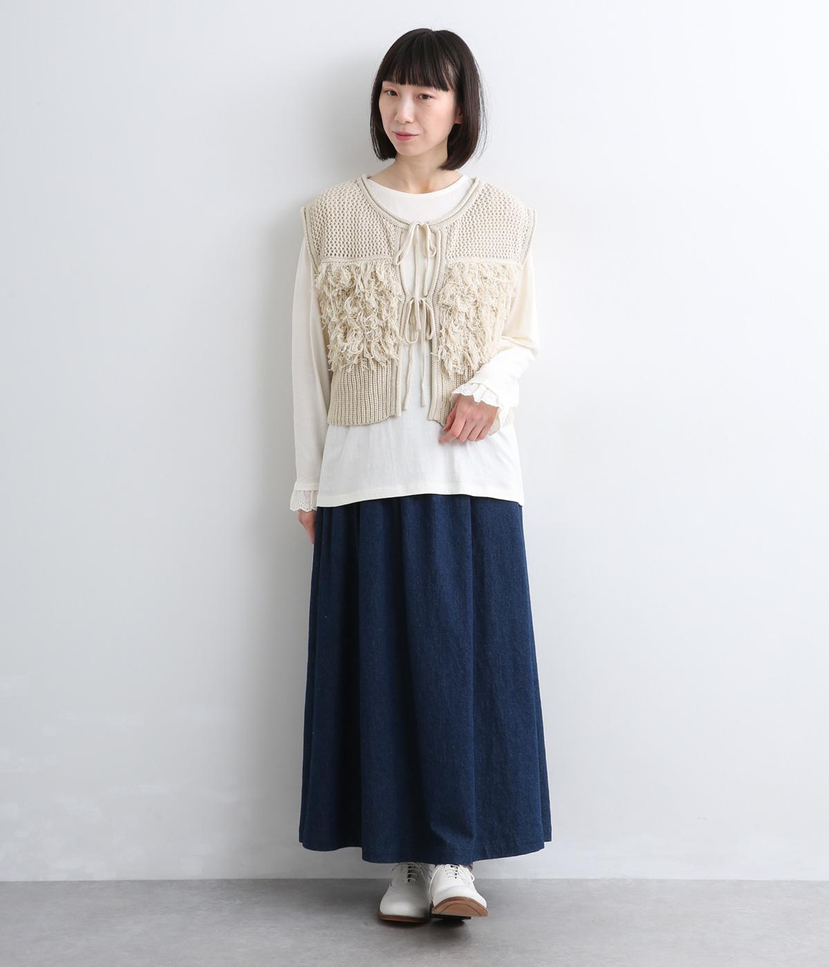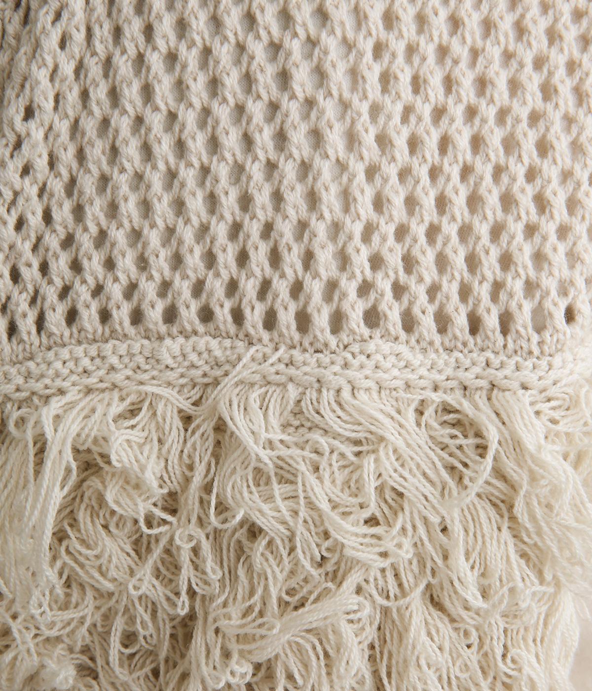 中央のフリンジがアイキャッチになり、上部分は透け編みに、裾は畦編みのリブ切り替えでほどよくメリハリをつけました。ダブルリボンは前後どちらでもたのしめる2way仕様で、シンプルな装いにプラスするだけで一気に華やかに。