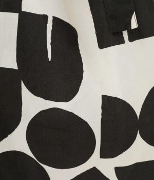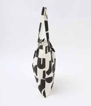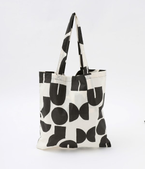 ポスターアートのような手描きの幾何学柄をちりばめたオリジナルのテキスタイルです。エコバック感覚で使える薄手素材を用い、たたんで内側のポケットに入れられるポケッタブル仕様になっています。