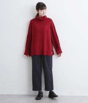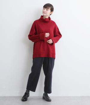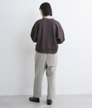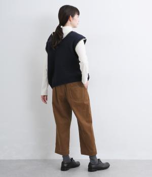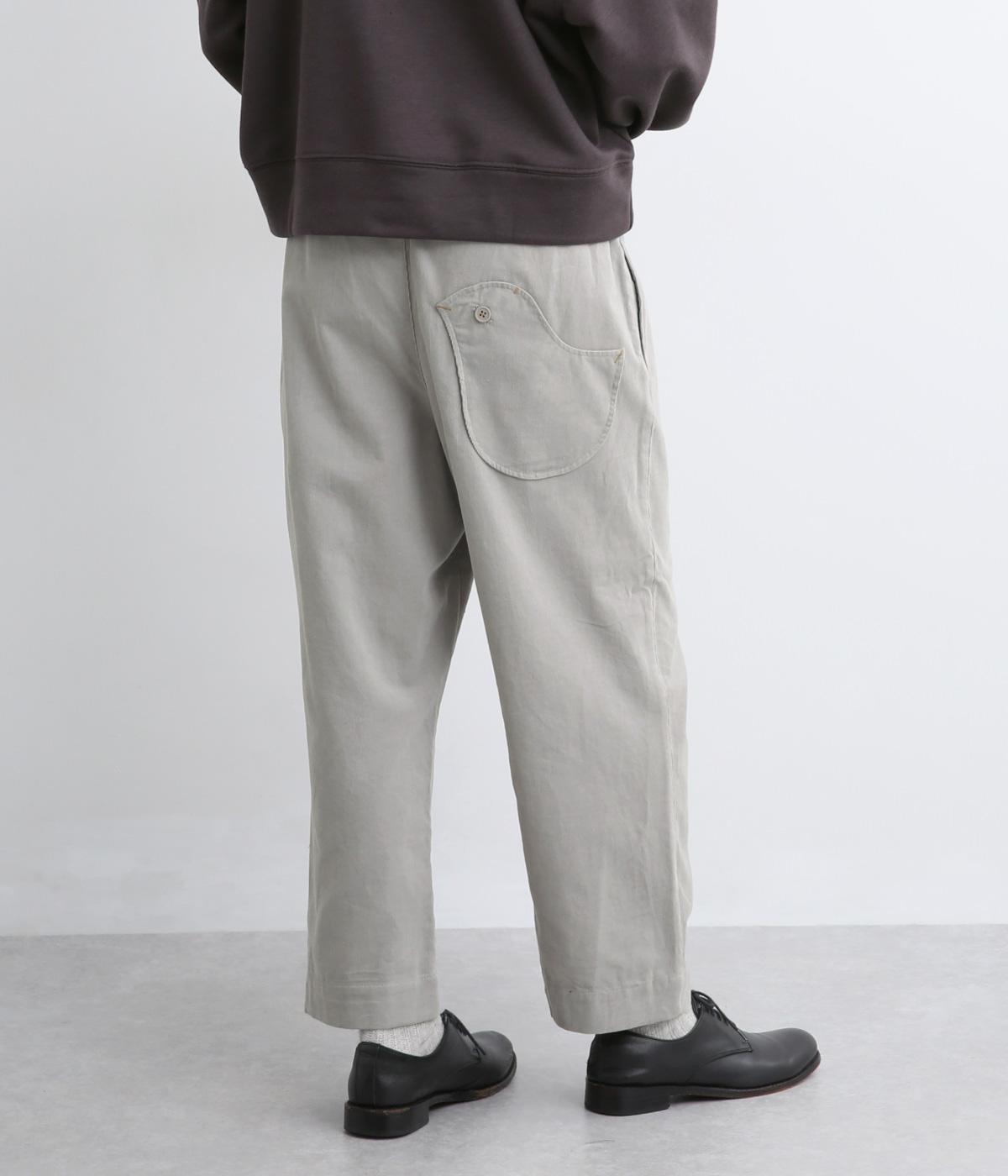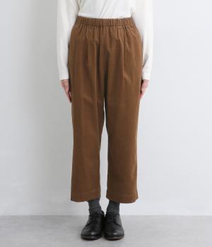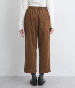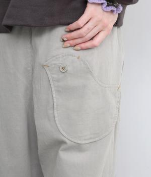 タックをほどこして体のラインを拾いにくく、裾に向かって細くなるシルエットです。ウエストゴムデザインでストレスフリーな穿き心地。うしろの鳥型のポケットが遊び心のあるデザインポイントです。