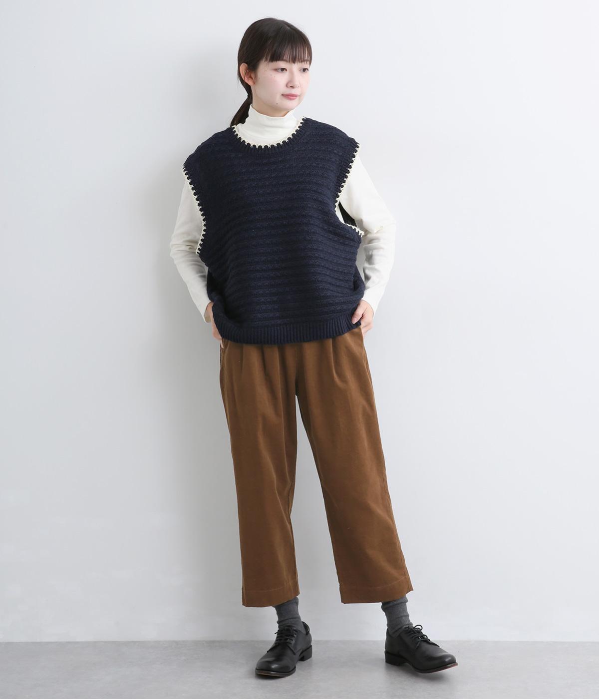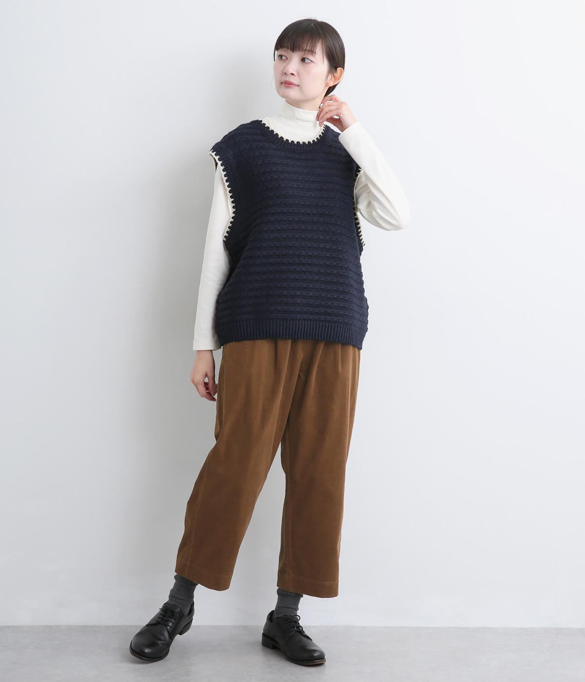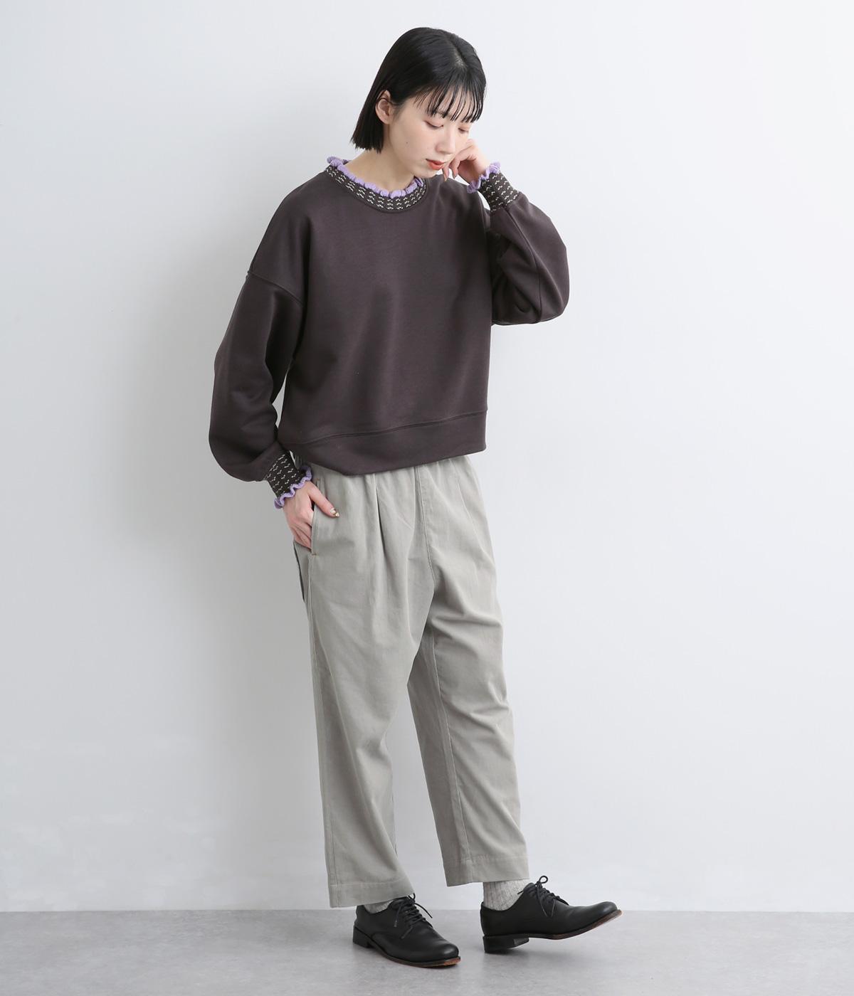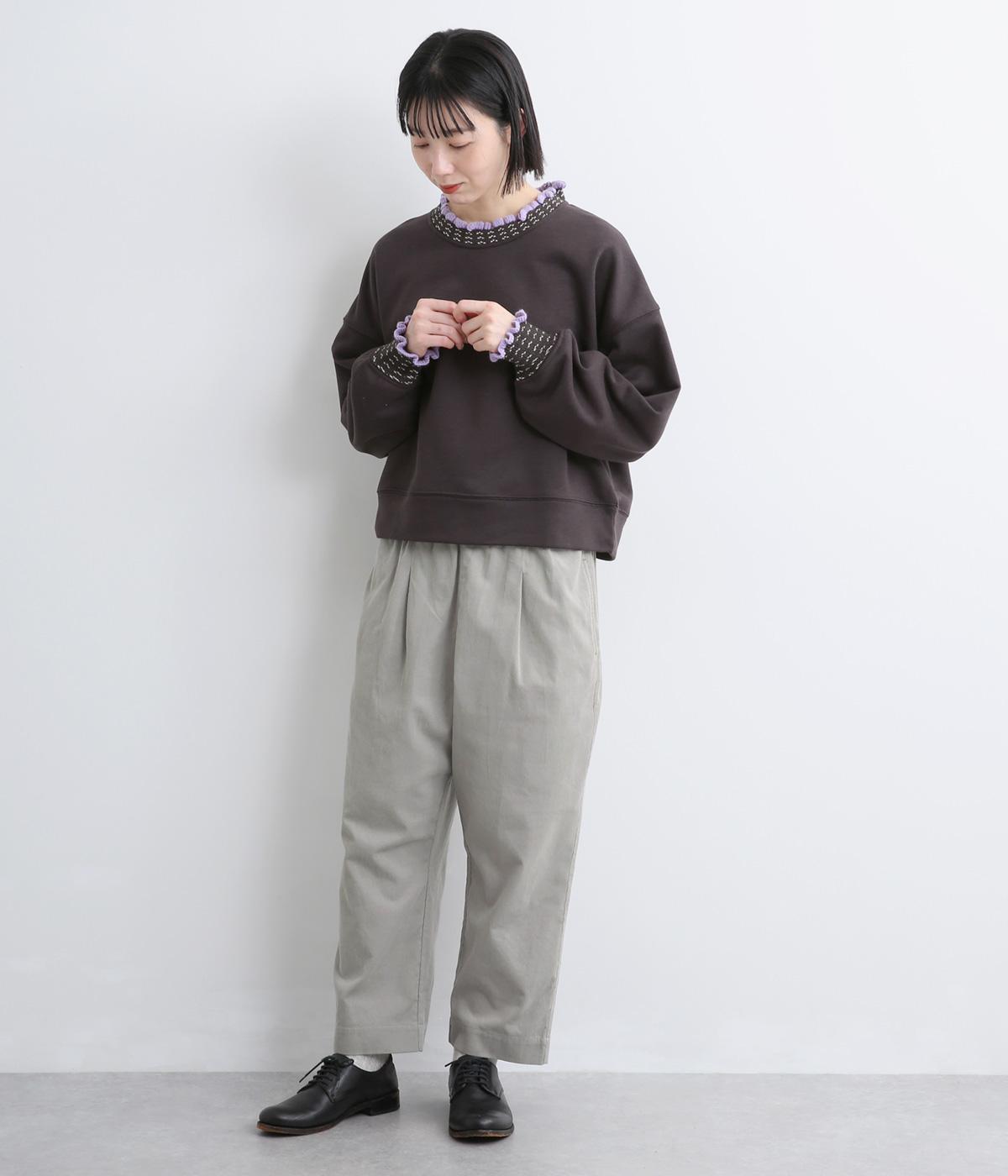 さらりと軽やかなコットンコーデュロイ生地を使用しています。ほのかな起毛の細い畝が動きに合わせてほんのりと光沢を放ちます。ロングシーズン着用できる素材感です。