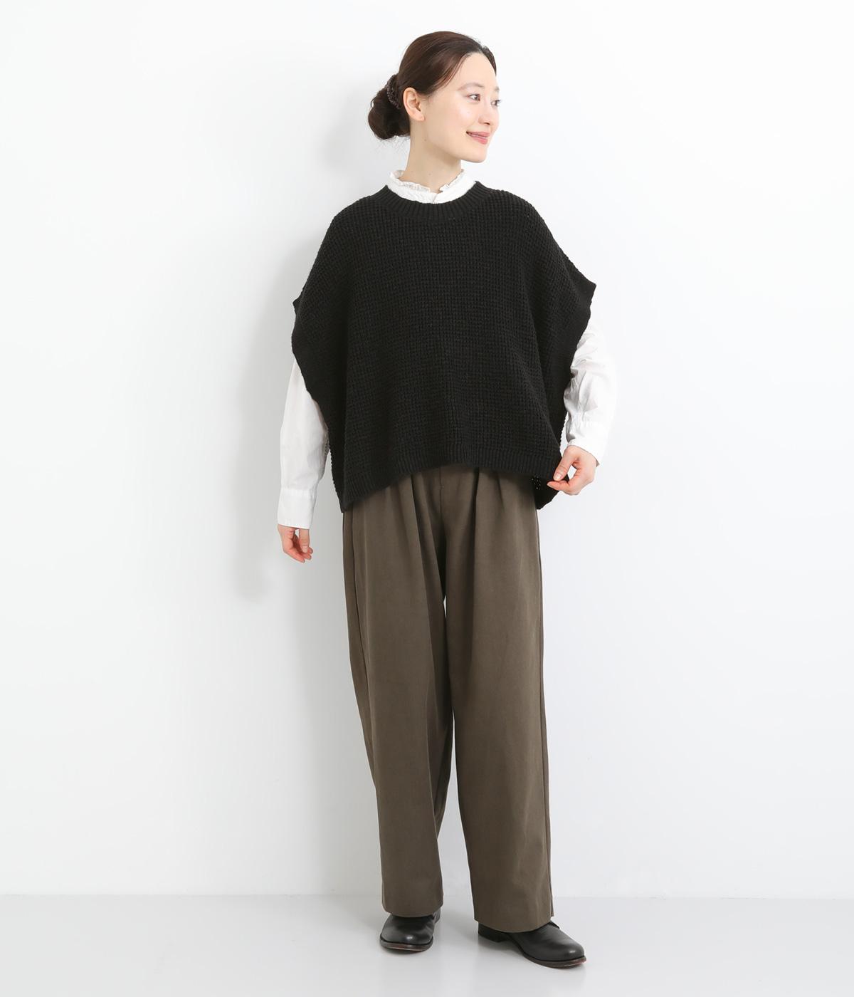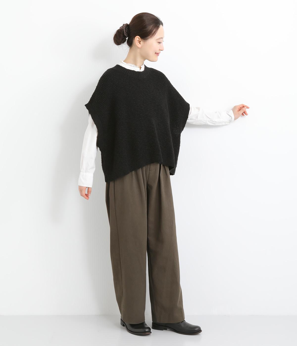 ゆったりとしたワイドニットベストです。どんなスタイルにも合わせやすく、大人カジュアルの定番になりそうなアイテム。シンプルなシルエットに素材の魅力が際立ちます。後身ごろには取り外し可能な小さなベルト付き。