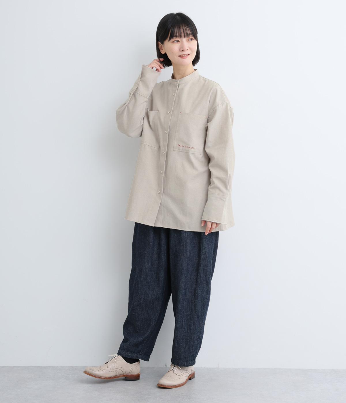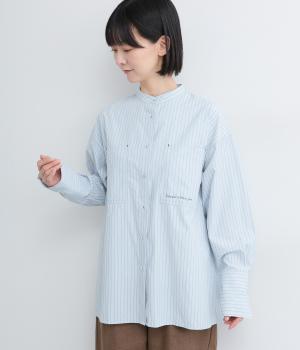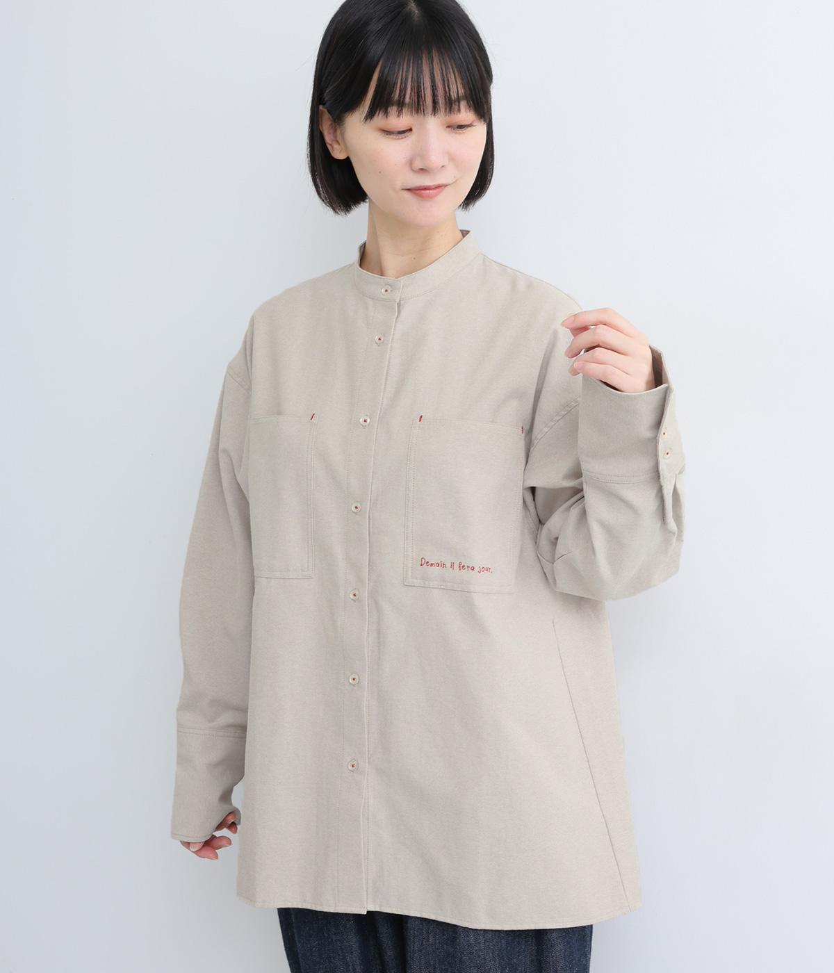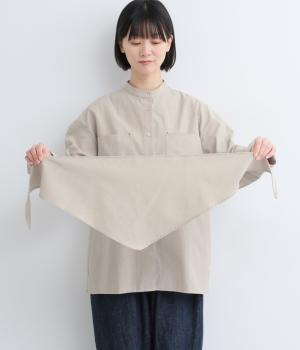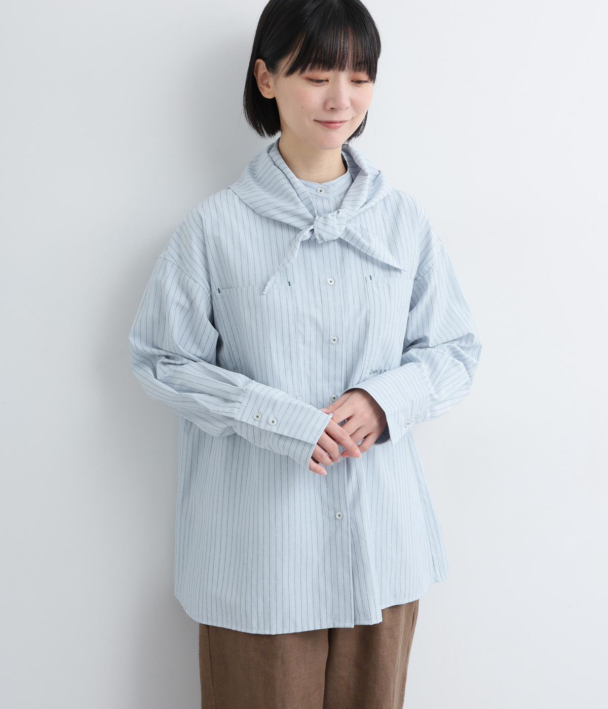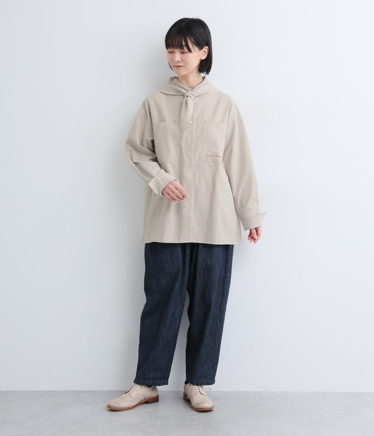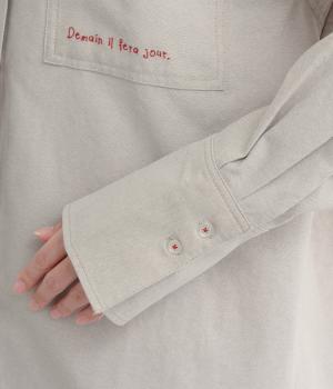 胸ポケットと文字刺しゅうをアクセントにしたシャツ。同素材のネッカチーフを首元にさっと巻けばおしゃれムードが高まります。後ろにはタックを入れてシルエットに動きをプラス。袖口につけた長めのカフスは折り返しても素敵です。