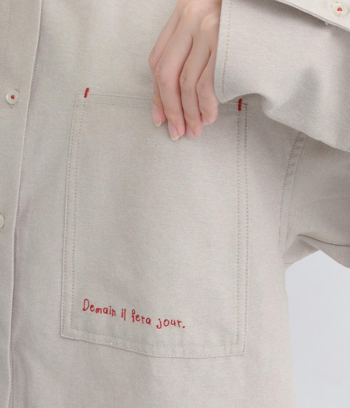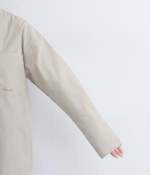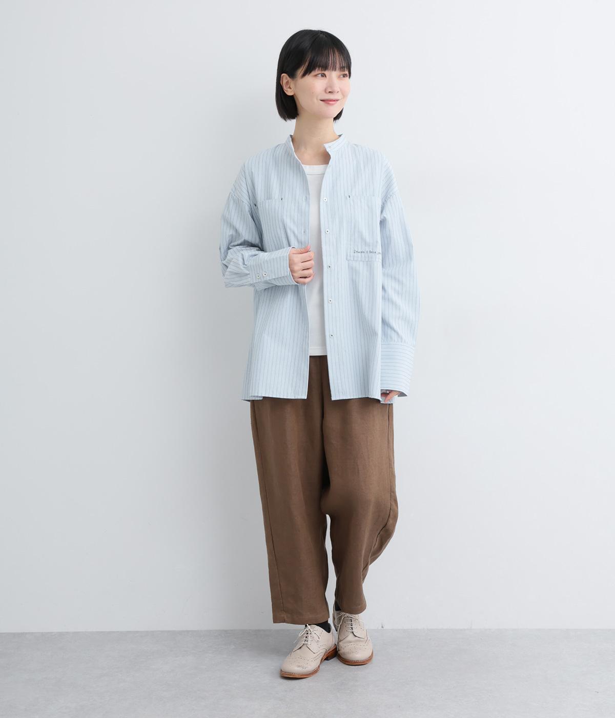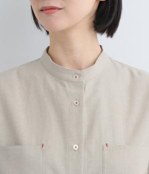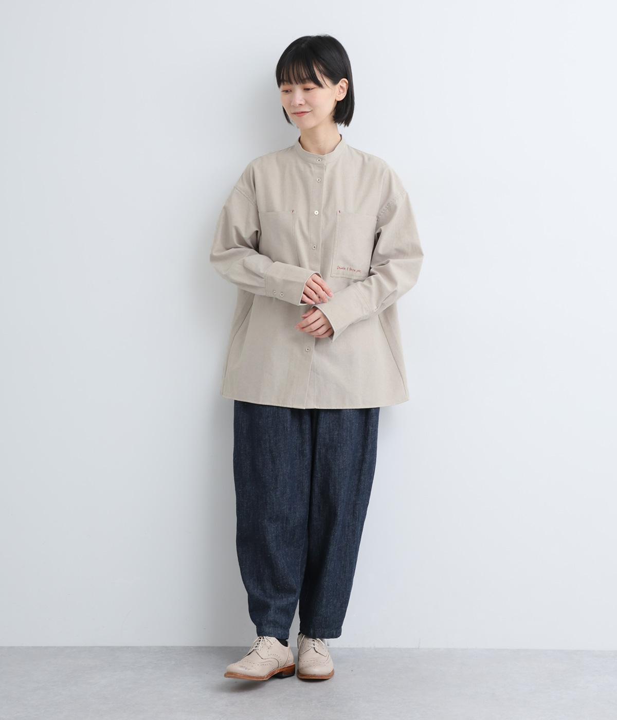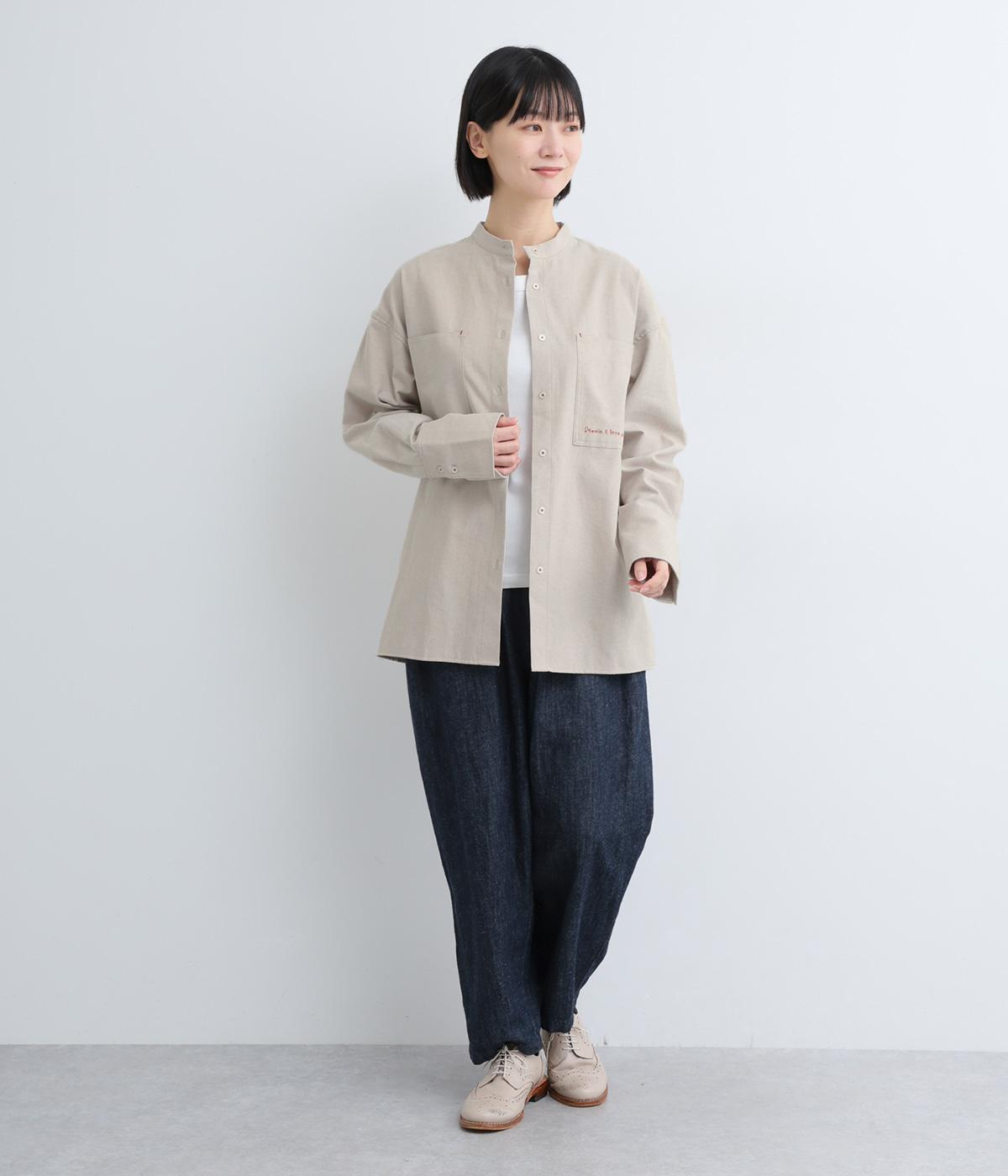 胸ポケットと文字刺しゅうをアクセントにしたシャツ。同素材のネッカチーフを首元にさっと巻けばおしゃれムードが高まります。後ろにはタックを入れてシルエットに動きをプラス。袖口につけた長めのカフスは折り返しても素敵です。