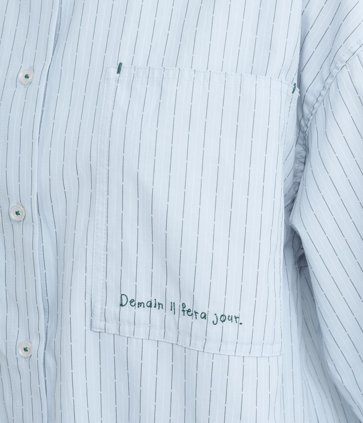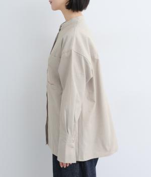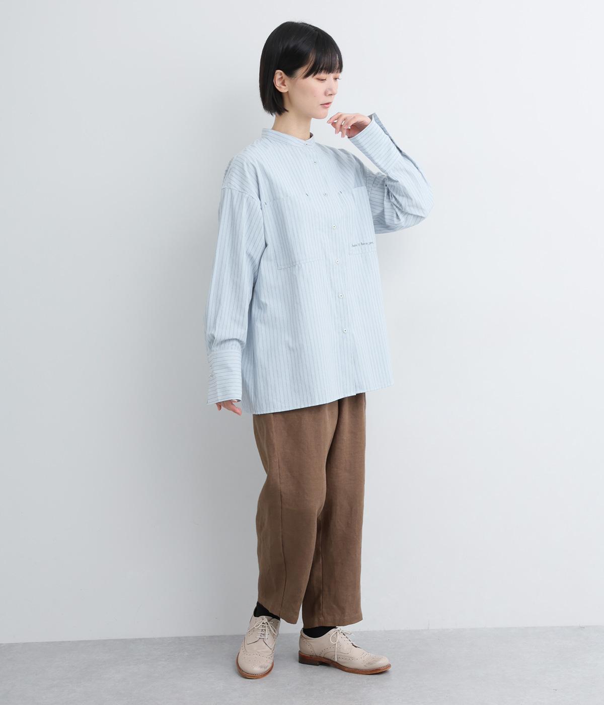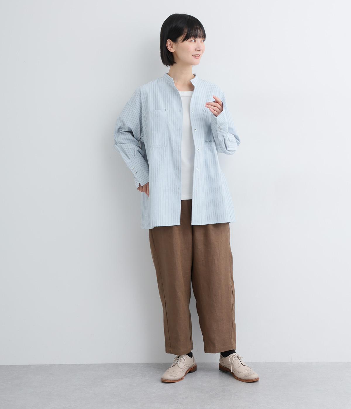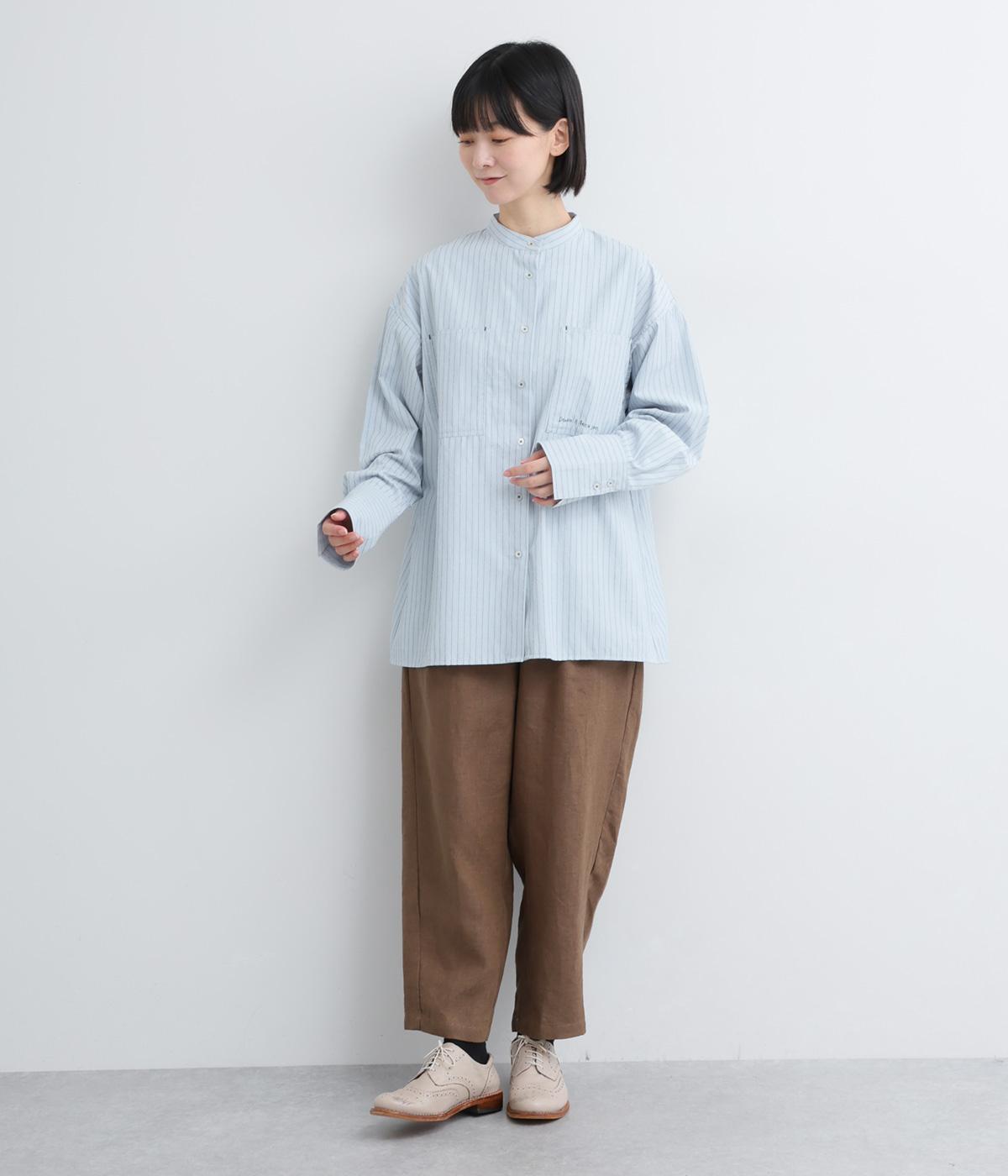胸ポケットと文字刺しゅうをアクセントにしたシャツ。同素材のネッカチーフを首元にさっと巻けばおしゃれムードが高まります。後ろにはタックを入れてシルエットに動きをプラス。袖口につけた長めのカフスは折り返しても素敵です。