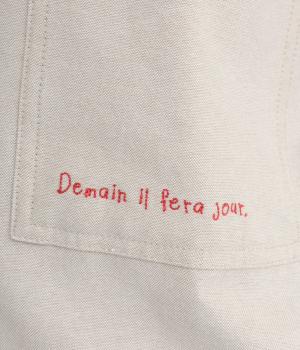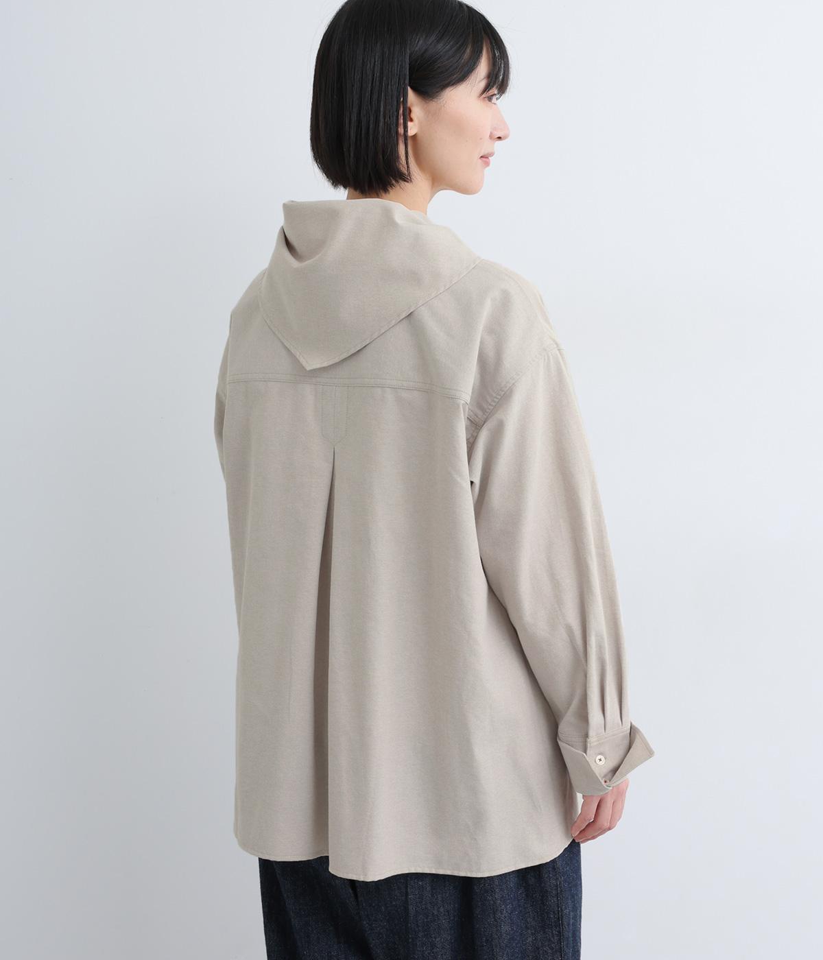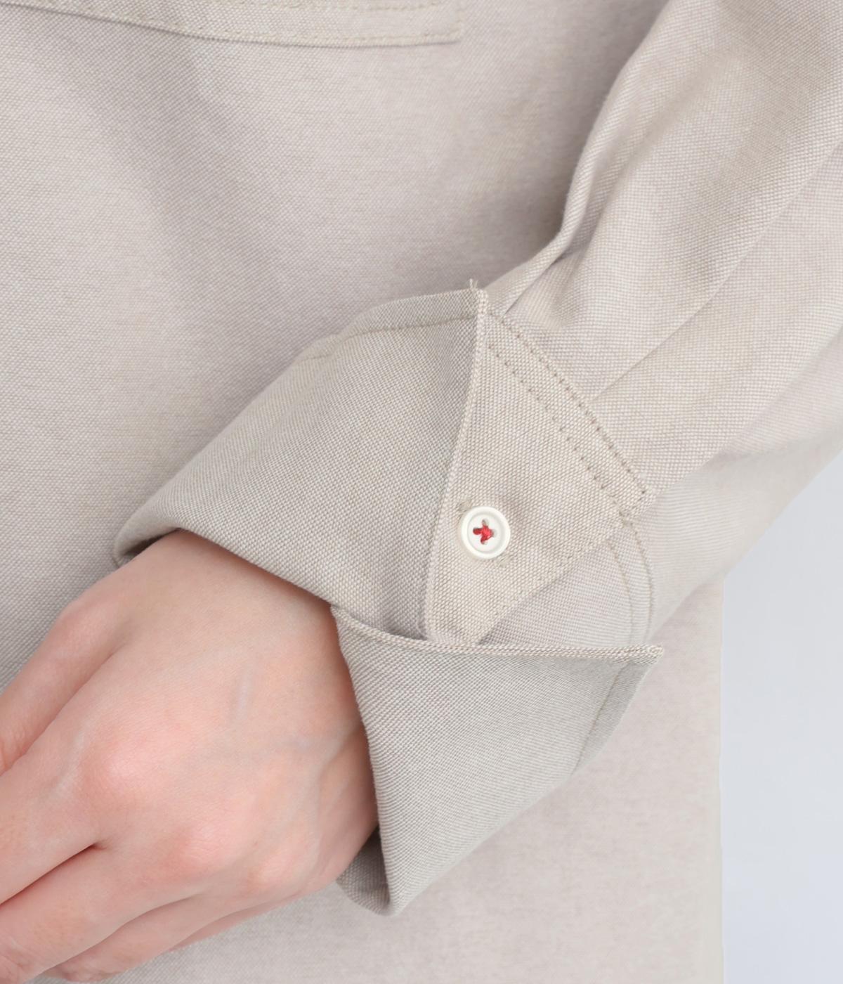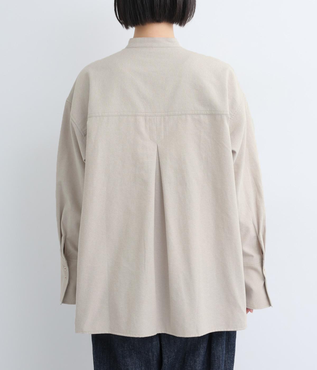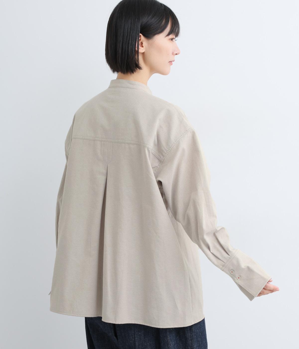 胸ポケットと文字刺しゅうをアクセントにしたシャツ。同素材のネッカチーフを首元にさっと巻けばおしゃれムードが高まります。後ろにはタックを入れてシルエットに動きをプラス。袖口につけた長めのカフスは折り返しても素敵です。