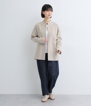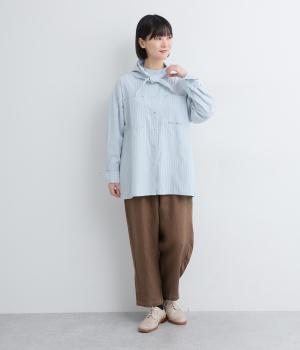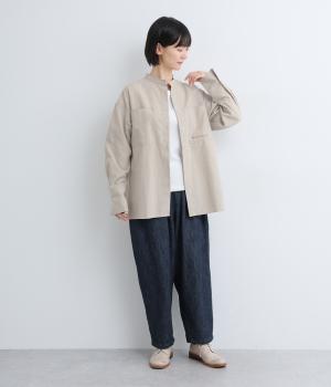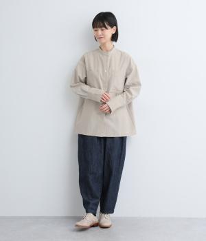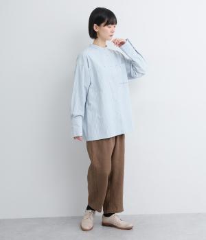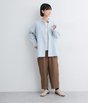 ライトベージュは適度に厚みがあり、コットンならではのナチュラルな風合いが感じられる生地。ストライプは肌にまとわりつかないさらりとした薄手の生地を使用しています。