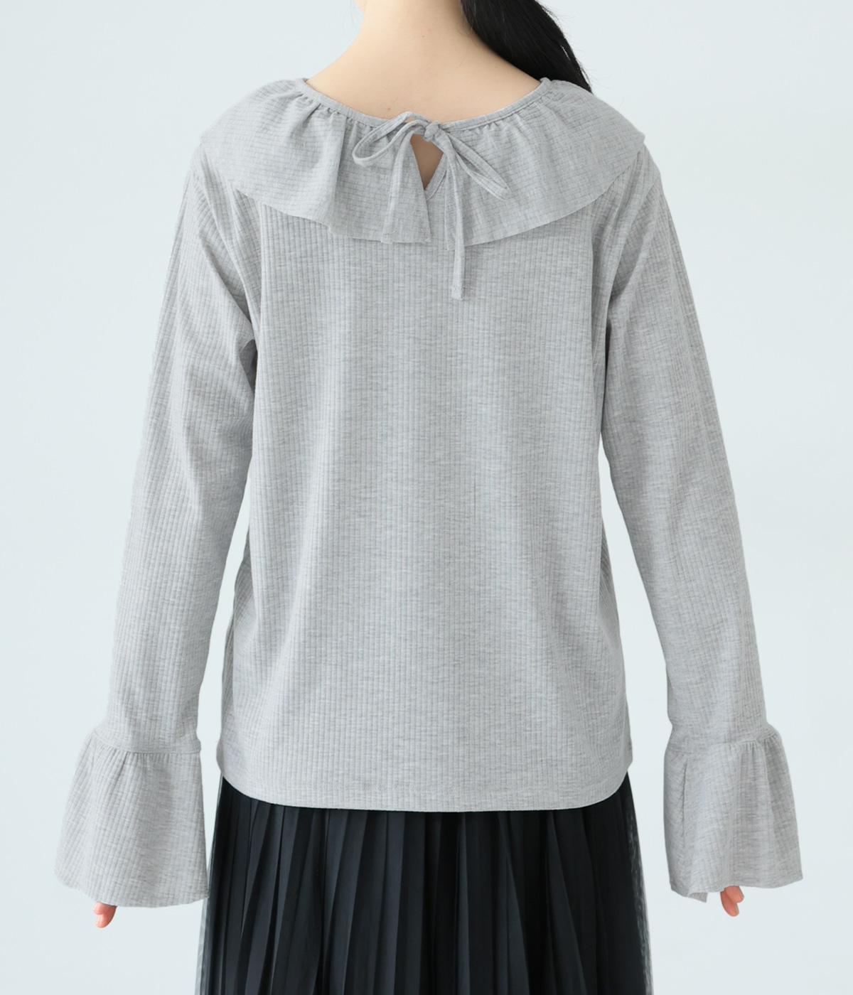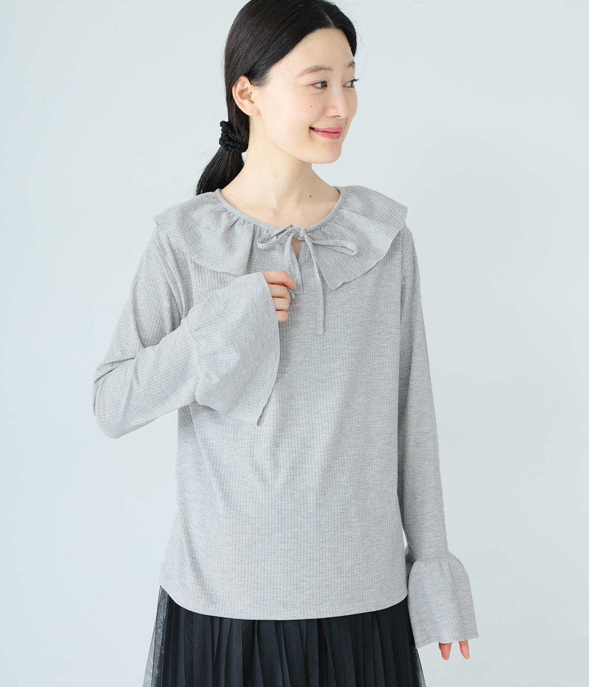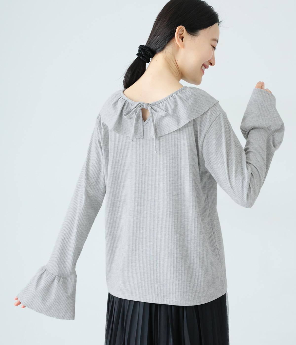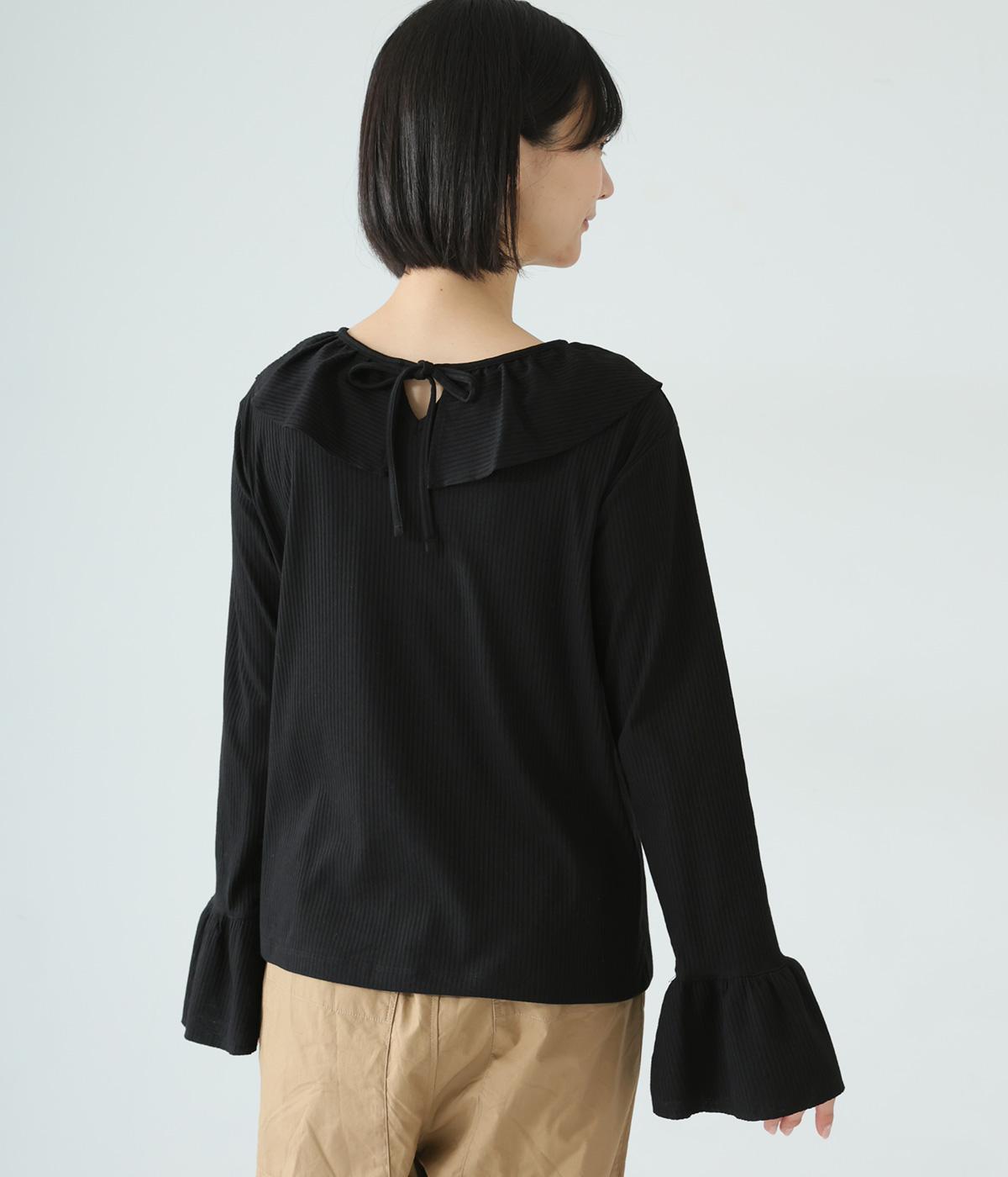 襟元のラッフルカラーとリボンが愛らしいトップス。前後2way仕様で、気分に合わせて着こなしに変化をつけられます。袖口は切り替えとギャザーを入れ、華やかさをアップ。襟や袖のデザインをいかしたレイヤードスタイルもたのしめます。