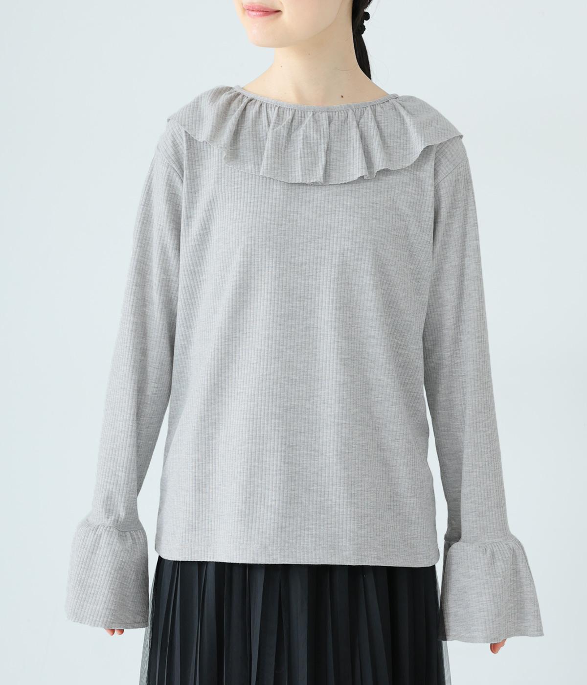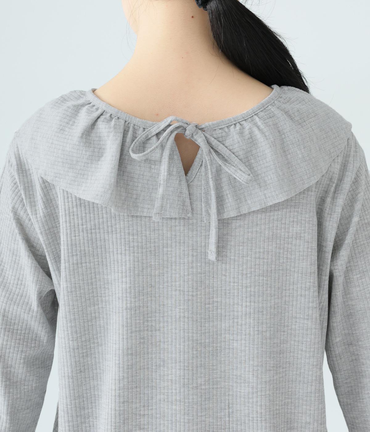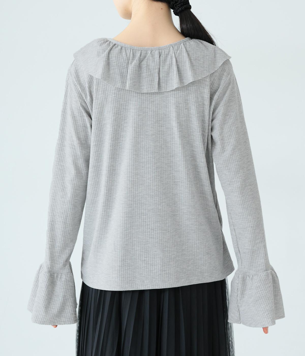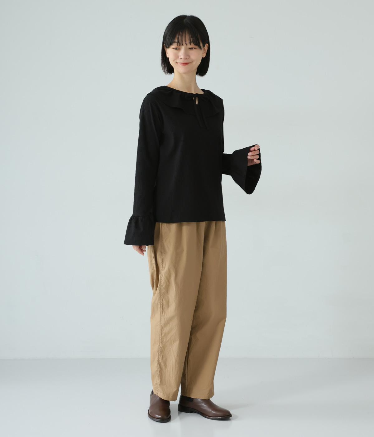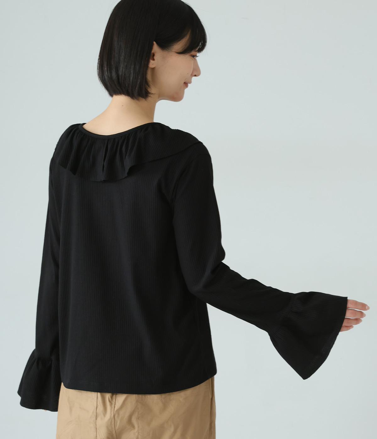襟元のラッフルカラーとリボンが愛らしいトップス。前後2way仕様で、気分に合わせて着こなしに変化をつけられます。袖口は切り替えとギャザーを入れ、華やかさをアップ。襟や袖のデザインをいかしたレイヤードスタイルもたのしめます。